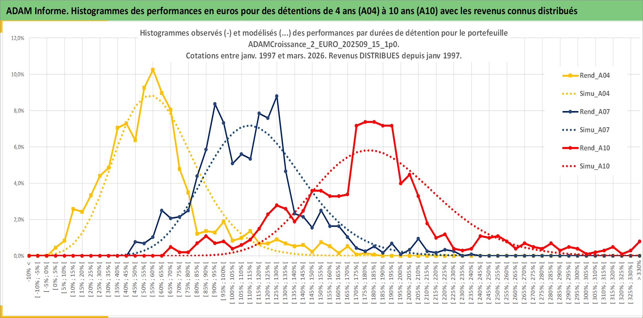Site dédié aux investisseursPage dédiée sur site financeAnalyse des valorisations hebdomadaires du portefeuille ADAMCroissance_2_EURO_202509_15_1p0_8actifs avec un profil P6_PurActions. Ce portefeuille est cote en EUR. Les valorisations couvrent les semaines 1997W01 a 2026W13. Les revenus de cet actif financier sont pris en compte depuis la semaine 1997W01. La note globale ESG de cet actif est estimee a 12.7 (apres rebasage entre 0 et 20).