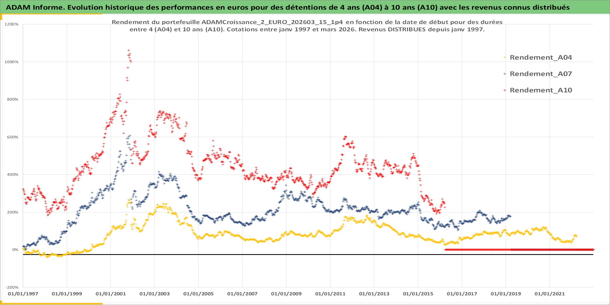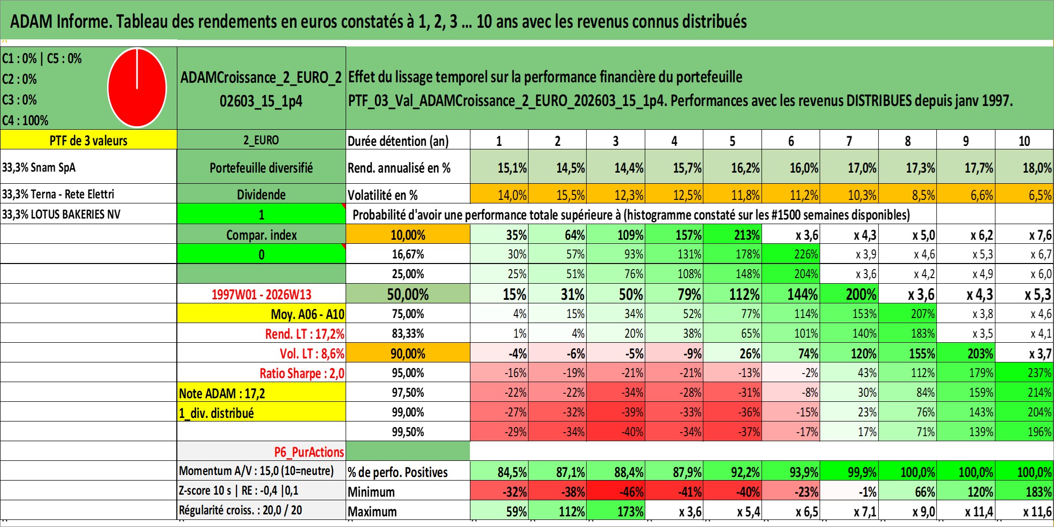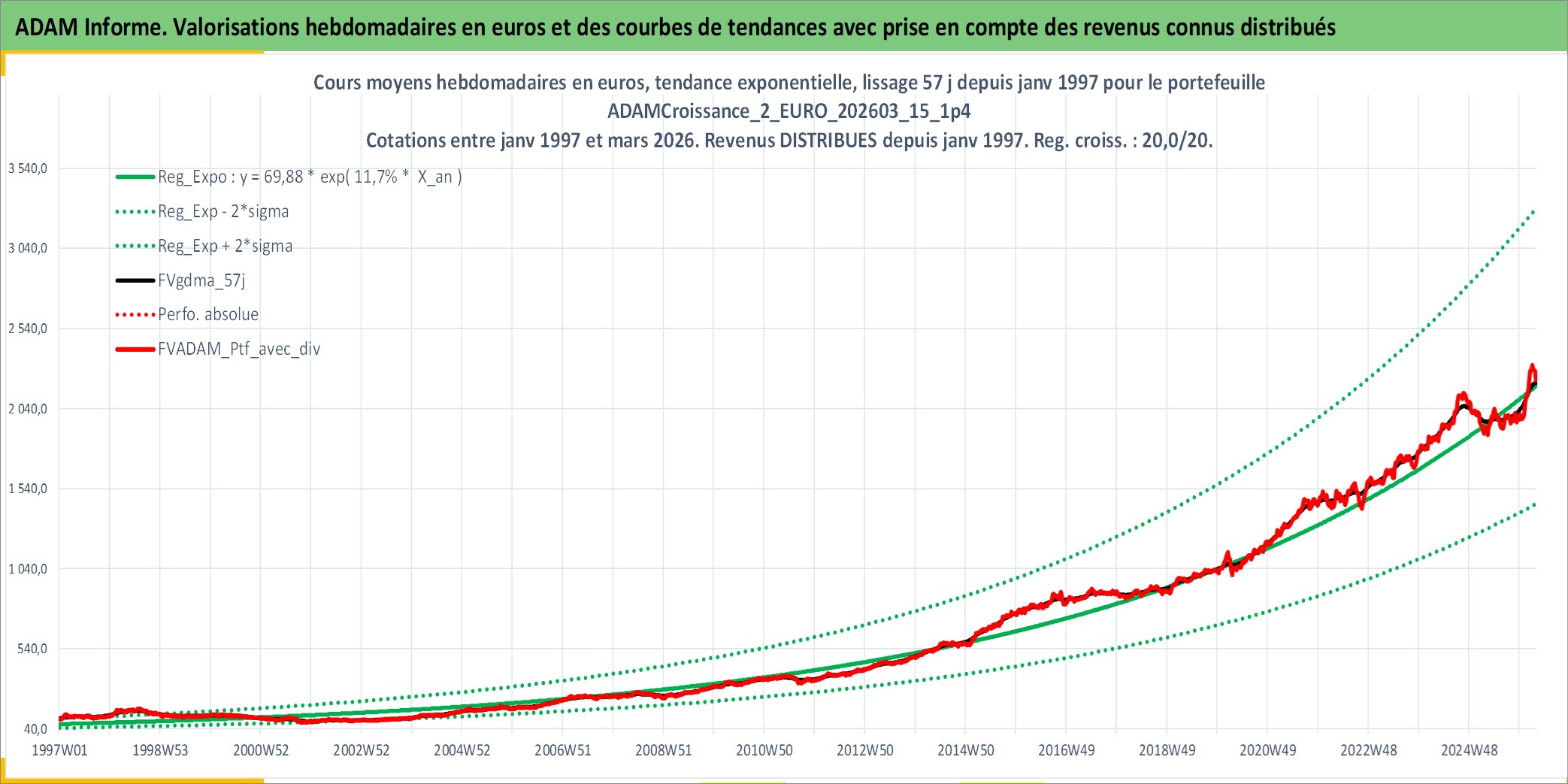 Site dédié aux investisseursPage dédiée sur site financeAnalyse des valorisations hebdomadaires du portefeuille ADAMCroissance_2_EURO_202603_15_1p4_3actifs avec un profil P6_PurActions. Ce portefeuille est cote en EUR. Les valorisations couvrent les semaines 1997W01 a 2026W13. Les revenus de cet actif financier sont pris en compte depuis la semaine 1997W01. La note globale ESG de cet actif est estimee a 15.5 (apres rebasage entre 0 et 20).