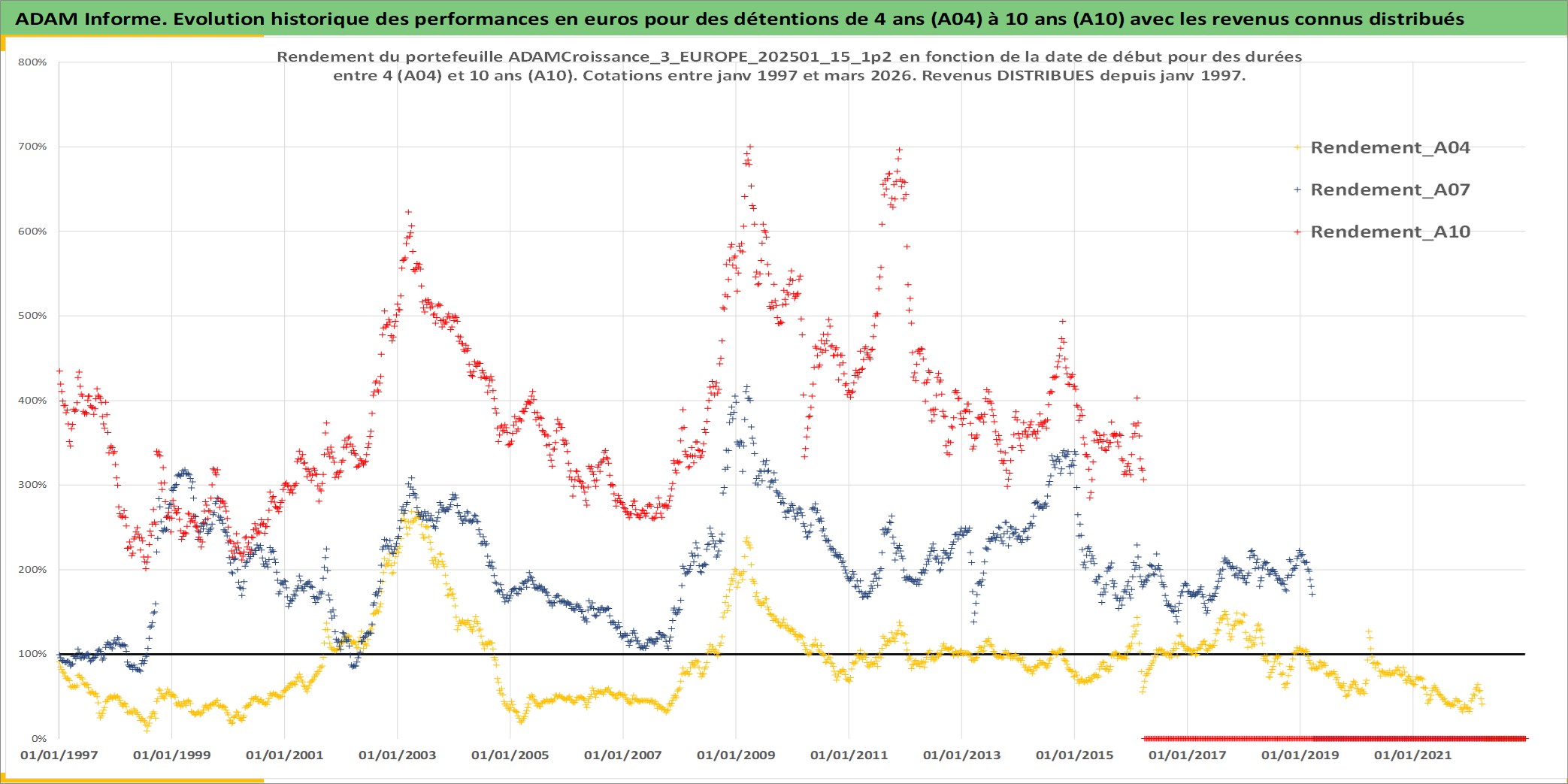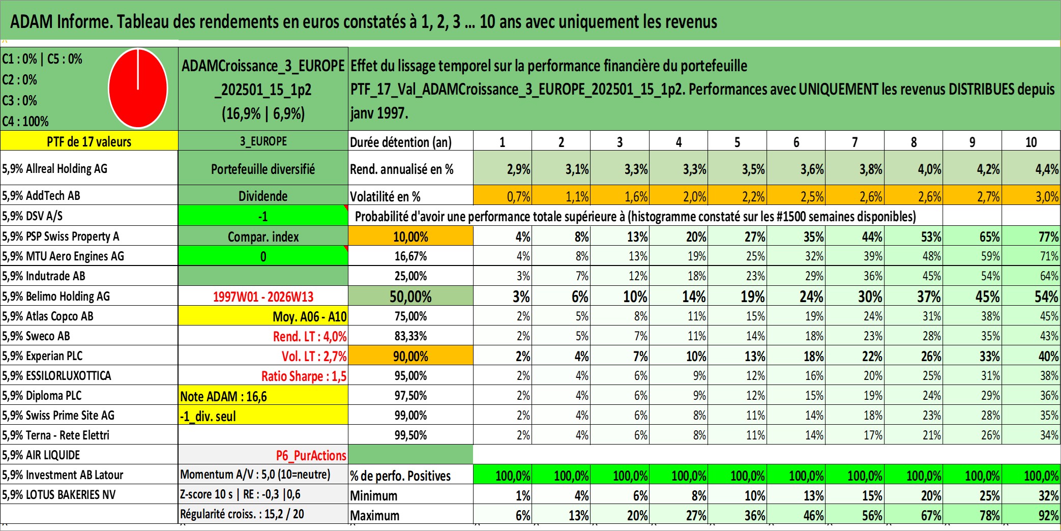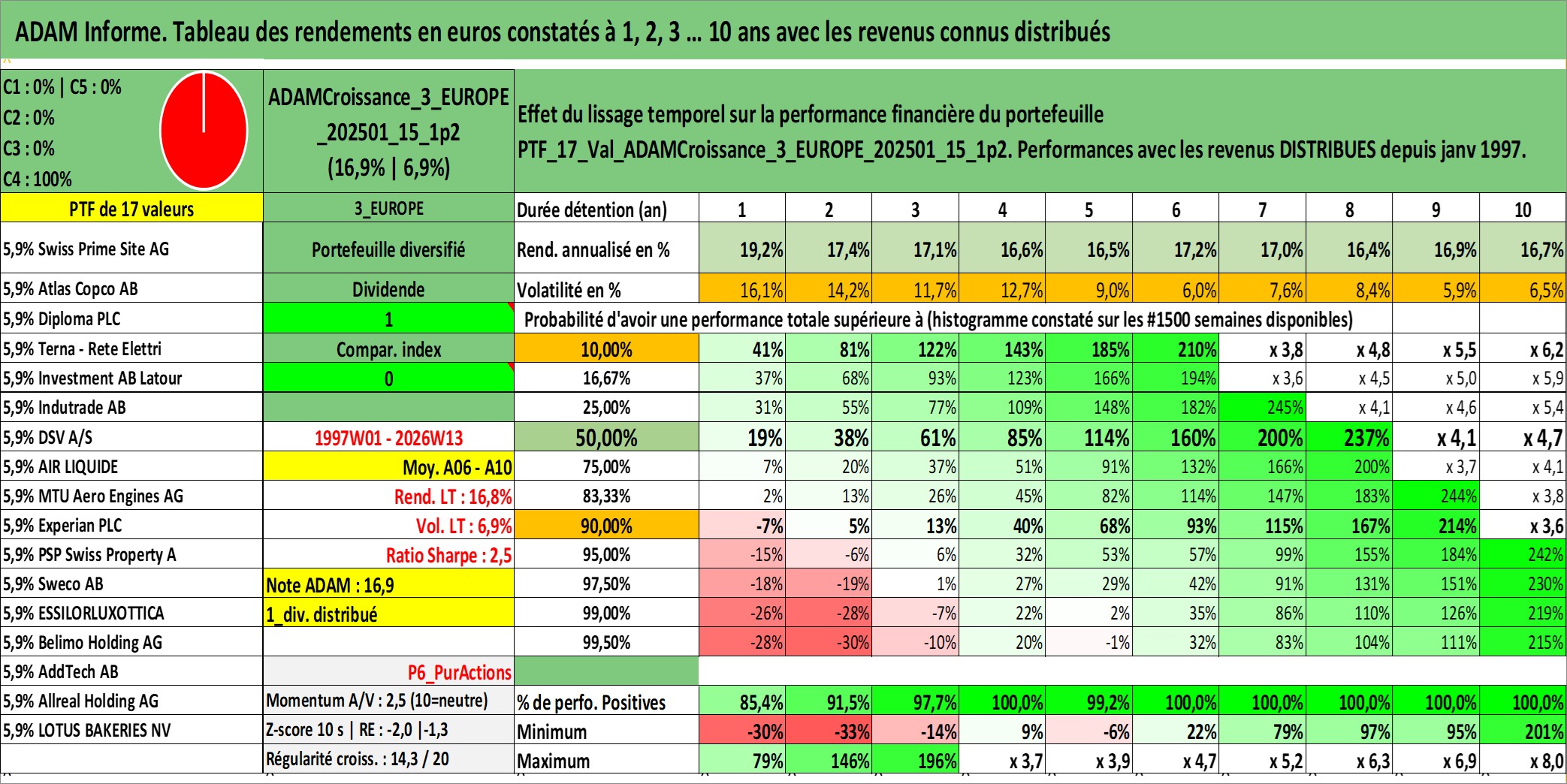 Site dédié aux investisseursPage dédiée sur site financeAnalyse des valorisations hebdomadaires du portefeuille ADAMCroissance_3_EUROPE_202501_15_1p2_17actifs avec un profil P6_PurActions. Ce portefeuille est cote en EUR. Les valorisations couvrent les semaines 1997W01 a 2026W13. Les revenus de cet actif financier sont pris en compte depuis la semaine 1997W01. La note globale ESG de cet actif est estimee a 13.0 (apres rebasage entre 0 et 20).