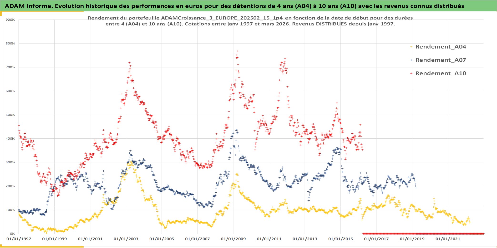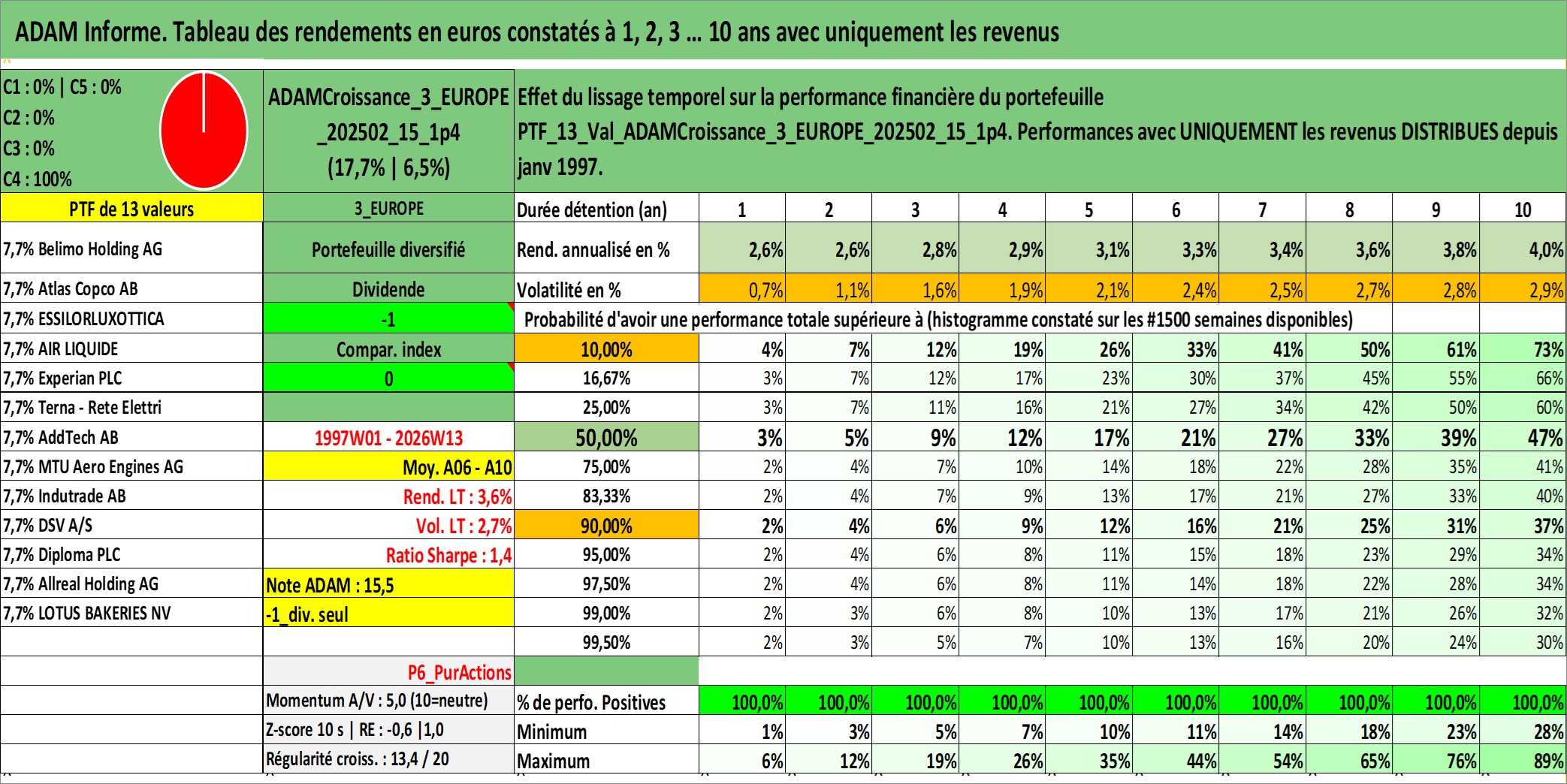 Site dédié aux investisseursPage dédiée sur site financeAnalyse des valorisations hebdomadaires du portefeuille ADAMCroissance_3_EUROPE_202502_15_1p4_13actifs avec un profil P6_PurActions. Ce portefeuille est cote en EUR. Les valorisations couvrent les semaines 1997W01 a 2026W13. Les revenus de cet actif financier sont pris en compte depuis la semaine 1997W01. La note globale ESG de cet actif est estimee a 12.7 (apres rebasage entre 0 et 20).