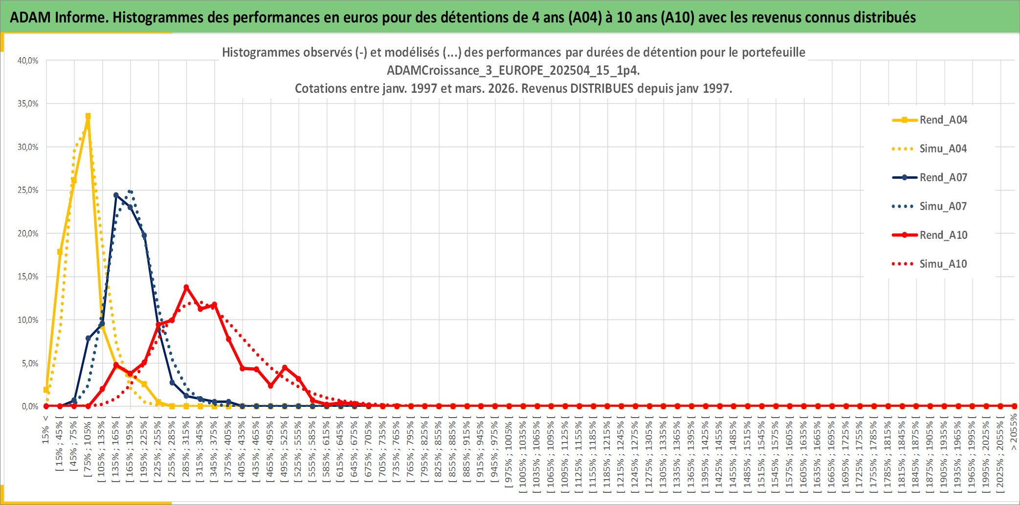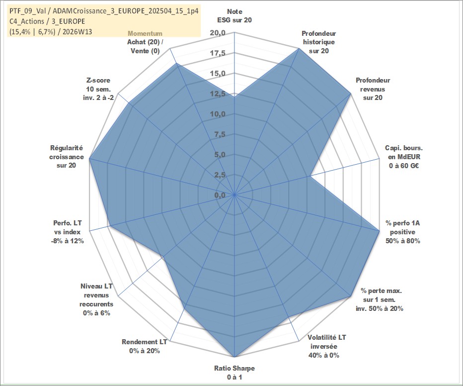 Site dédié aux investisseursPage dédiée sur site financeAnalyse des valorisations hebdomadaires du portefeuille ADAMCroissance_3_EUROPE_202504_15_1p4_9actifs avec un profil P6_PurActions. Ce portefeuille est cote en EUR. Les valorisations couvrent les semaines 1997W01 a 2026W13. Les revenus de cet actif financier sont pris en compte depuis la semaine 1997W01. La note globale ESG de cet actif est estimee a 12.0 (apres rebasage entre 0 et 20).
