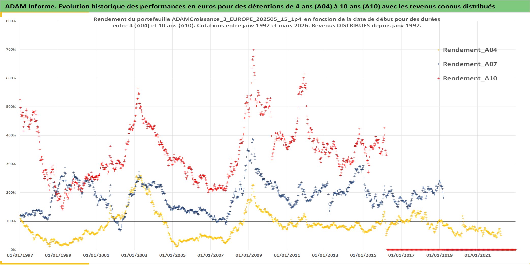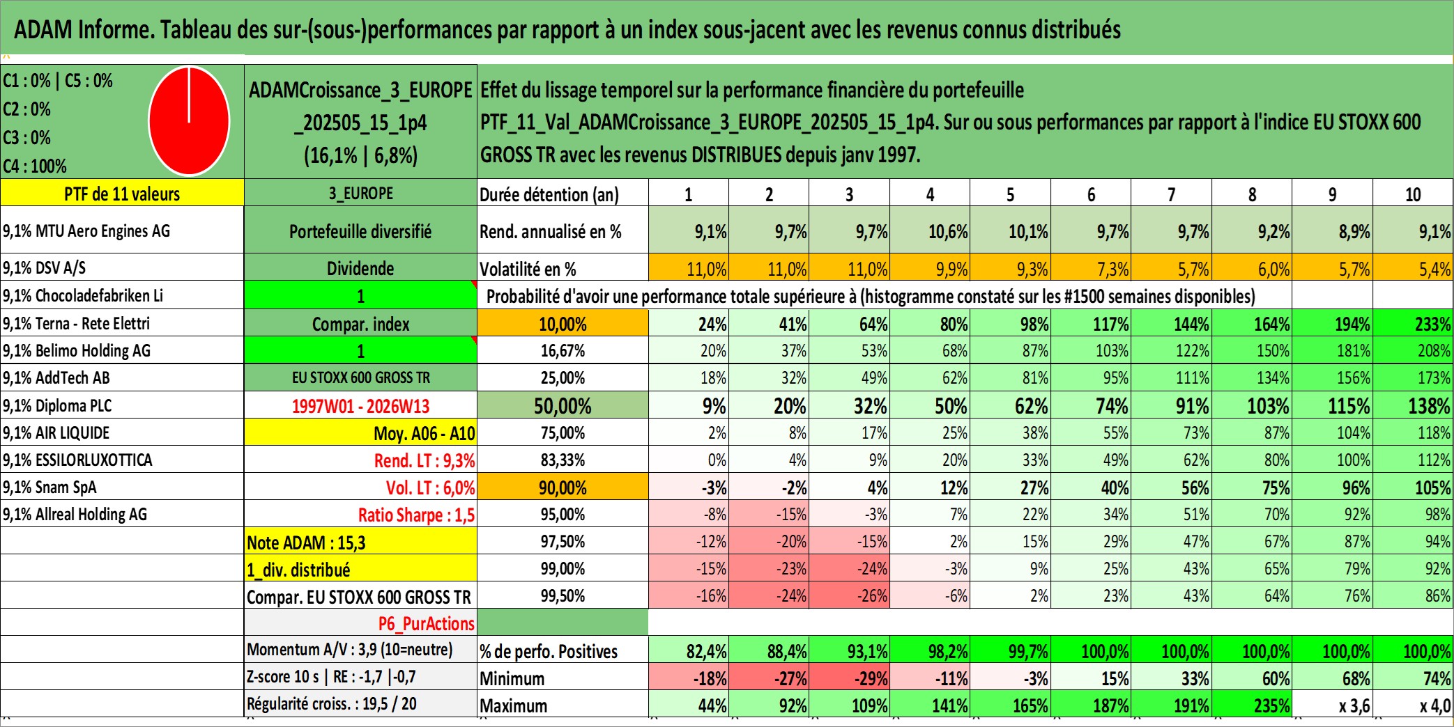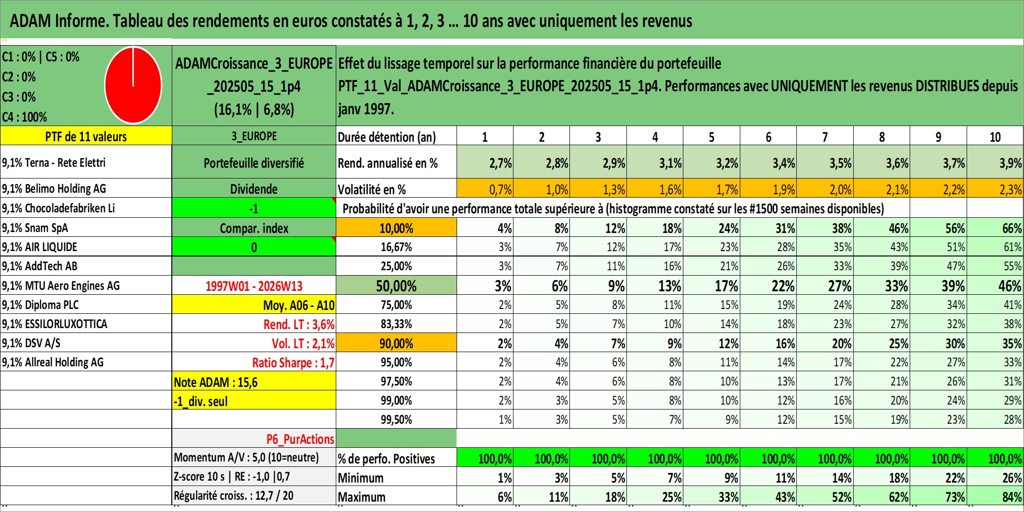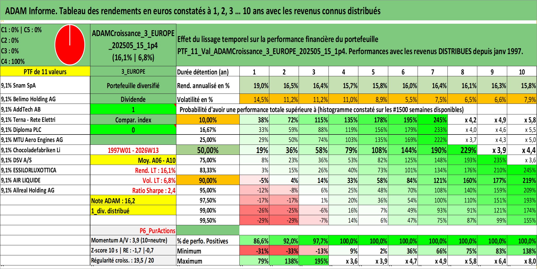 Site dédié aux investisseursPage dédiée sur site financeAnalyse des valorisations hebdomadaires du portefeuille ADAMCroissance_3_EUROPE_202505_15_1p4_11actifs avec un profil P6_PurActions. Ce portefeuille est cote en EUR. Les valorisations couvrent les semaines 1997W01 a 2026W13. Les revenus de cet actif financier sont pris en compte depuis la semaine 1997W01. La note globale ESG de cet actif est estimee a 12.5 (apres rebasage entre 0 et 20).