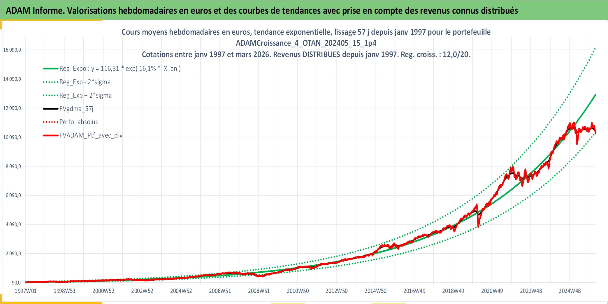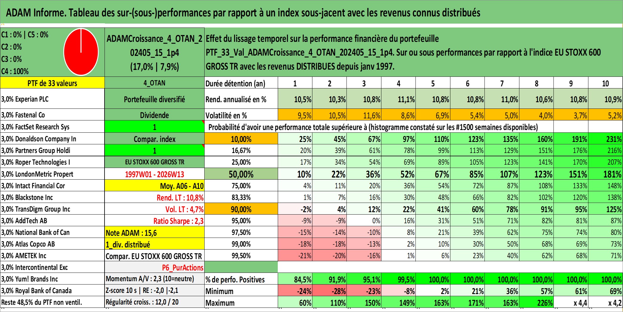 Site dédié aux investisseursPage dédiée sur site financeAnalyse des valorisations hebdomadaires du portefeuille ADAMCroissance_4_OTAN_202405_15_1p4_33actifs avec un profil P6_PurActions. Ce portefeuille est cote en EUR. Les valorisations couvrent les semaines 1997W01 a 2026W13. Les revenus de cet actif financier sont pris en compte depuis la semaine 1997W01. La note globale ESG de cet actif est estimee a 10.4 (apres rebasage entre 0 et 20).