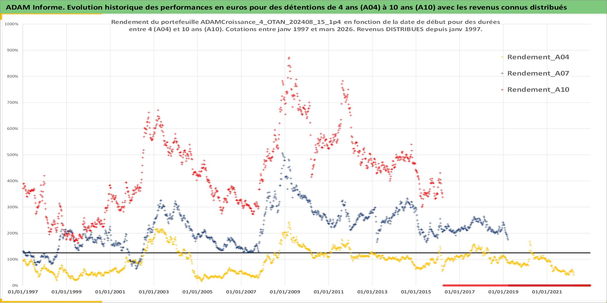 Site dédié aux investisseursPage dédiée sur site financeAnalyse des valorisations hebdomadaires du portefeuille ADAMCroissance_4_OTAN_202408_15_1p4_42actifs avec un profil P6_PurActions. Ce portefeuille est cote en EUR. Les valorisations couvrent les semaines 1997W01 a 2026W13. Les revenus de cet actif financier sont pris en compte depuis la semaine 1997W01. La note globale ESG de cet actif est estimee a 10.6 (apres rebasage entre 0 et 20).