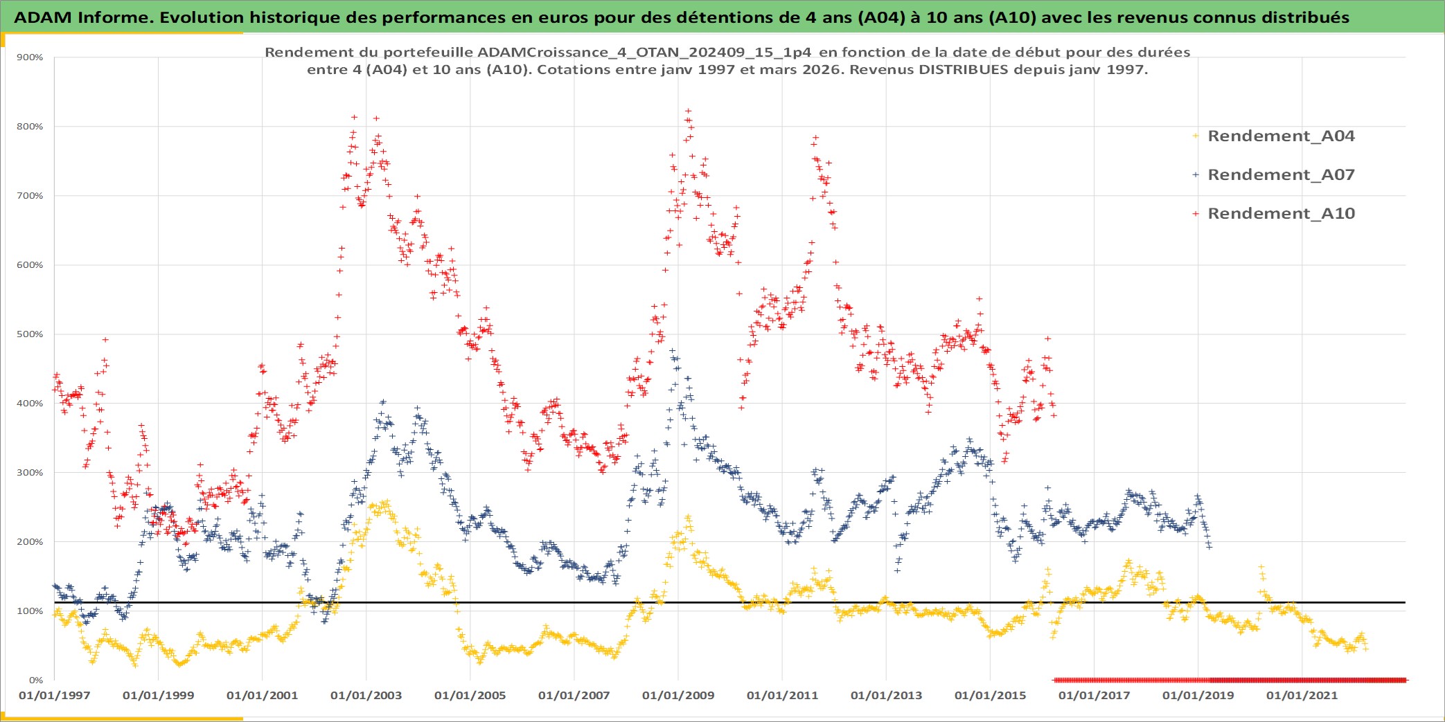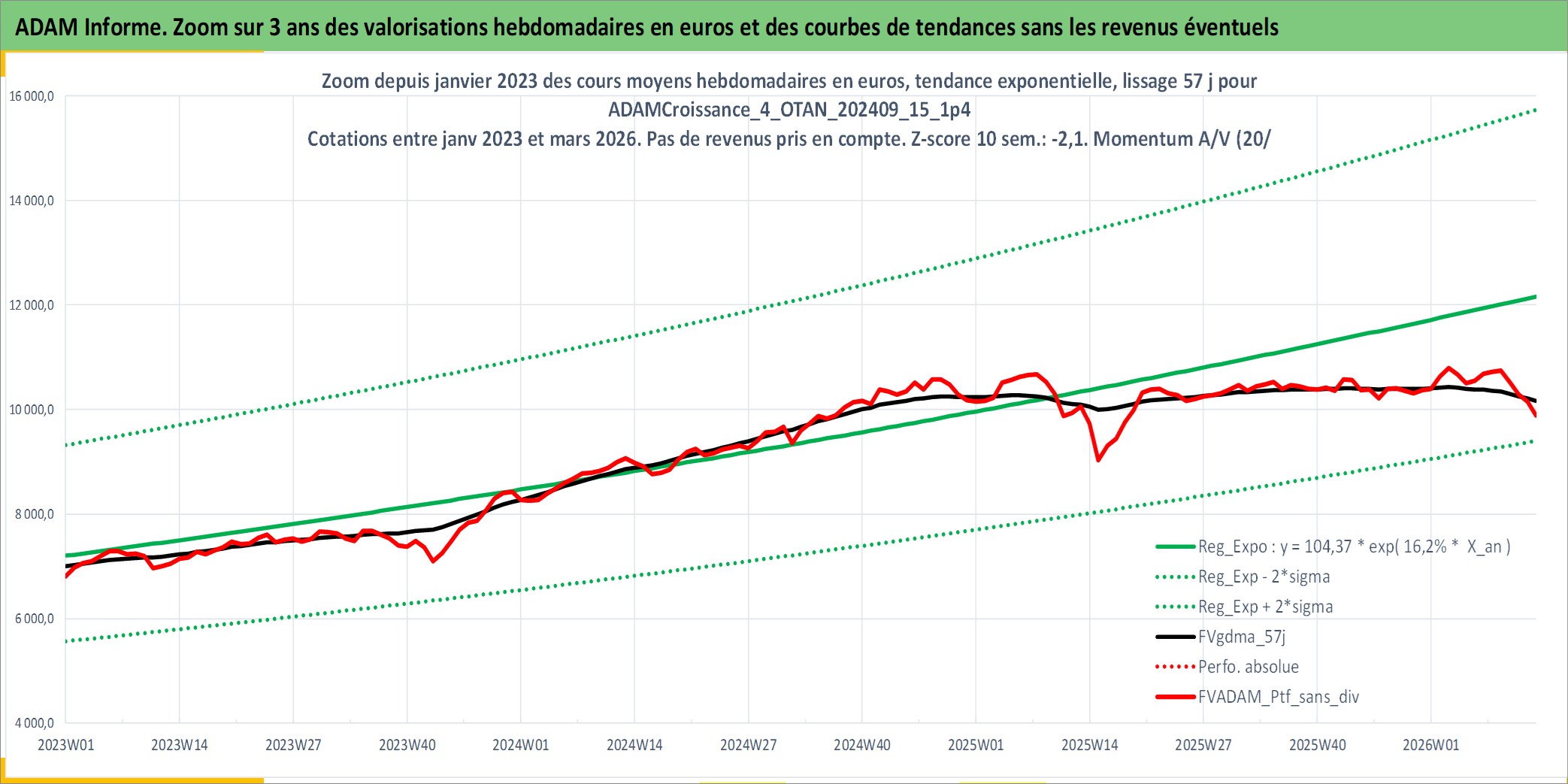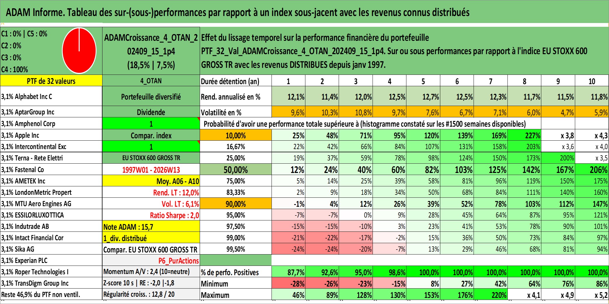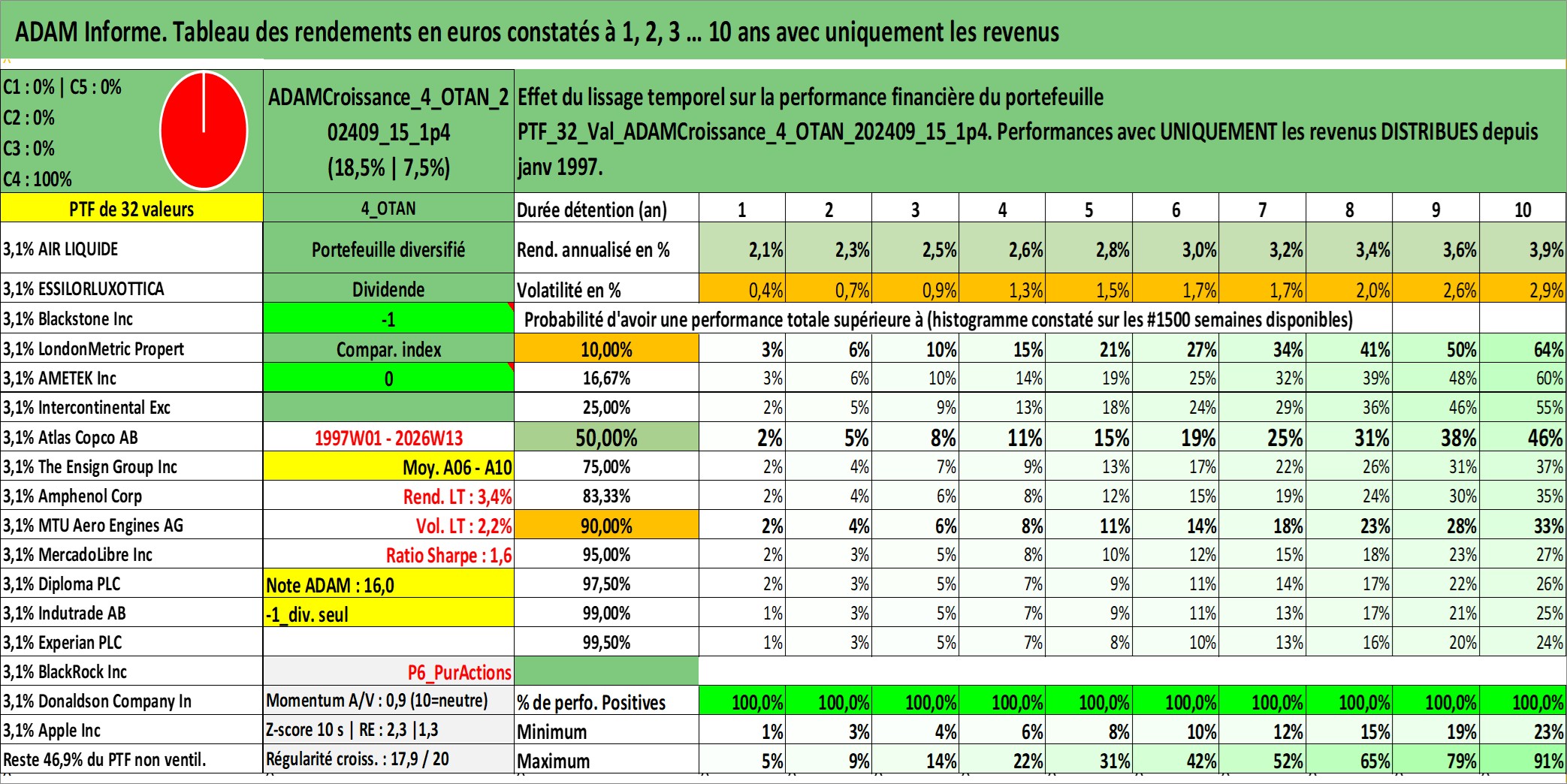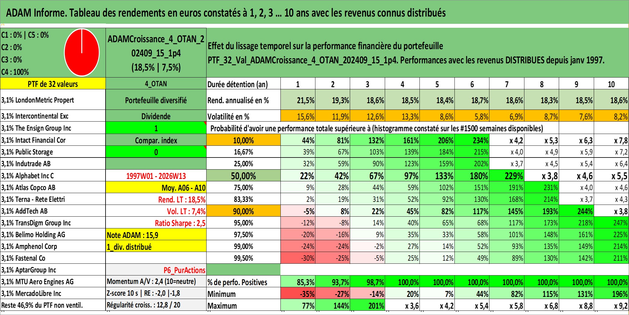 Site dédié aux investisseursPage dédiée sur site financeAnalyse des valorisations hebdomadaires du portefeuille ADAMCroissance_4_OTAN_202409_15_1p4_32actifs avec un profil P6_PurActions. Ce portefeuille est cote en EUR. Les valorisations couvrent les semaines 1997W01 a 2026W13. Les revenus de cet actif financier sont pris en compte depuis la semaine 1997W01. La note globale ESG de cet actif est estimee a 10.3 (apres rebasage entre 0 et 20).