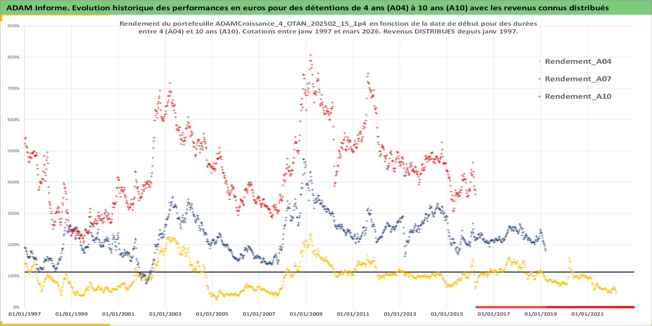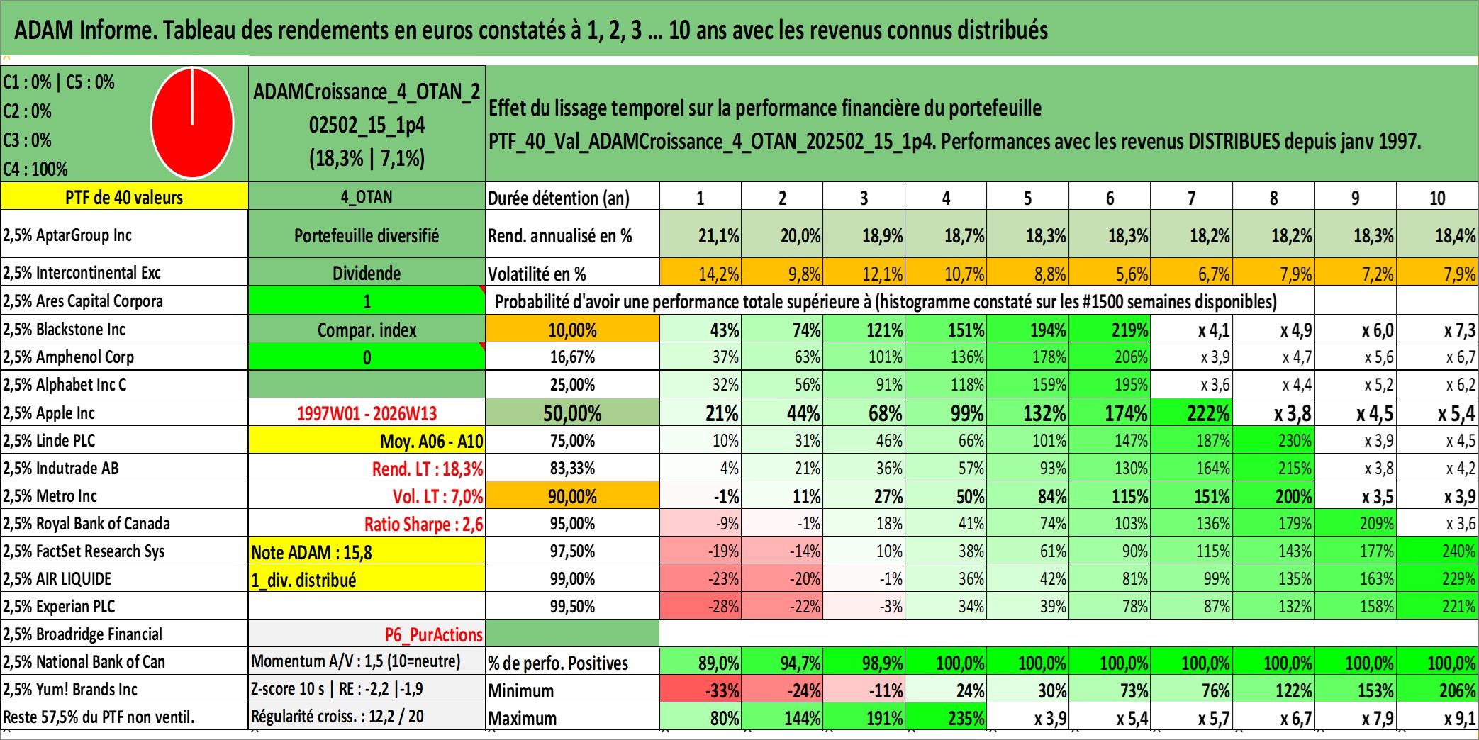 Site dédié aux investisseursPage dédiée sur site financeAnalyse des valorisations hebdomadaires du portefeuille ADAMCroissance_4_OTAN_202502_15_1p4_40actifs avec un profil P6_PurActions. Ce portefeuille est cote en EUR. Les valorisations couvrent les semaines 1997W01 a 2026W13. Les revenus de cet actif financier sont pris en compte depuis la semaine 1997W01. La note globale ESG de cet actif est estimee a 10.7 (apres rebasage entre 0 et 20).