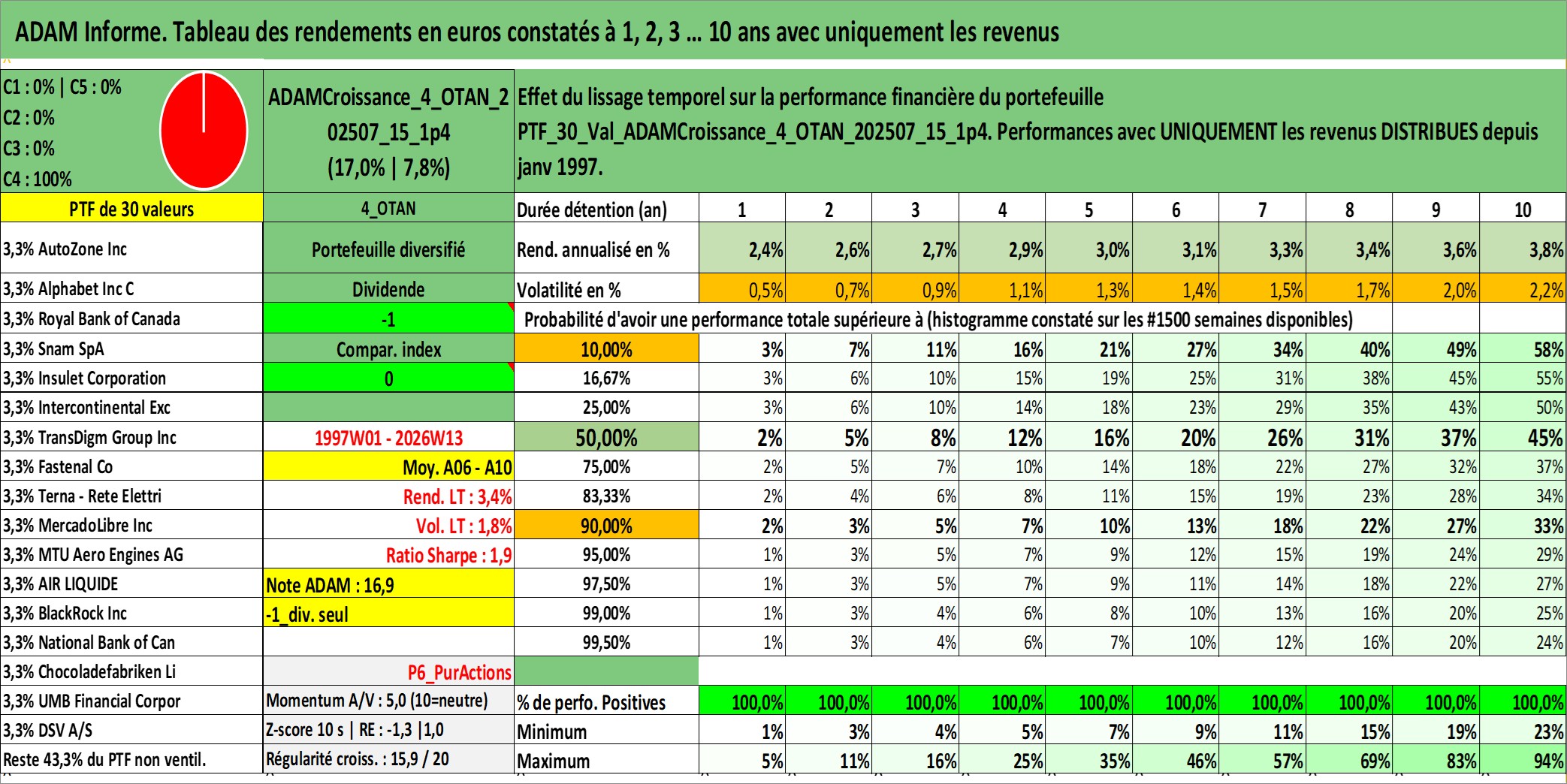 Site dédié aux investisseursPage dédiée sur site financeAnalyse des valorisations hebdomadaires du portefeuille ADAMCroissance_4_OTAN_202507_15_1p4_30actifs avec un profil P6_PurActions. Ce portefeuille est cote en EUR. Les valorisations couvrent les semaines 1997W01 a 2026W13. Les revenus de cet actif financier sont pris en compte depuis la semaine 1997W01. La note globale ESG de cet actif est estimee a 10.9 (apres rebasage entre 0 et 20).