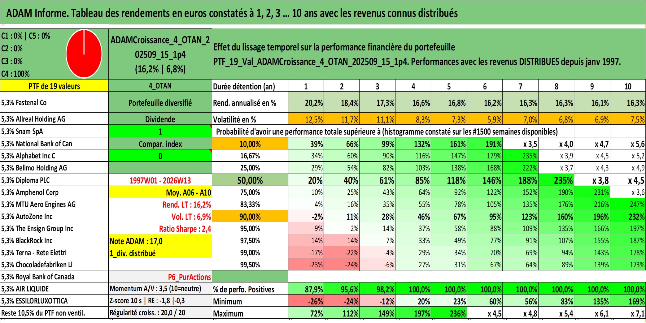 Site dédié aux investisseursPage dédiée sur site financeAnalyse des valorisations hebdomadaires du portefeuille ADAMCroissance_4_OTAN_202509_15_1p4_19actifs avec un profil P6_PurActions. Ce portefeuille est cote en EUR. Les valorisations couvrent les semaines 1997W01 a 2026W13. Les revenus de cet actif financier sont pris en compte depuis la semaine 1997W01. La note globale ESG de cet actif est estimee a 12.2 (apres rebasage entre 0 et 20).