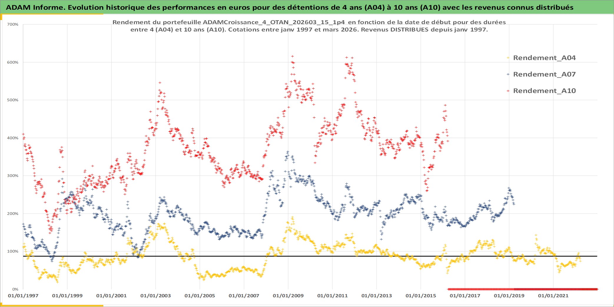 Site dédié aux investisseursPage dédiée sur site financeAnalyse des valorisations hebdomadaires du portefeuille ADAMCroissance_4_OTAN_202603_15_1p4_16actifs avec un profil P6_PurActions. Ce portefeuille est cote en EUR. Les valorisations couvrent les semaines 1997W01 a 2026W13. Les revenus de cet actif financier sont pris en compte depuis la semaine 1997W01. La note globale ESG de cet actif est estimee a 12.4 (apres rebasage entre 0 et 20).