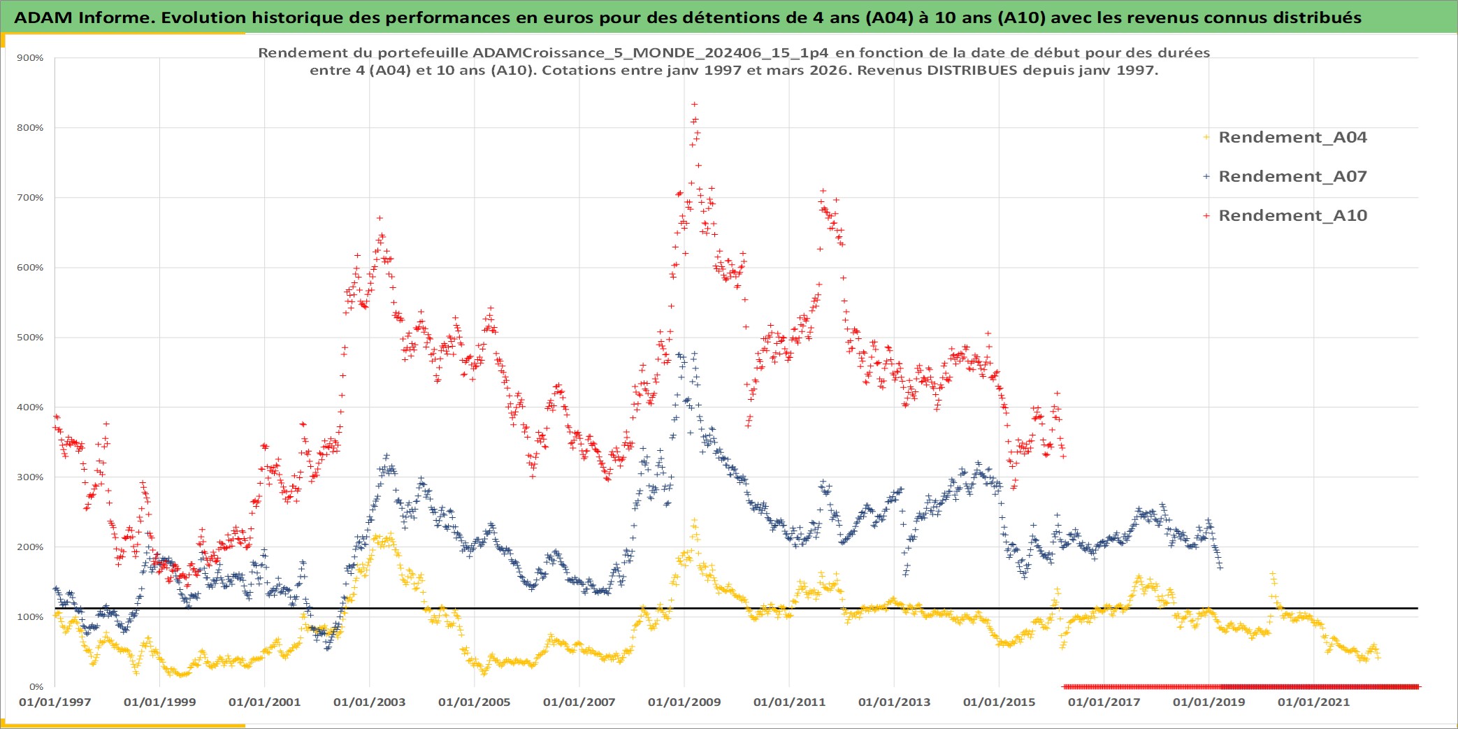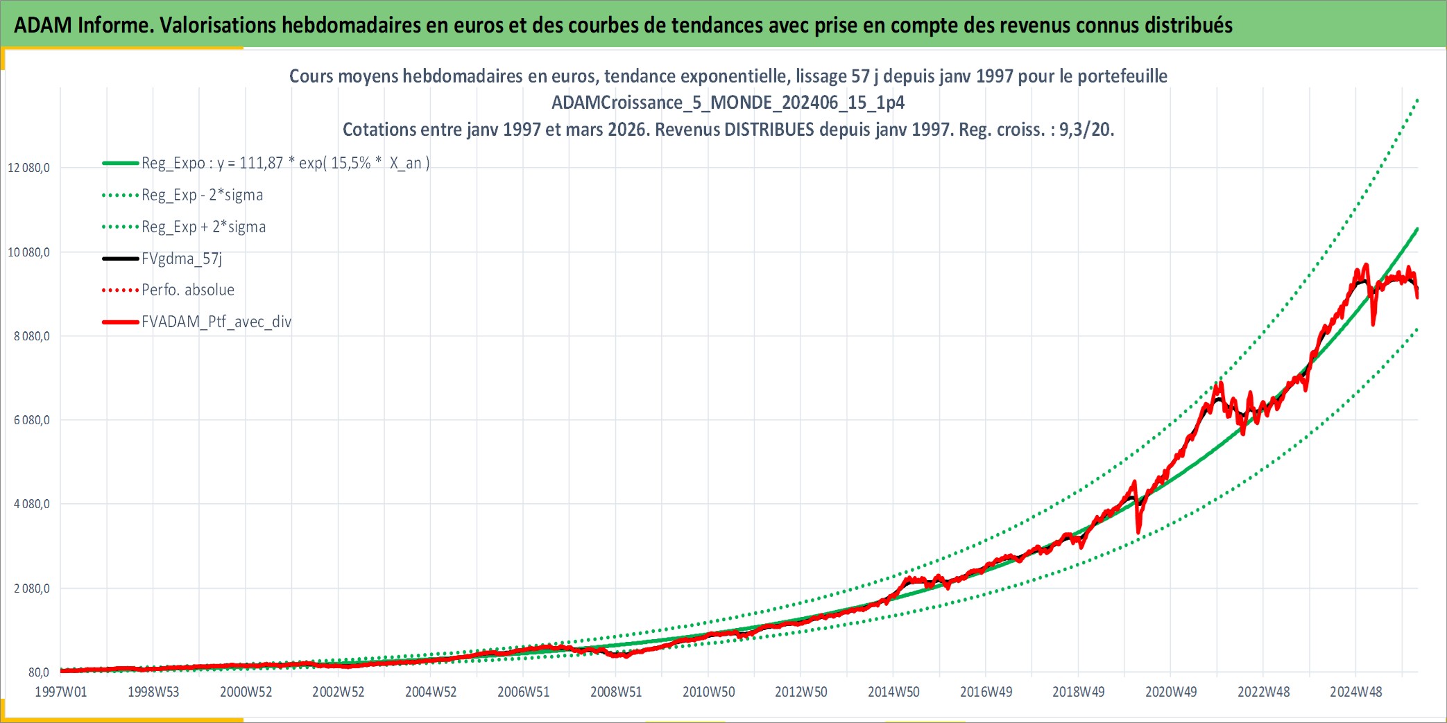 Site dédié aux investisseursPage dédiée sur site financeAnalyse des valorisations hebdomadaires du portefeuille ADAMCroissance_5_MONDE_202406_15_1p4_50actifs avec un profil P6_PurActions. Ce portefeuille est cote en EUR. Les valorisations couvrent les semaines 1997W01 a 2026W13. Les revenus de cet actif financier sont pris en compte depuis la semaine 1997W01. La note globale ESG de cet actif est estimee a 10.8 (apres rebasage entre 0 et 20).
