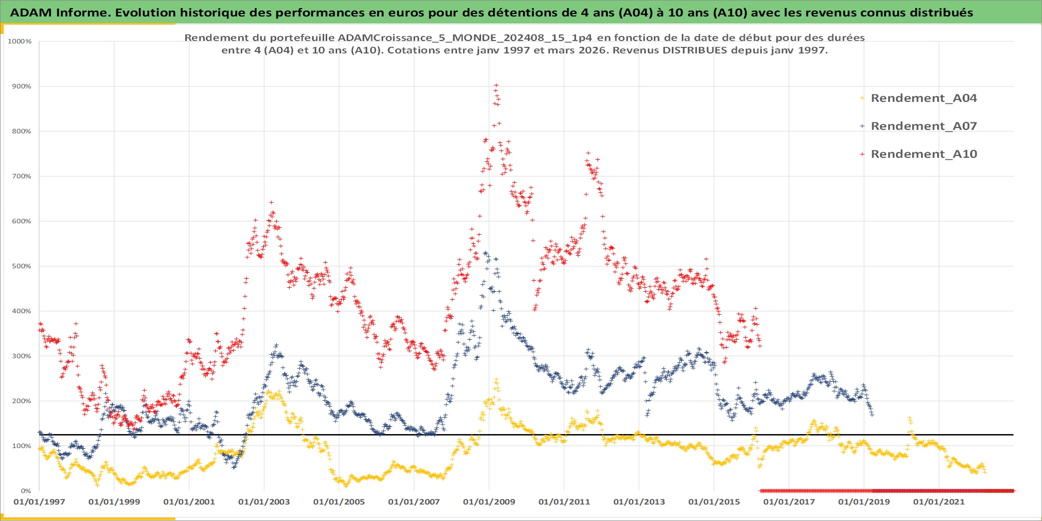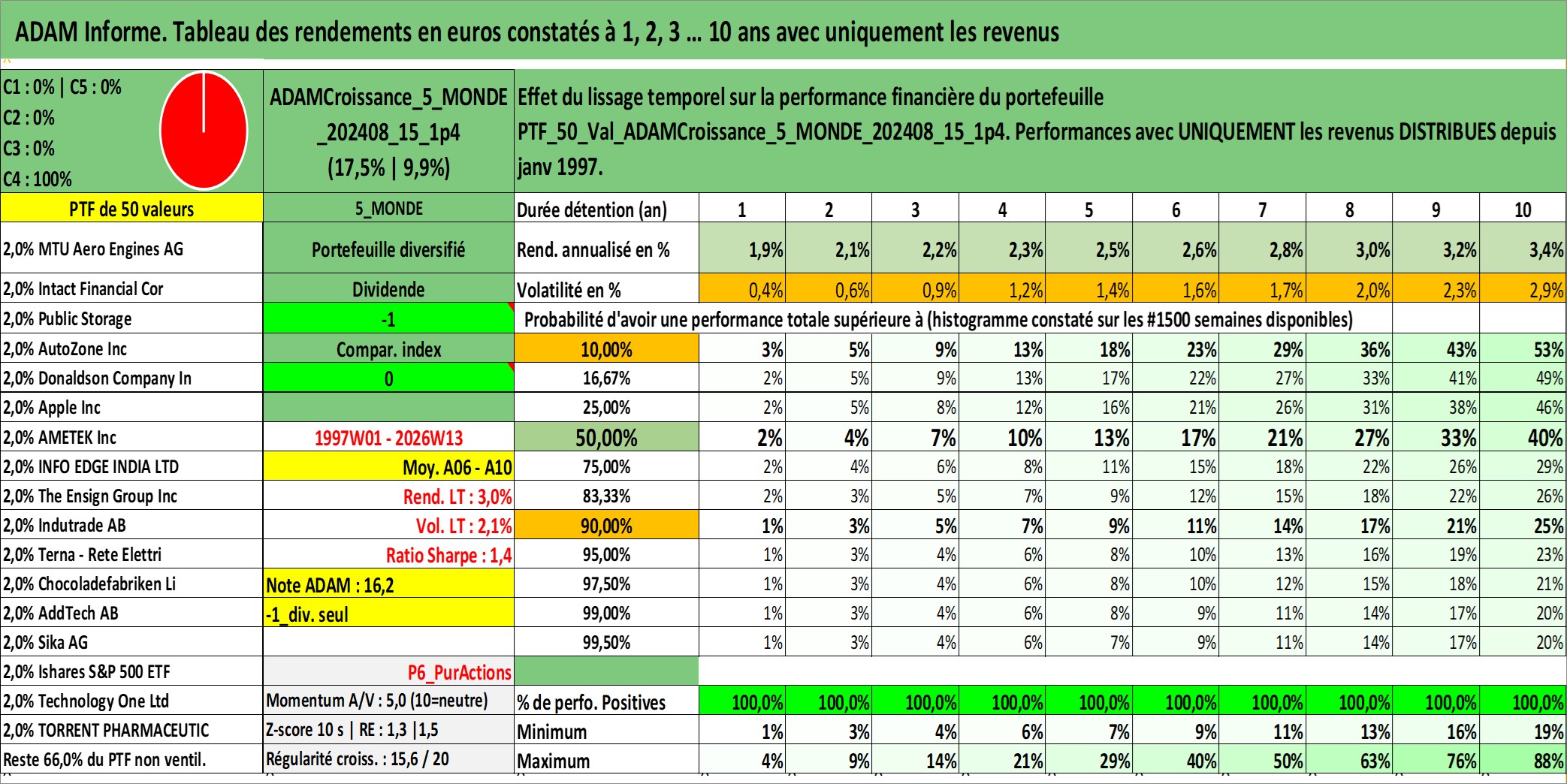 Site dédié aux investisseursPage dédiée sur site financeAnalyse des valorisations hebdomadaires du portefeuille ADAMCroissance_5_MONDE_202408_15_1p4_50actifs avec un profil P6_PurActions. Ce portefeuille est cote en EUR. Les valorisations couvrent les semaines 1997W01 a 2026W13. Les revenus de cet actif financier sont pris en compte depuis la semaine 1997W01. La note globale ESG de cet actif est estimee a 10.7 (apres rebasage entre 0 et 20).