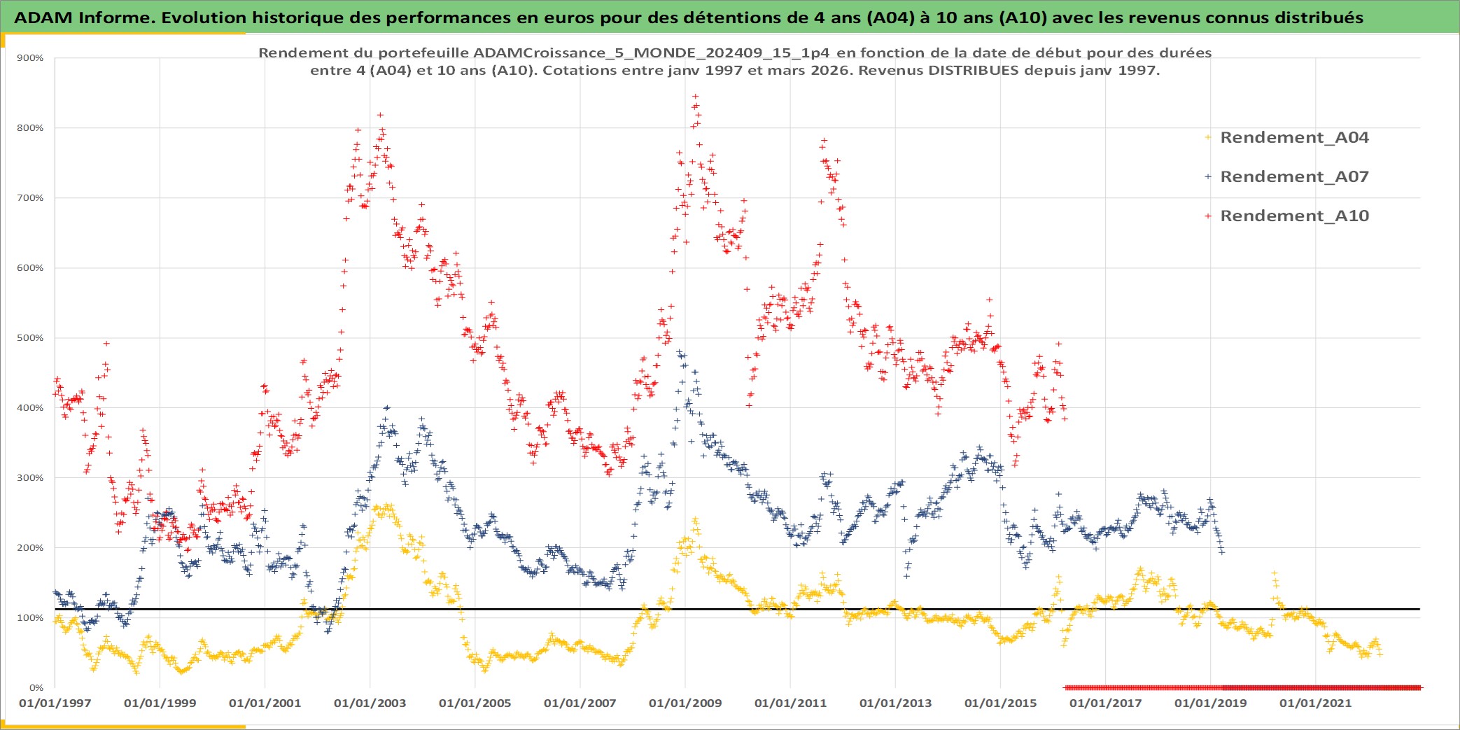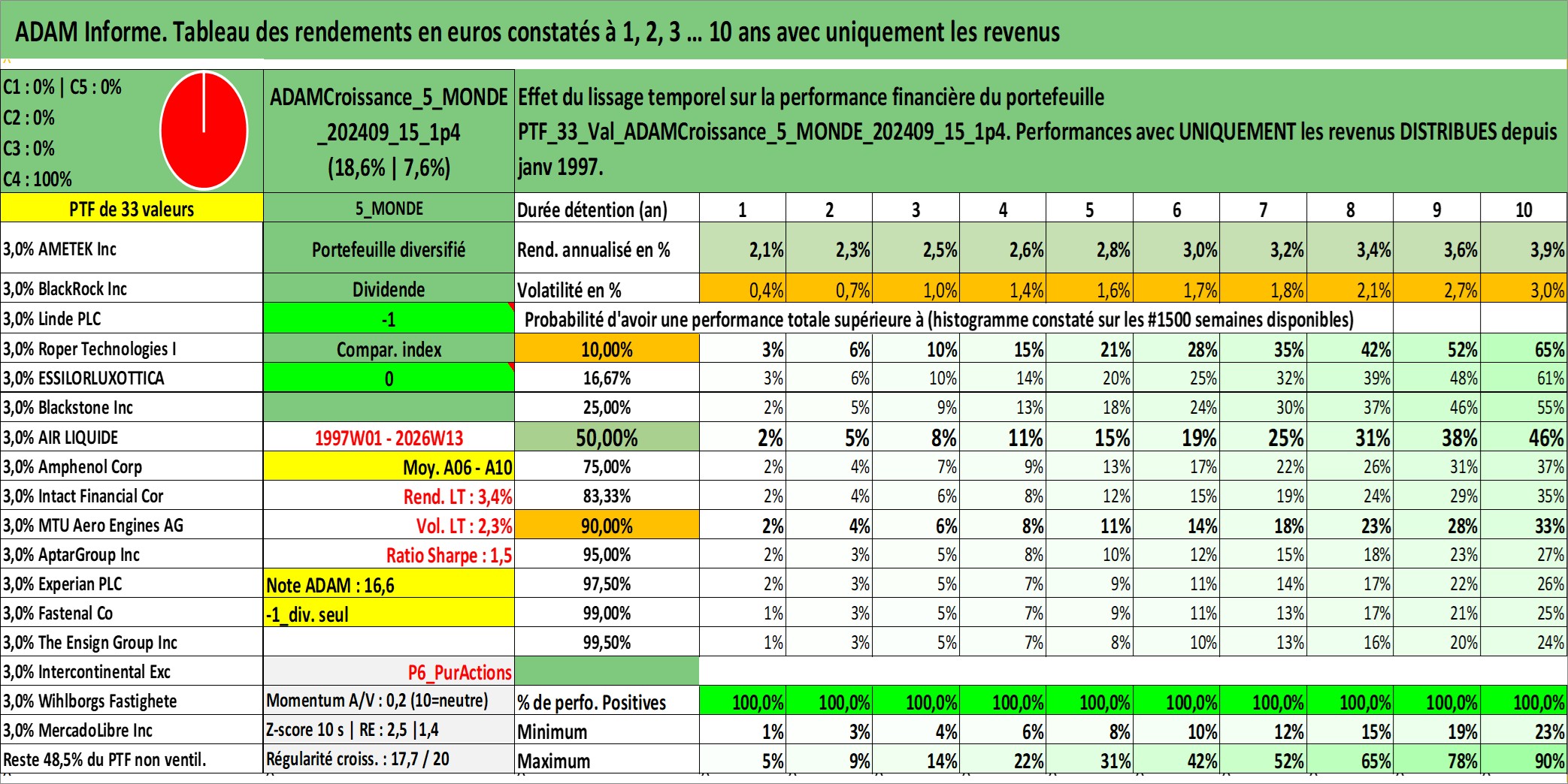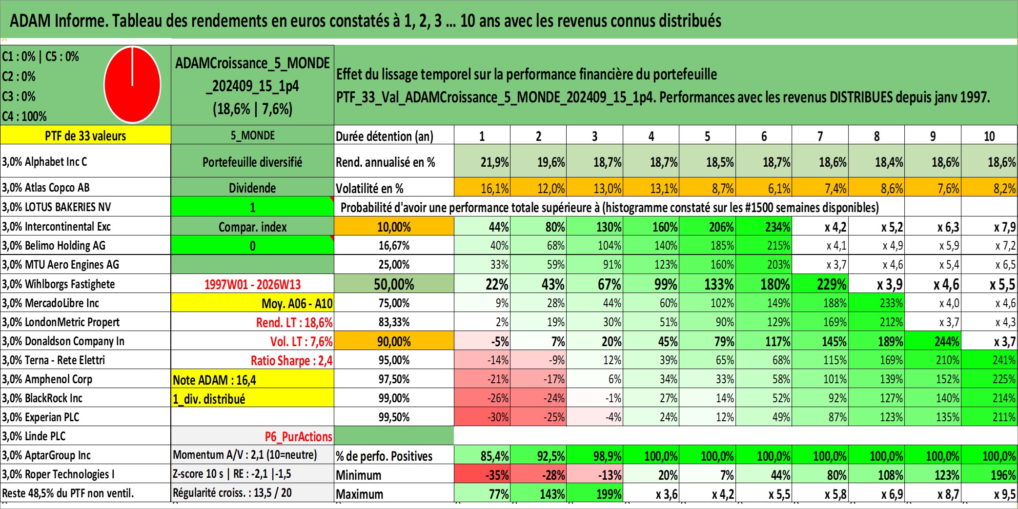 Site dédié aux investisseursPage dédiée sur site financeAnalyse des valorisations hebdomadaires du portefeuille ADAMCroissance_5_MONDE_202409_15_1p4_33actifs avec un profil P6_PurActions. Ce portefeuille est cote en EUR. Les valorisations couvrent les semaines 1997W01 a 2026W13. Les revenus de cet actif financier sont pris en compte depuis la semaine 1997W01. La note globale ESG de cet actif est estimee a 10.3 (apres rebasage entre 0 et 20).