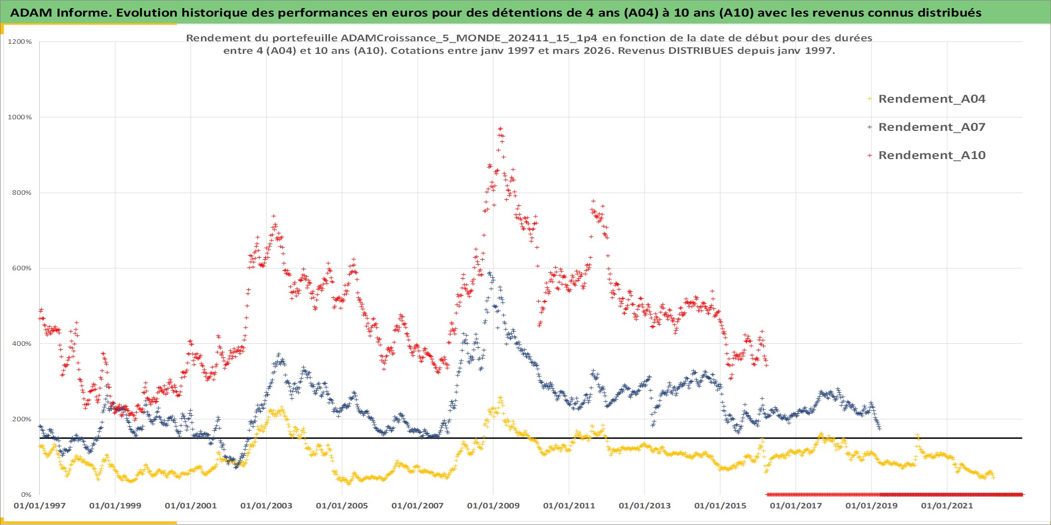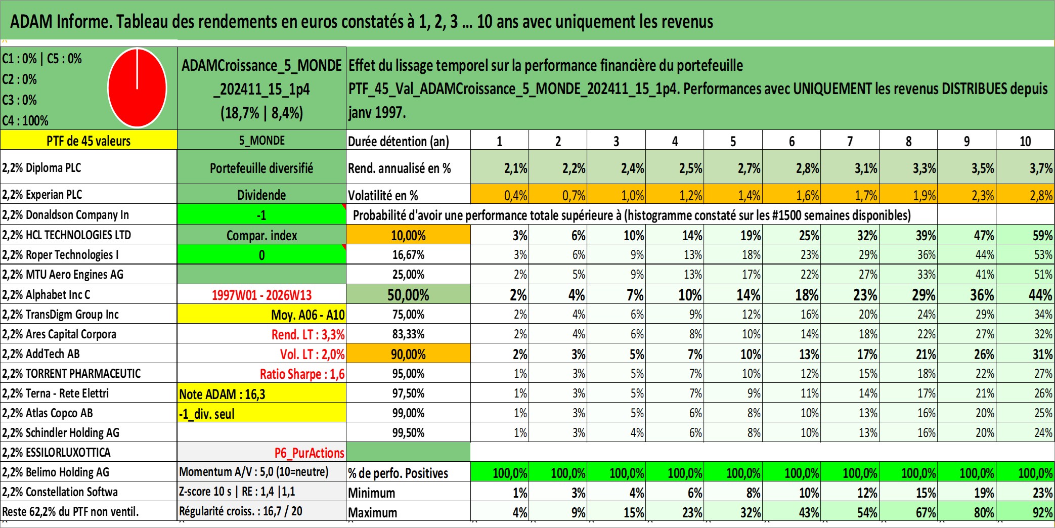 Site dédié aux investisseursPage dédiée sur site financeAnalyse des valorisations hebdomadaires du portefeuille ADAMCroissance_5_MONDE_202411_15_1p4_45actifs avec un profil P6_PurActions. Ce portefeuille est cote en EUR. Les valorisations couvrent les semaines 1997W01 a 2026W13. Les revenus de cet actif financier sont pris en compte depuis la semaine 1997W01. La note globale ESG de cet actif est estimee a 10.9 (apres rebasage entre 0 et 20).