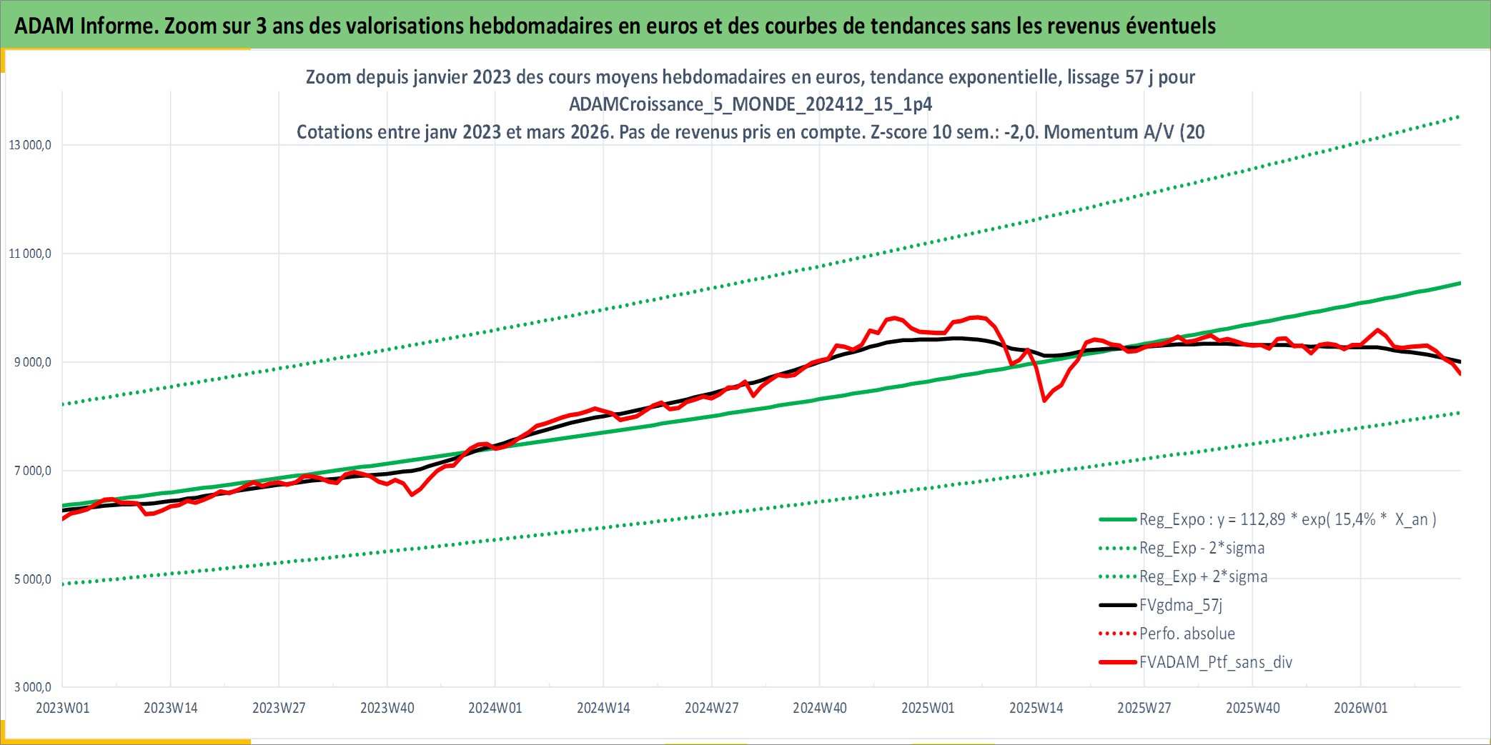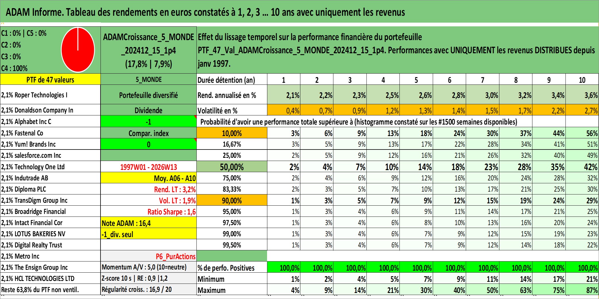Site dédié aux investisseursPage dédiée sur site financeAnalyse des valorisations hebdomadaires du portefeuille ADAMCroissance_5_MONDE_202412_15_1p4_47actifs avec un profil P6_PurActions. Ce portefeuille est cote en EUR. Les valorisations couvrent les semaines 1997W01 a 2026W13. Les revenus de cet actif financier sont pris en compte depuis la semaine 1997W01. La note globale ESG de cet actif est estimee a 11.0 (apres rebasage entre 0 et 20).