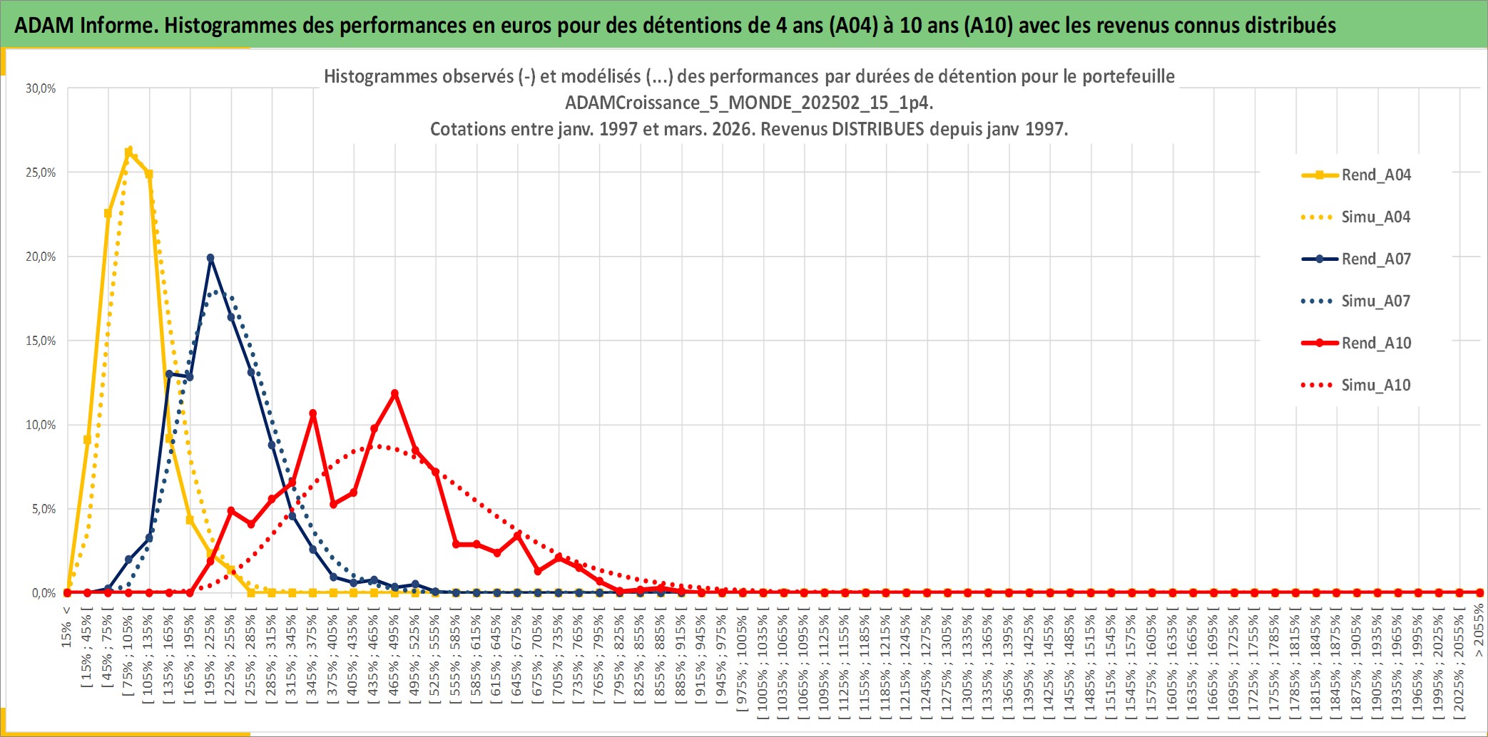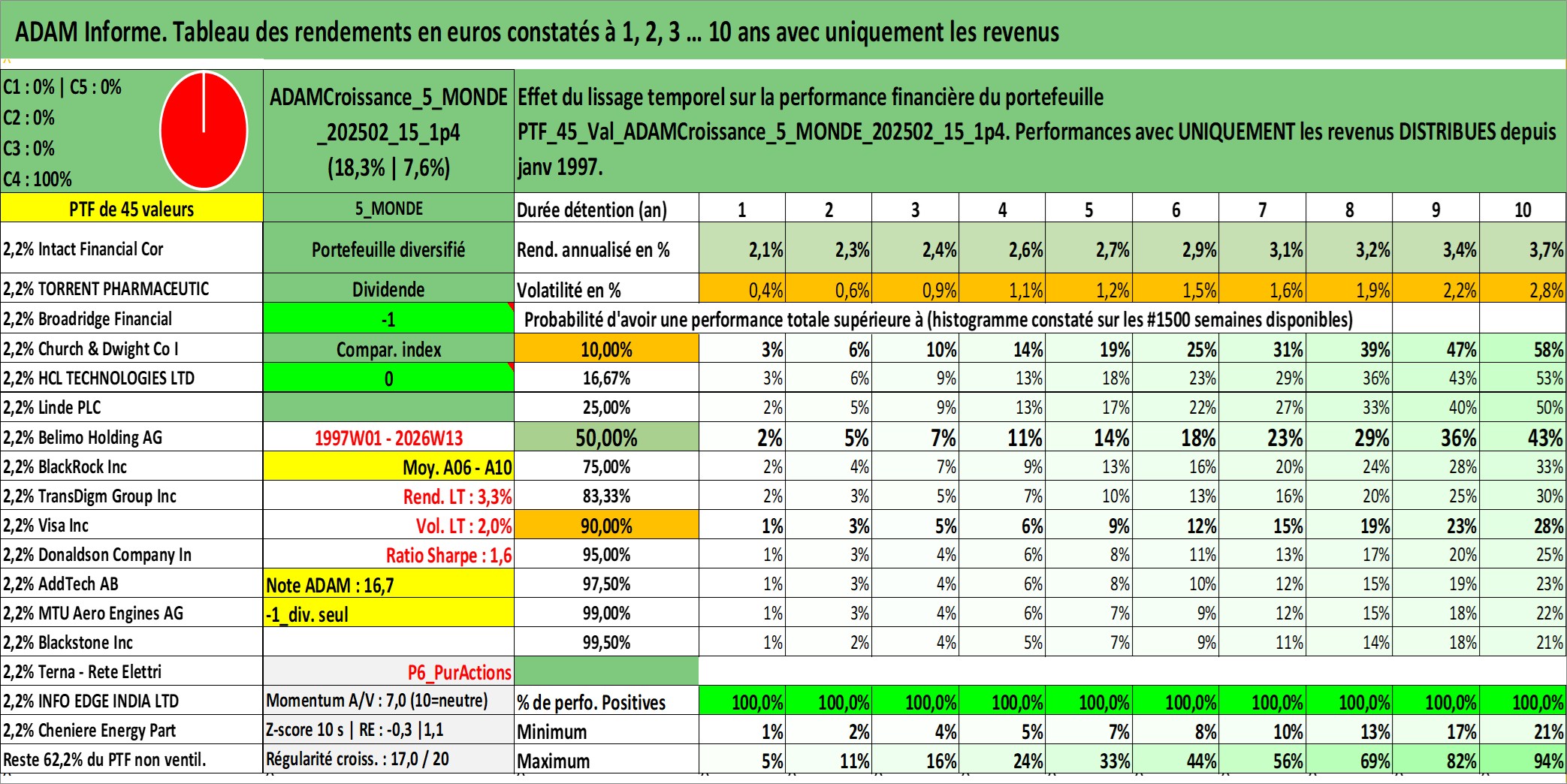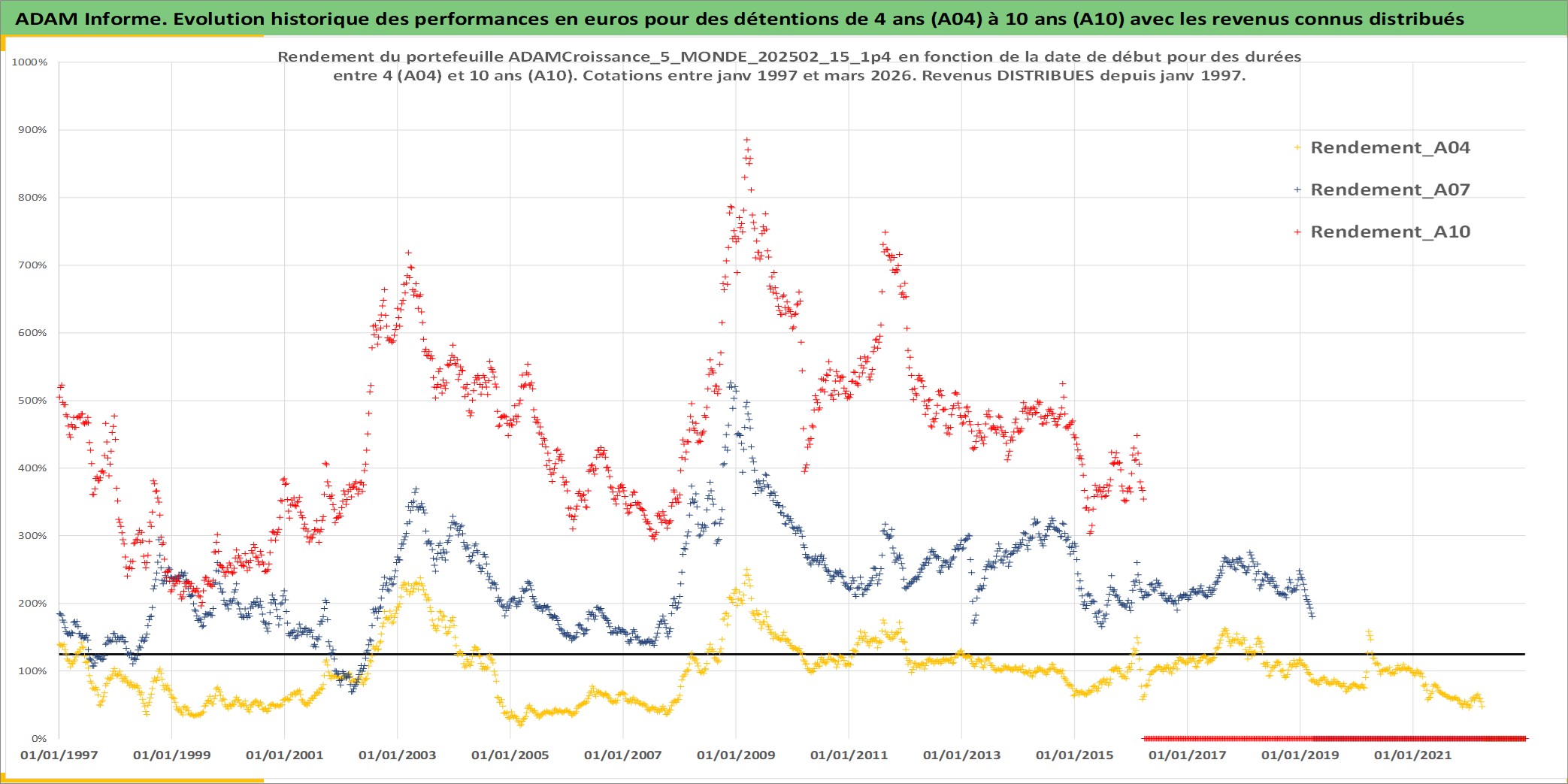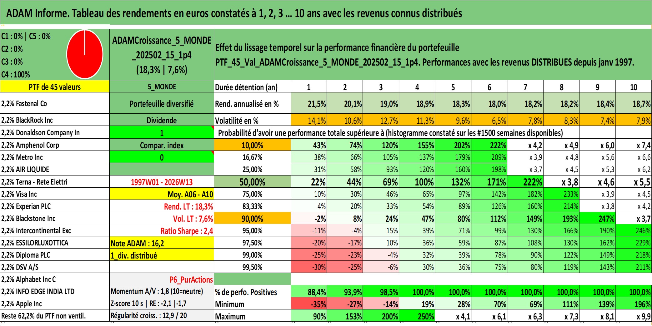 Site dédié aux investisseursPage dédiée sur site financeAnalyse des valorisations hebdomadaires du portefeuille ADAMCroissance_5_MONDE_202502_15_1p4_45actifs avec un profil P6_PurActions. Ce portefeuille est cote en EUR. Les valorisations couvrent les semaines 1997W01 a 2026W13. Les revenus de cet actif financier sont pris en compte depuis la semaine 1997W01. La note globale ESG de cet actif est estimee a 10.8 (apres rebasage entre 0 et 20).