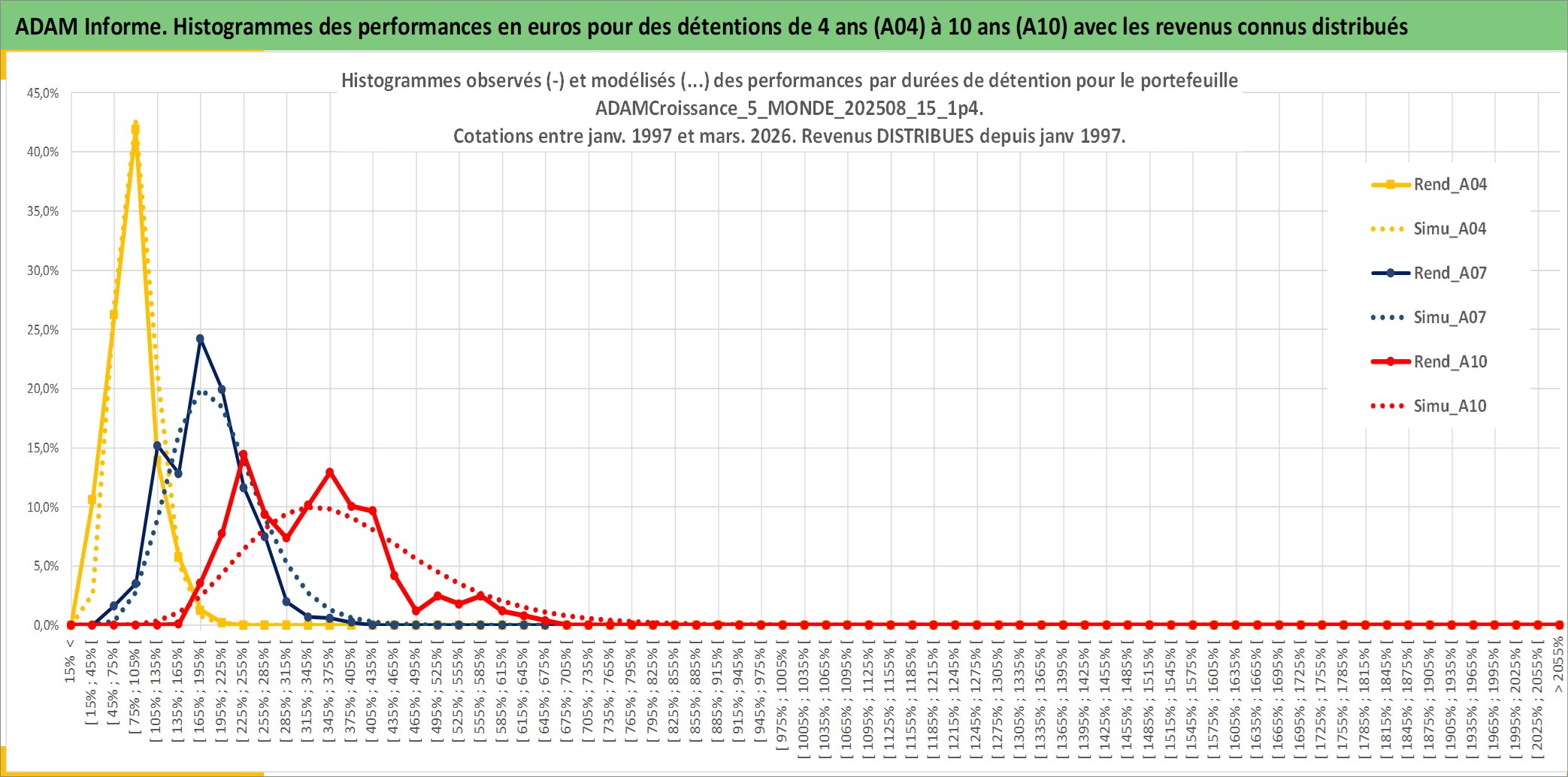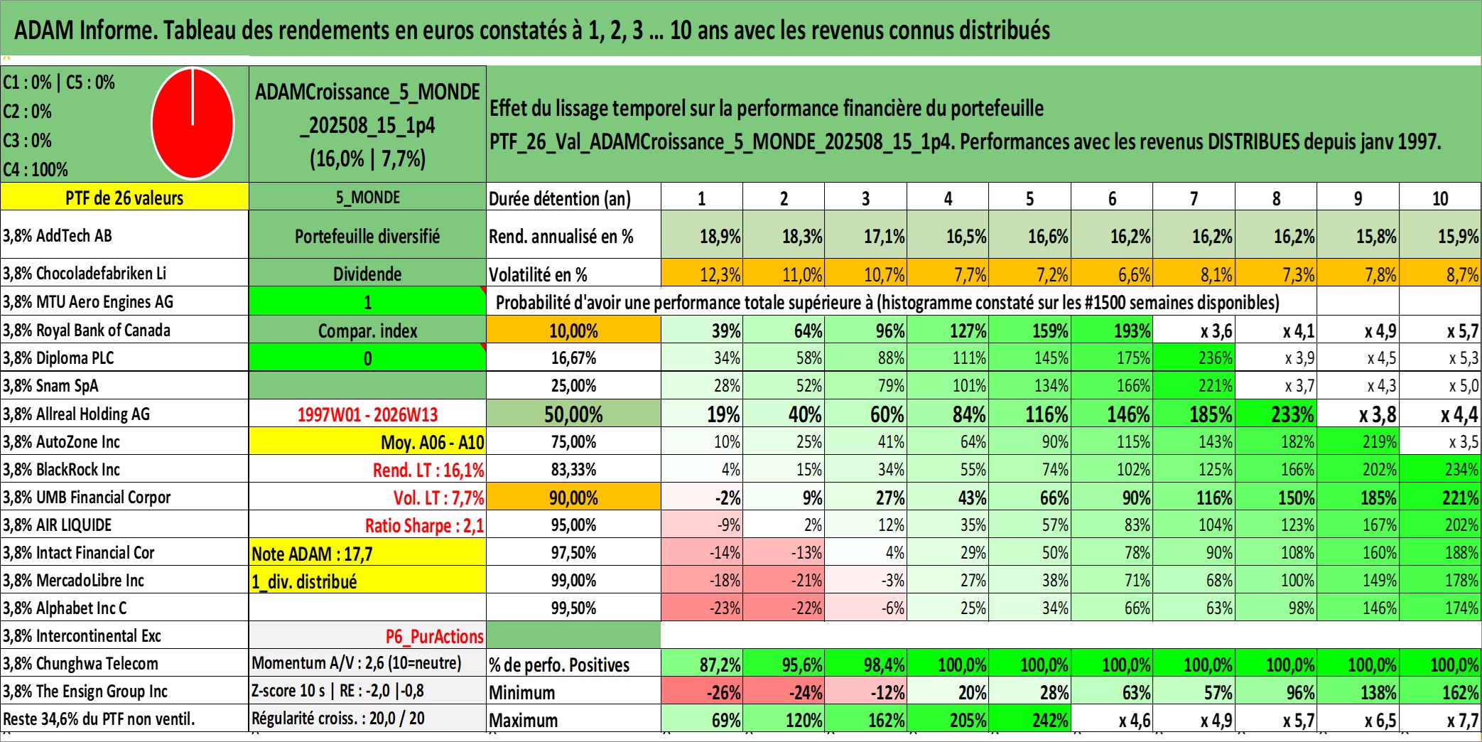 Site dédié aux investisseursPage dédiée sur site financeAnalyse des valorisations hebdomadaires du portefeuille ADAMCroissance_5_MONDE_202508_15_1p4_26actifs avec un profil P6_PurActions. Ce portefeuille est cote en EUR. Les valorisations couvrent les semaines 1997W01 a 2026W13. Les revenus de cet actif financier sont pris en compte depuis la semaine 1997W01. La note globale ESG de cet actif est estimee a 11.9 (apres rebasage entre 0 et 20).