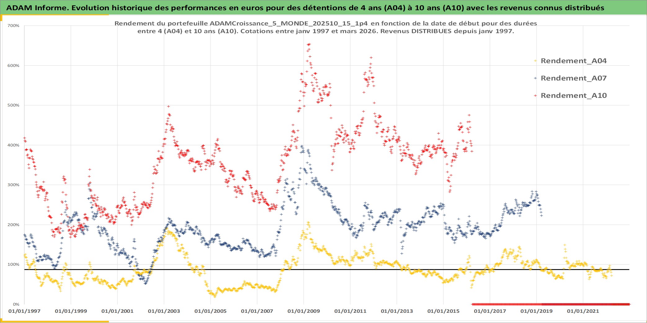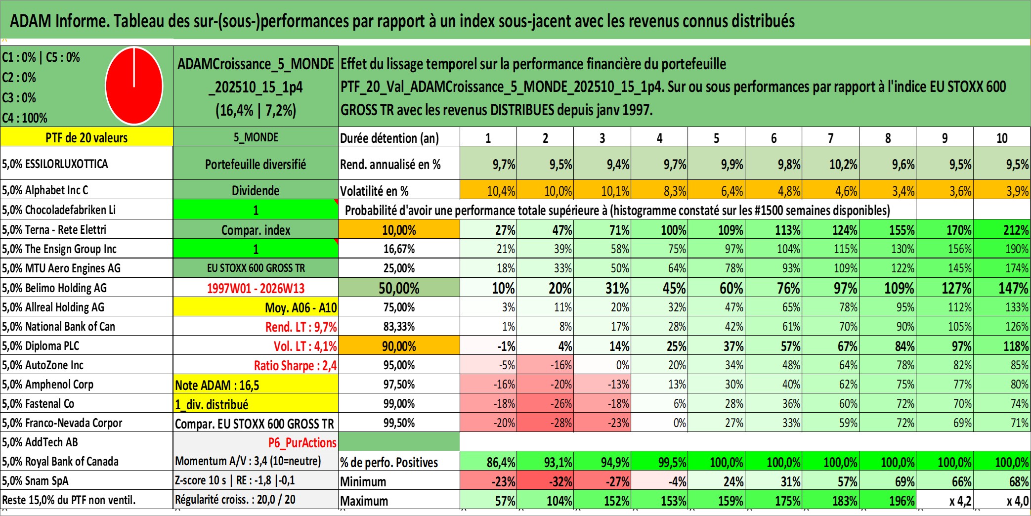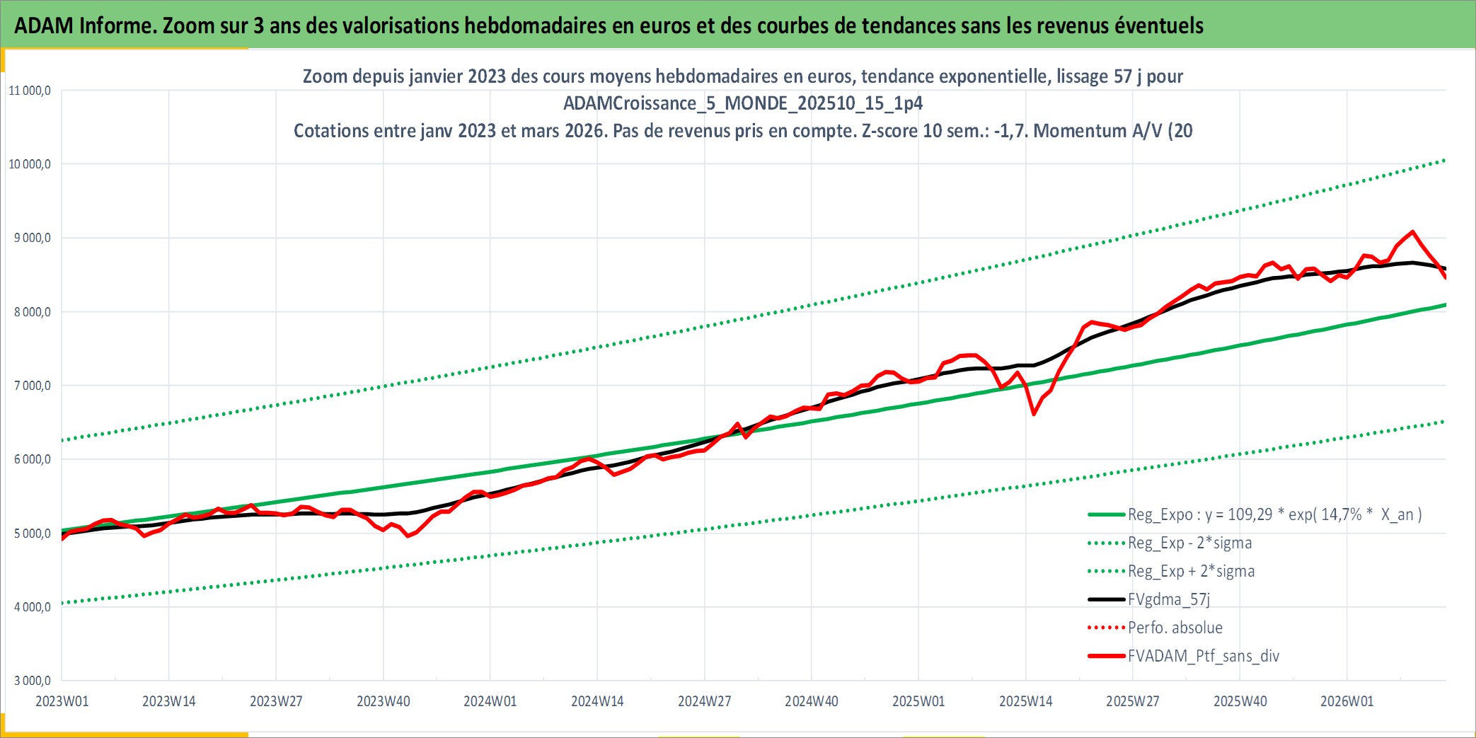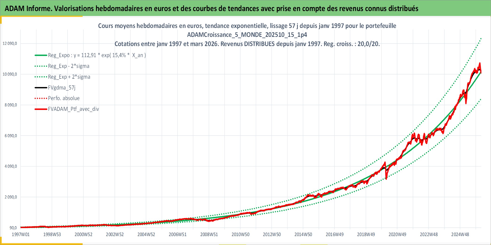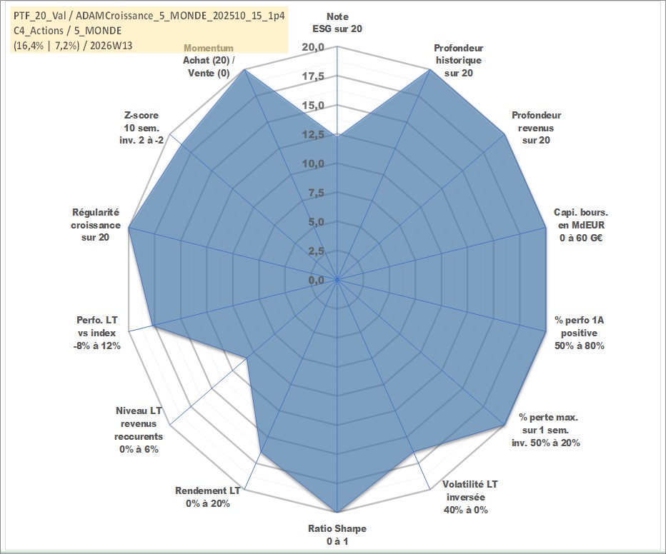 Site dédié aux investisseursPage dédiée sur site financeAnalyse des valorisations hebdomadaires du portefeuille ADAMCroissance_5_MONDE_202510_15_1p4_20actifs avec un profil P6_PurActions. Ce portefeuille est cote en EUR. Les valorisations couvrent les semaines 1997W01 a 2026W13. Les revenus de cet actif financier sont pris en compte depuis la semaine 1997W01. La note globale ESG de cet actif est estimee a 12.2 (apres rebasage entre 0 et 20).