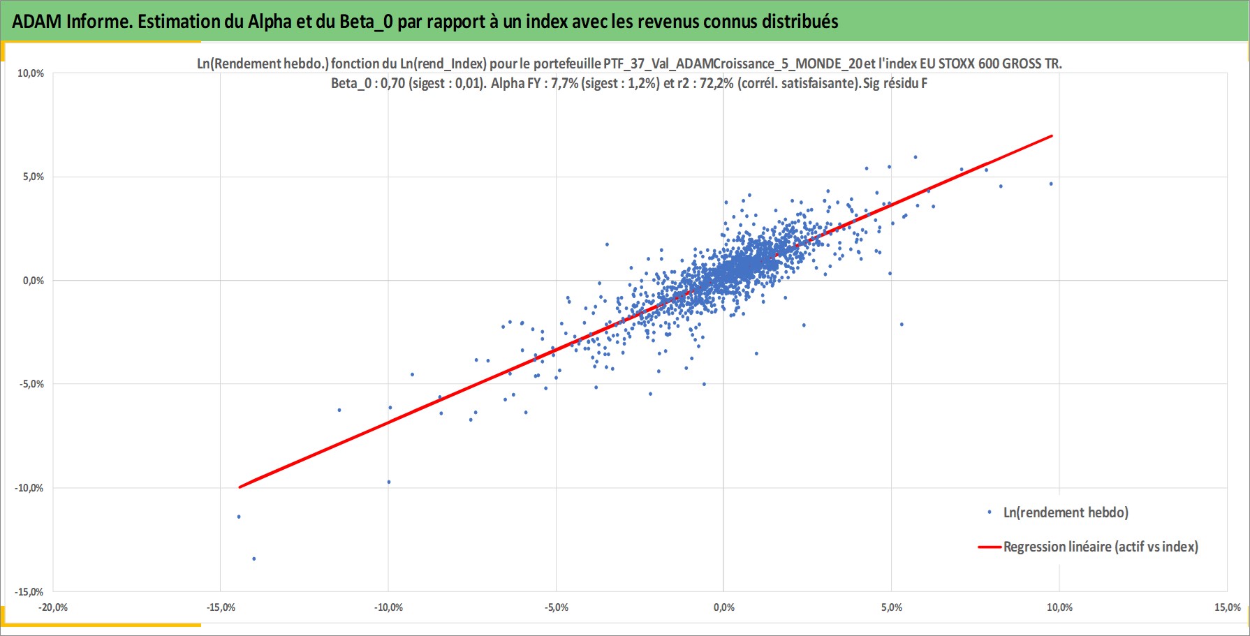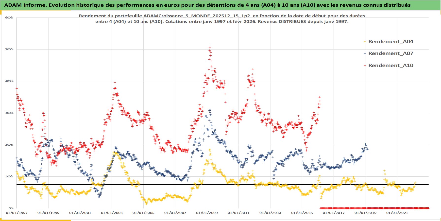 Site dédié aux investisseursPage dédiée sur site financeAnalyse des valorisations hebdomadaires du portefeuille ADAMCroissance_5_MONDE_202512_15_1p2_37actifs avec un profil P6_PurActions. Ce portefeuille est cote en EUR. Les valorisations couvrent les semaines 1997W01 a 2026W09. Les revenus de cet actif financier sont pris en compte depuis la semaine 1997W01. La note globale ESG de cet actif est estimee a 10.9 (apres rebasage entre 0 et 20).