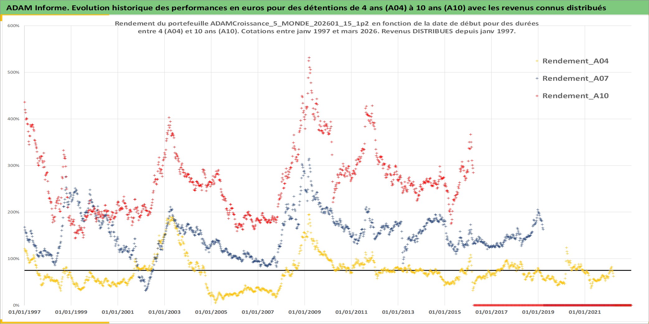 Site dédié aux investisseursPage dédiée sur site financeAnalyse des valorisations hebdomadaires du portefeuille ADAMCroissance_5_MONDE_202601_15_1p2_36actifs avec un profil P6_PurActions. Ce portefeuille est cote en EUR. Les valorisations couvrent les semaines 1997W01 a 2026W13. Les revenus de cet actif financier sont pris en compte depuis la semaine 1997W01. La note globale ESG de cet actif est estimee a 11.0 (apres rebasage entre 0 et 20).