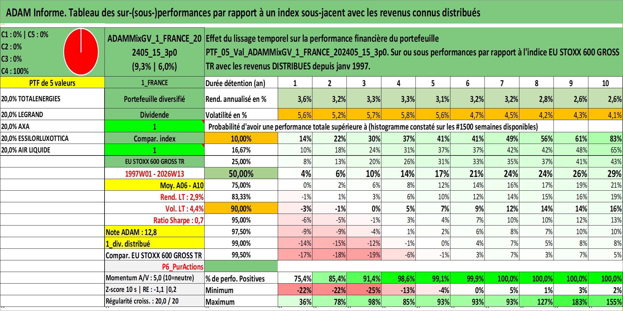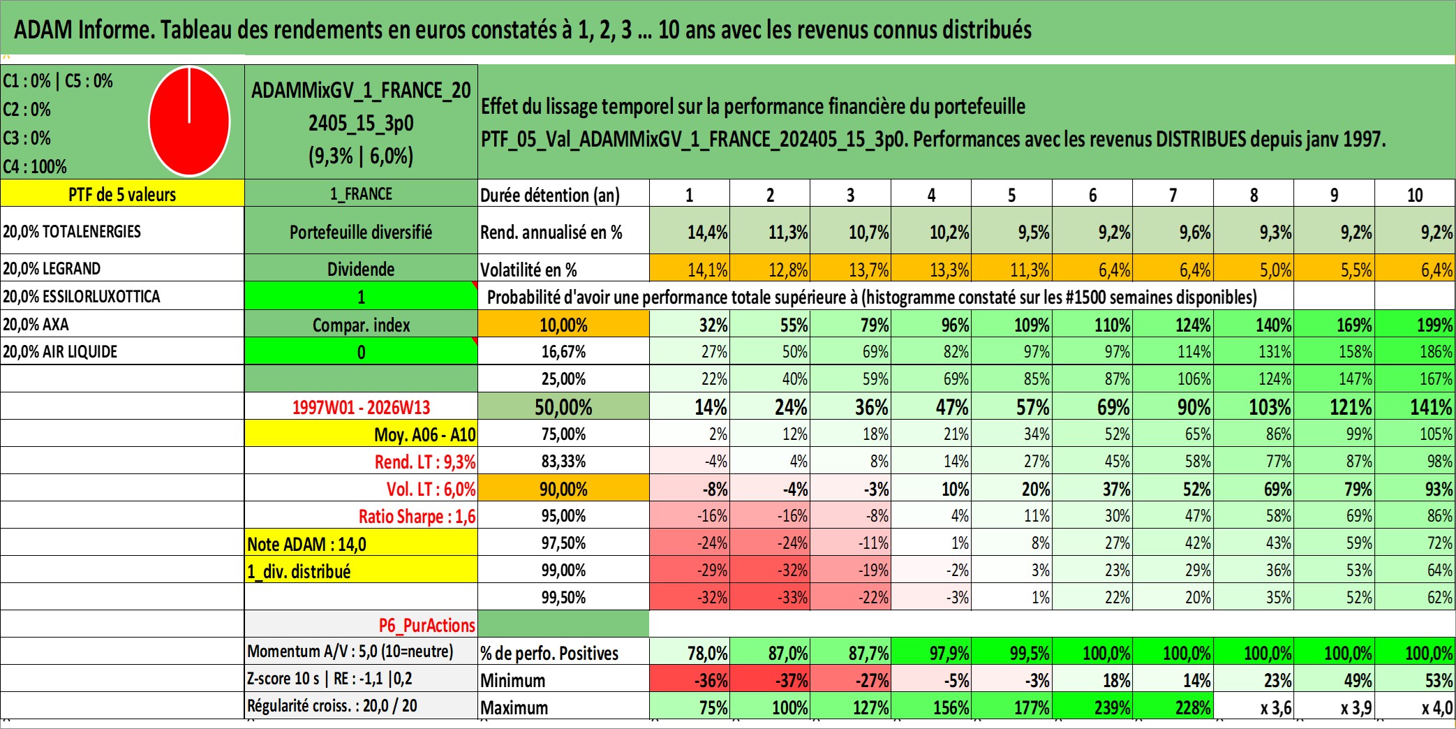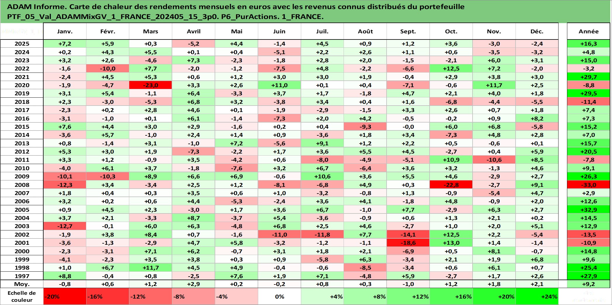 Site dédié aux investisseursPage dédiée sur site financeAnalyse des valorisations hebdomadaires du portefeuille ADAMMixGV_1_FRANCE_202405_15_3p0_5actifs avec un profil P6_PurActions. Ce portefeuille est cote en EUR. Les valorisations couvrent les semaines 1997W01 a 2026W13. Les revenus de cet actif financier sont pris en compte depuis la semaine 1997W01. La note globale ESG de cet actif est estimee a 10.8 (apres rebasage entre 0 et 20).