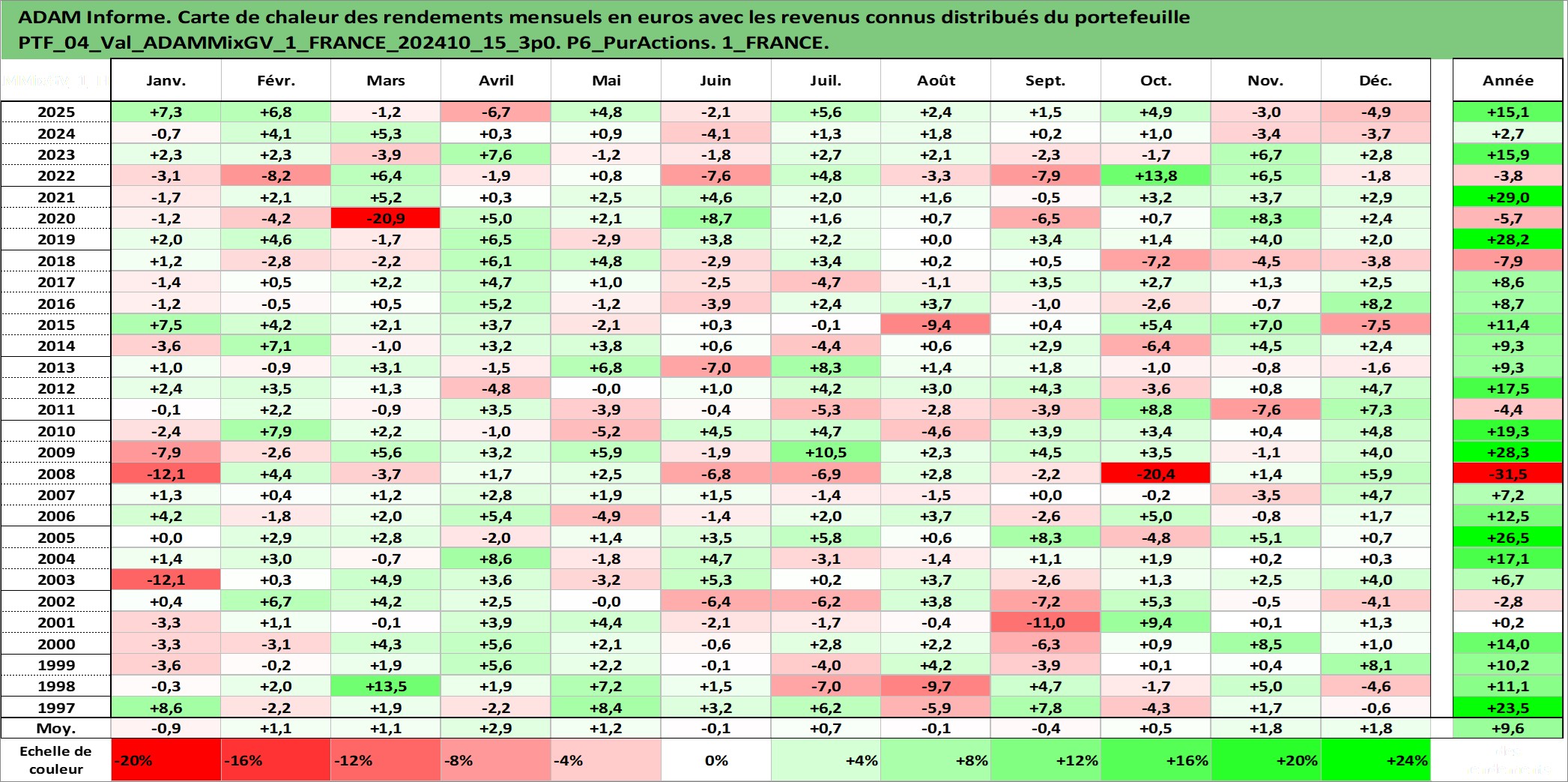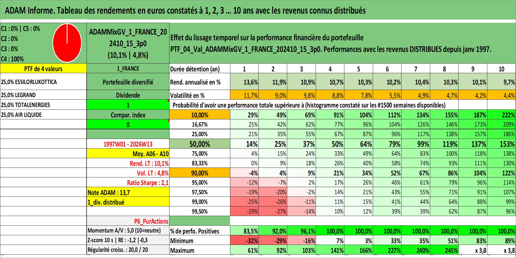 Site dédié aux investisseursPage dédiée sur site financeAnalyse des valorisations hebdomadaires du portefeuille ADAMMixGV_1_FRANCE_202410_15_3p0_4actifs avec un profil P6_PurActions. Ce portefeuille est cote en EUR. Les valorisations couvrent les semaines 1997W01 a 2026W13. Les revenus de cet actif financier sont pris en compte depuis la semaine 1997W01. La note globale ESG de cet actif est estimee a 10.5 (apres rebasage entre 0 et 20).