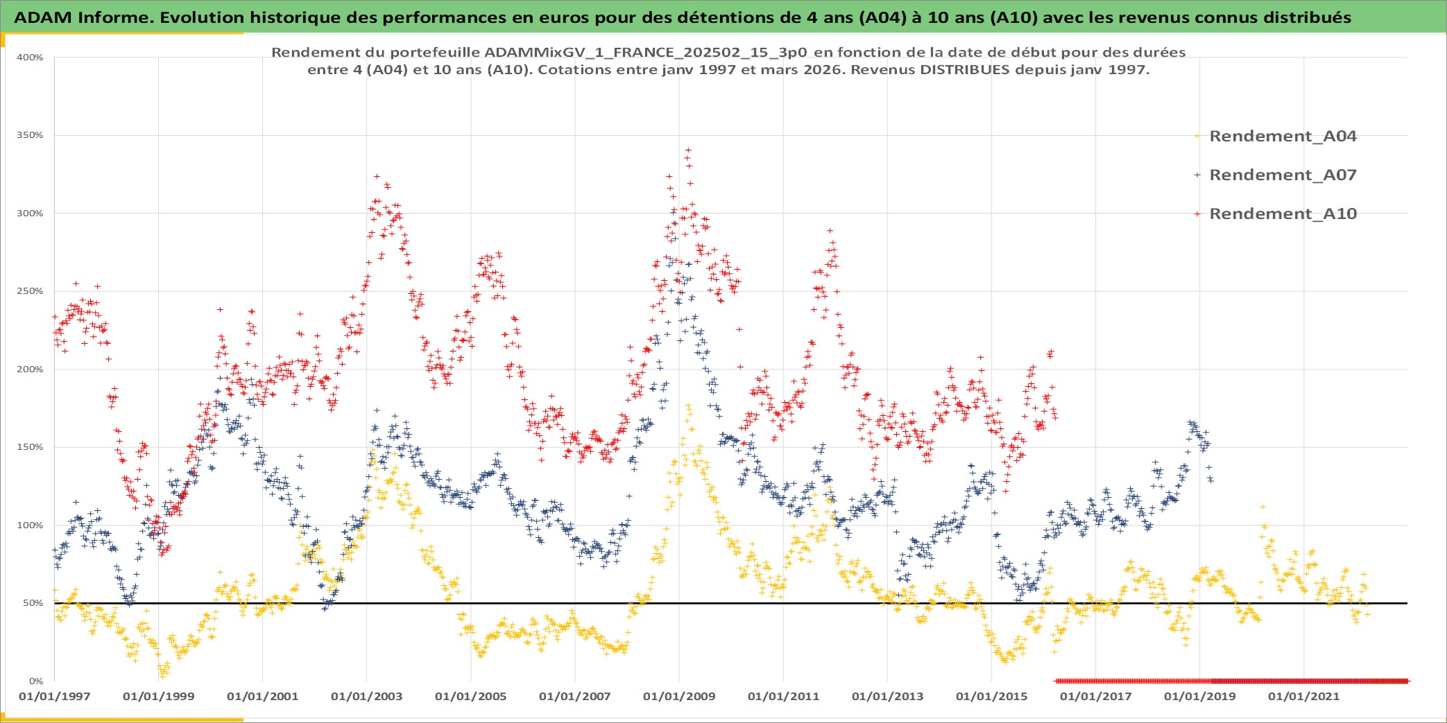 Site dédié aux investisseursPage dédiée sur site financeAnalyse des valorisations hebdomadaires du portefeuille ADAMMixGV_1_FRANCE_202502_15_3p0_3actifs avec un profil P6_PurActions. Ce portefeuille est cote en EUR. Les valorisations couvrent les semaines 1997W01 a 2026W13. Les revenus de cet actif financier sont pris en compte depuis la semaine 1997W01. La note globale ESG de cet actif est estimee a 12.3 (apres rebasage entre 0 et 20).