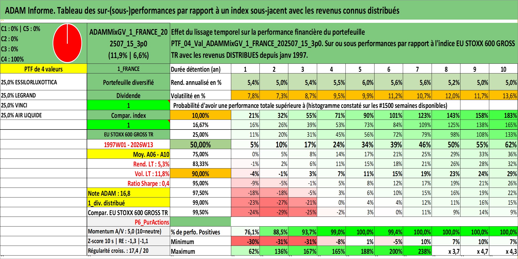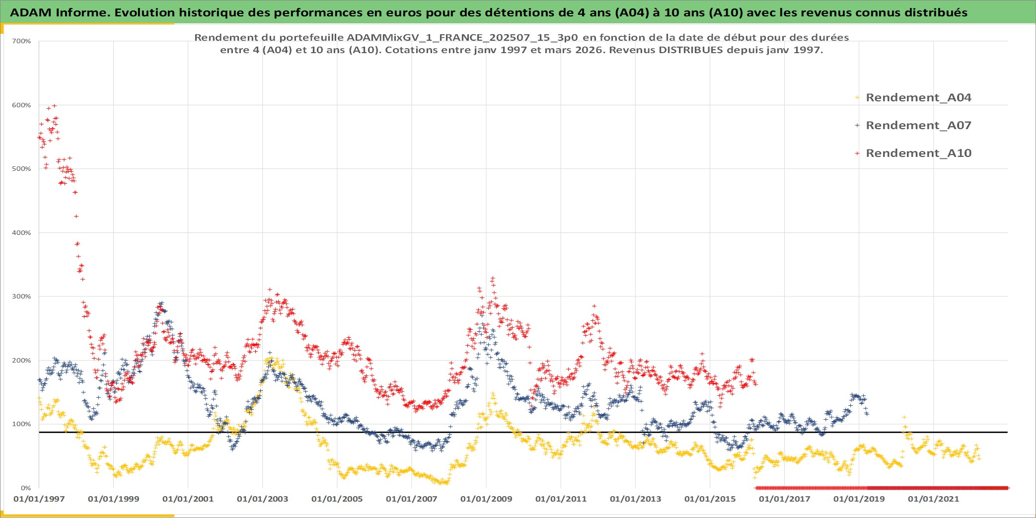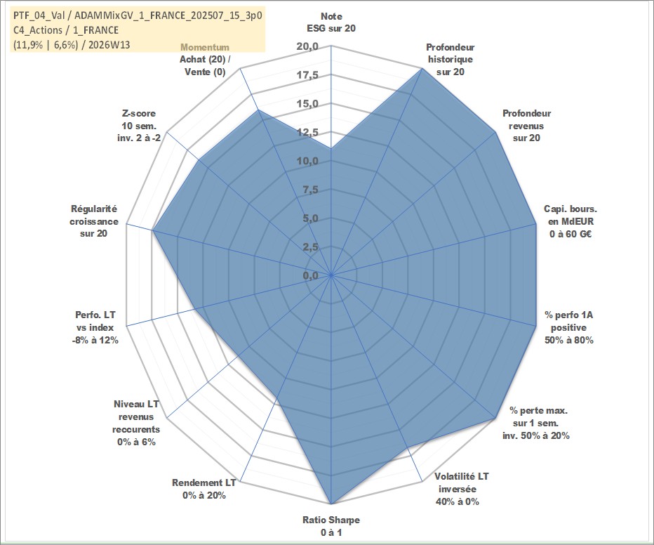 Site dédié aux investisseursPage dédiée sur site financeAnalyse des valorisations hebdomadaires du portefeuille ADAMMixGV_1_FRANCE_202507_15_3p0_4actifs avec un profil P6_PurActions. Ce portefeuille est cote en EUR. Les valorisations couvrent les semaines 1997W01 a 2026W13. Les revenus de cet actif financier sont pris en compte depuis la semaine 1997W01. La note globale ESG de cet actif est estimee a 11.0 (apres rebasage entre 0 et 20).