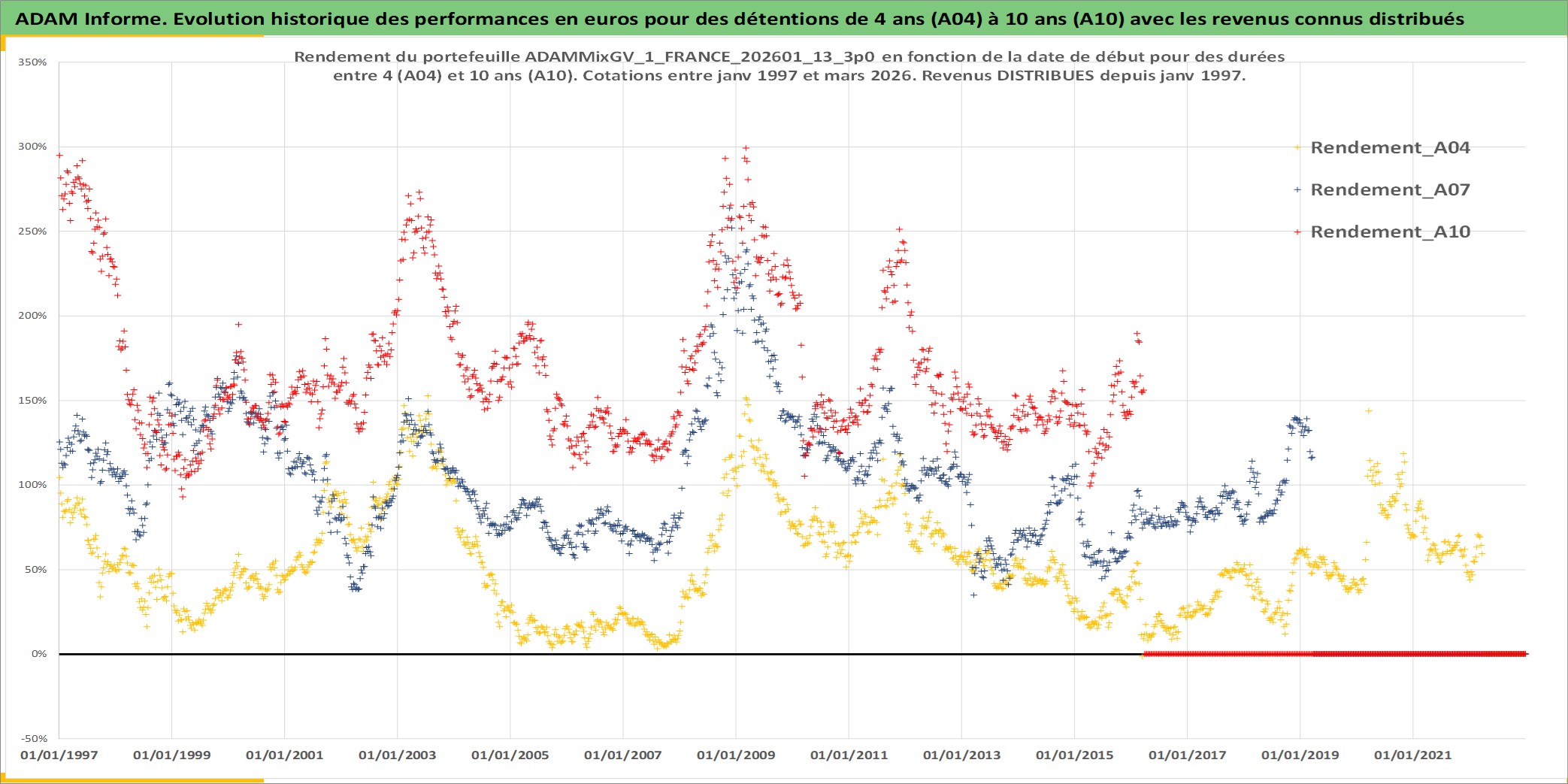Site dédié aux investisseursPage dédiée sur site financeAnalyse des valorisations hebdomadaires du portefeuille ADAMMixGV_1_FRANCE_202601_13_3p0_3actifs avec un profil P6_PurActions. Ce portefeuille est cote en EUR. Les valorisations couvrent les semaines 1997W01 a 2026W13. Les revenus de cet actif financier sont pris en compte depuis la semaine 1997W01. La note globale ESG de cet actif est estimee a 9.3 (apres rebasage entre 0 et 20).