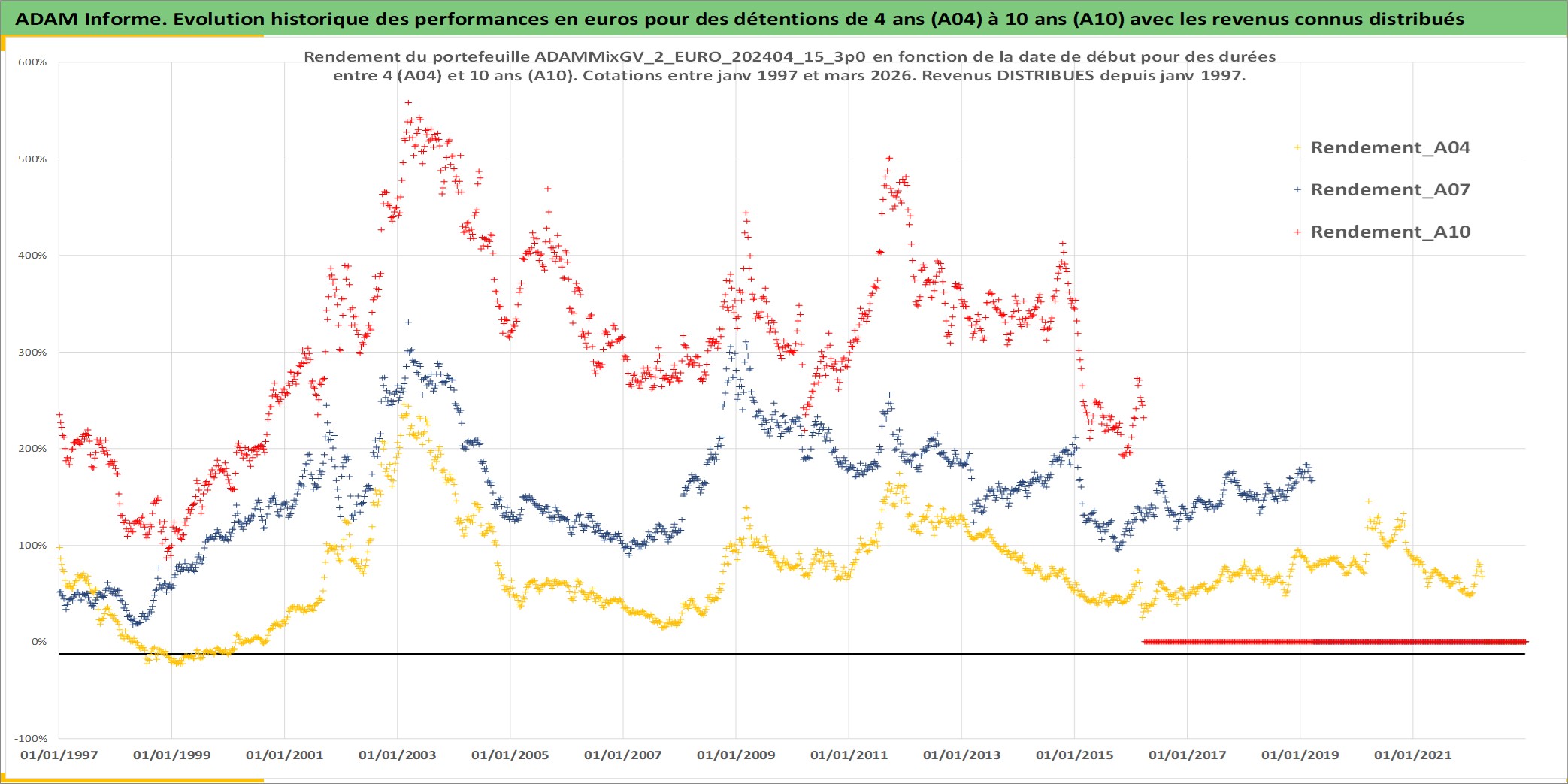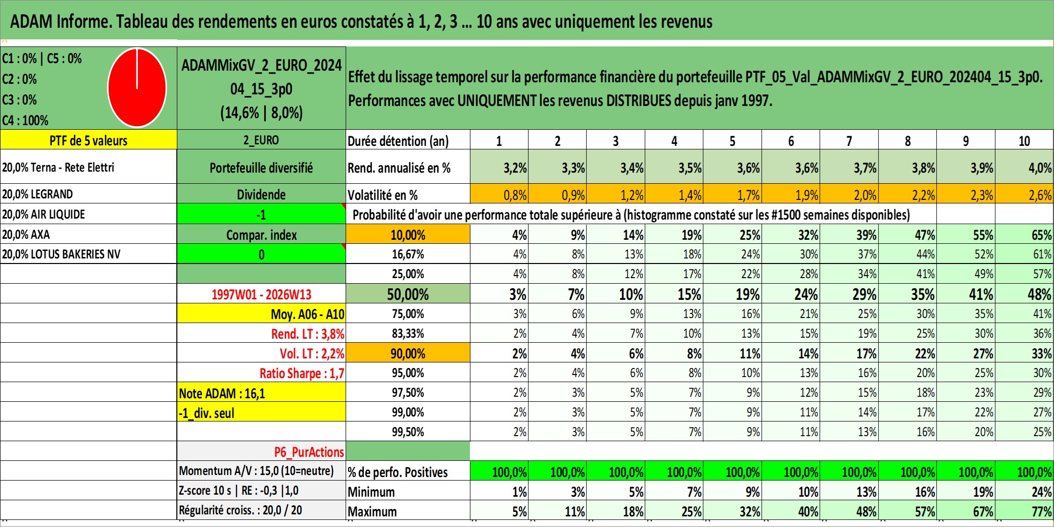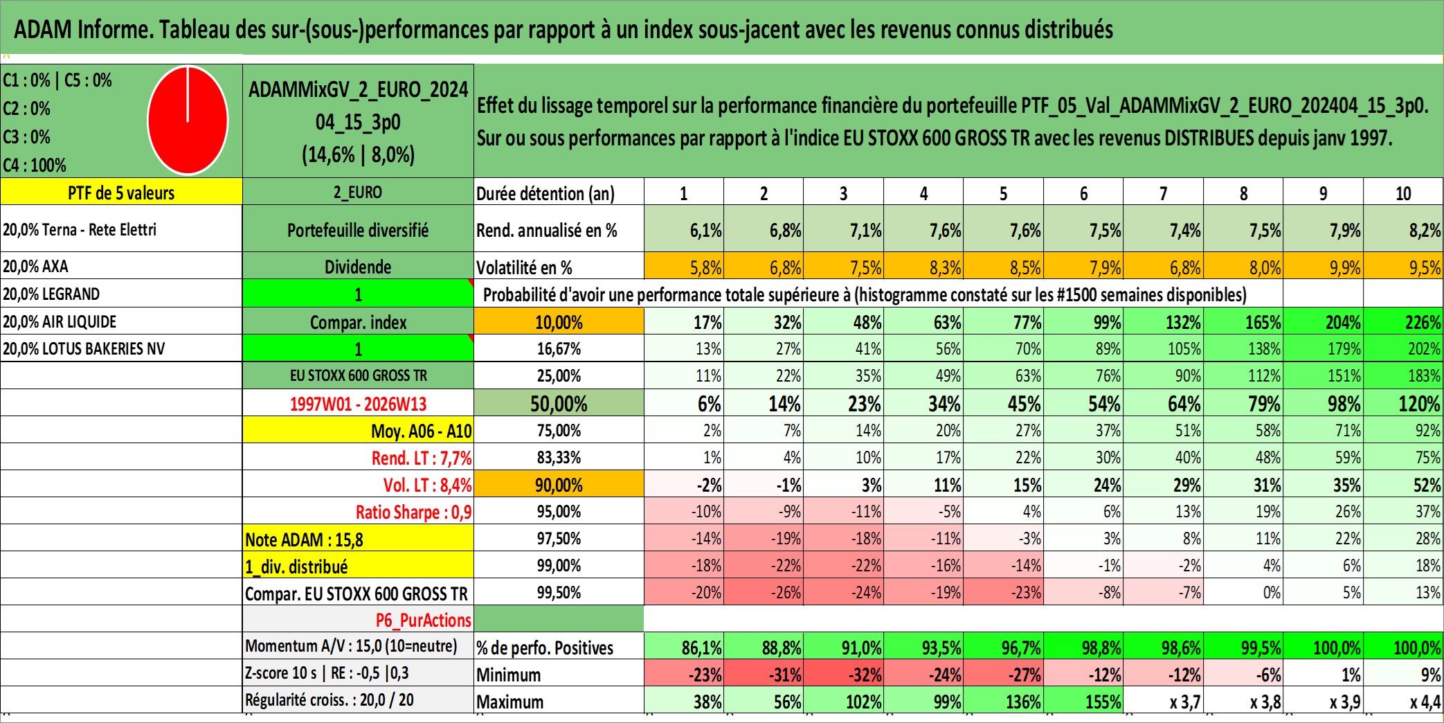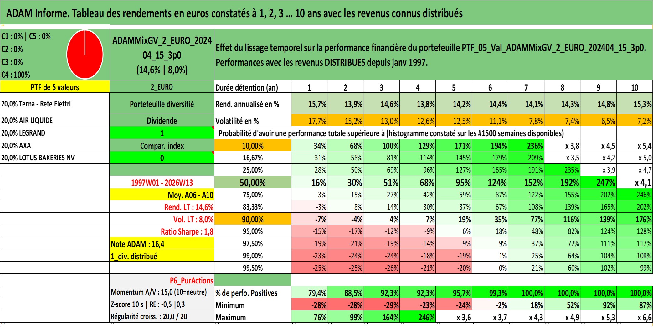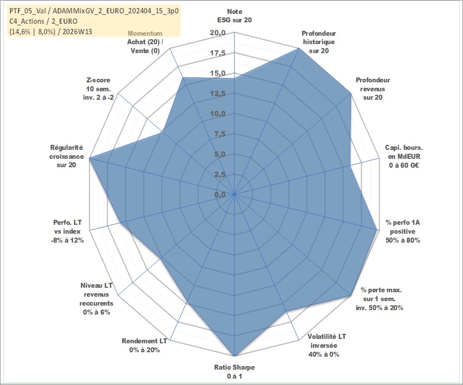 Site dédié aux investisseursPage dédiée sur site financeAnalyse des valorisations hebdomadaires du portefeuille ADAMMixGV_2_EURO_202404_15_3p0_5actifs avec un profil P6_PurActions. Ce portefeuille est cote en EUR. Les valorisations couvrent les semaines 1997W01 a 2026W13. Les revenus de cet actif financier sont pris en compte depuis la semaine 1997W01. La note globale ESG de cet actif est estimee a 14.3 (apres rebasage entre 0 et 20).