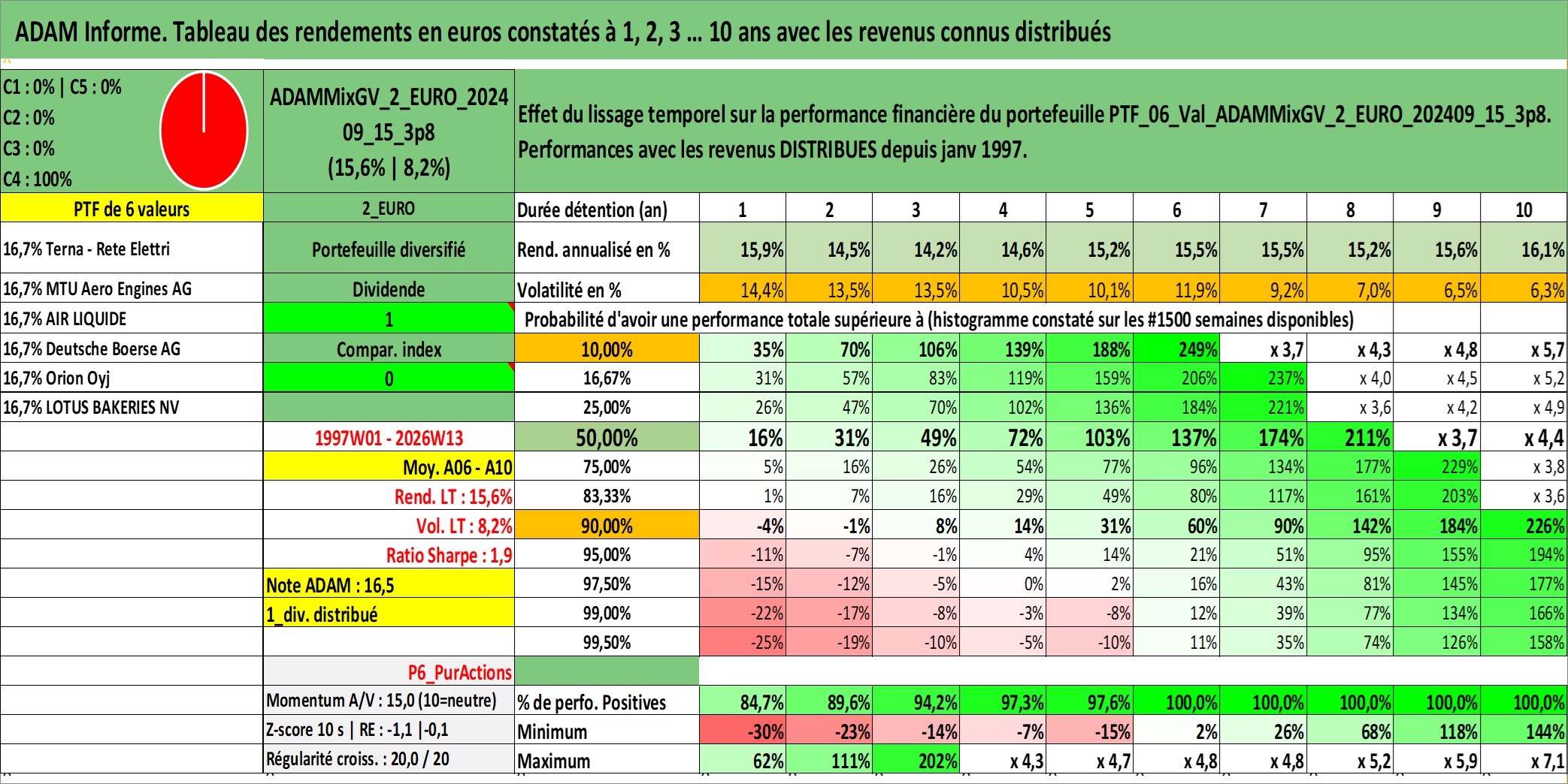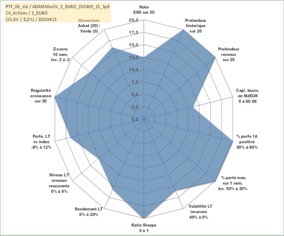 Site dédié aux investisseursPage dédiée sur site financeAnalyse des valorisations hebdomadaires du portefeuille ADAMMixGV_2_EURO_202409_15_3p8_6actifs avec un profil P6_PurActions. Ce portefeuille est cote en EUR. Les valorisations couvrent les semaines 1997W01 a 2026W13. Les revenus de cet actif financier sont pris en compte depuis la semaine 1997W01. La note globale ESG de cet actif est estimee a 12.4 (apres rebasage entre 0 et 20).