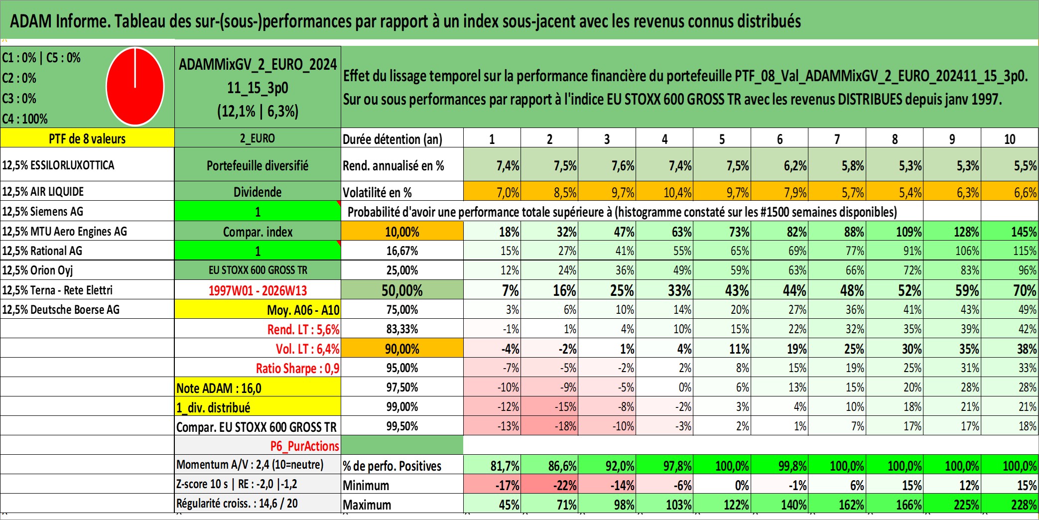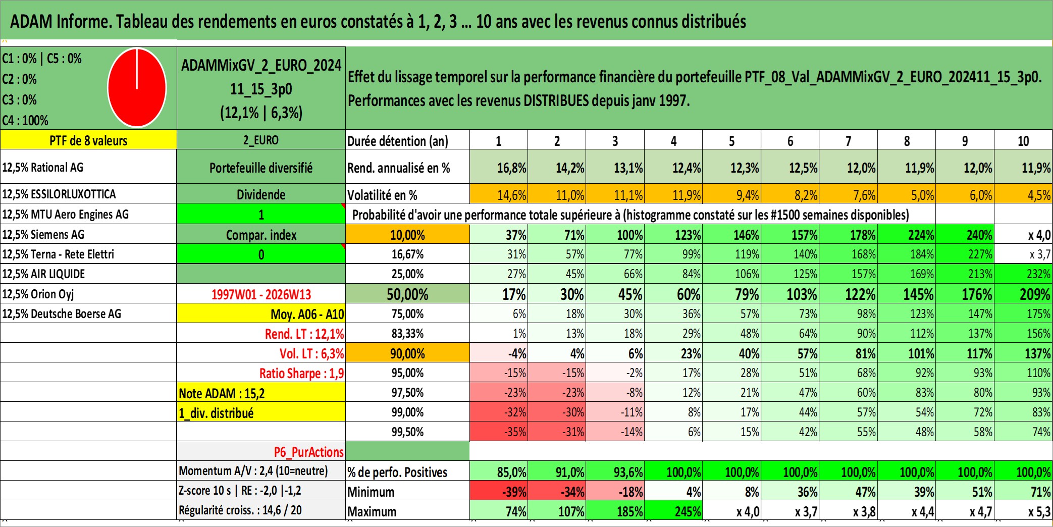 Site dédié aux investisseursPage dédiée sur site financeAnalyse des valorisations hebdomadaires du portefeuille ADAMMixGV_2_EURO_202411_15_3p0_8actifs avec un profil P6_PurActions. Ce portefeuille est cote en EUR. Les valorisations couvrent les semaines 1997W01 a 2026W13. Les revenus de cet actif financier sont pris en compte depuis la semaine 1997W01. La note globale ESG de cet actif est estimee a 10.2 (apres rebasage entre 0 et 20).