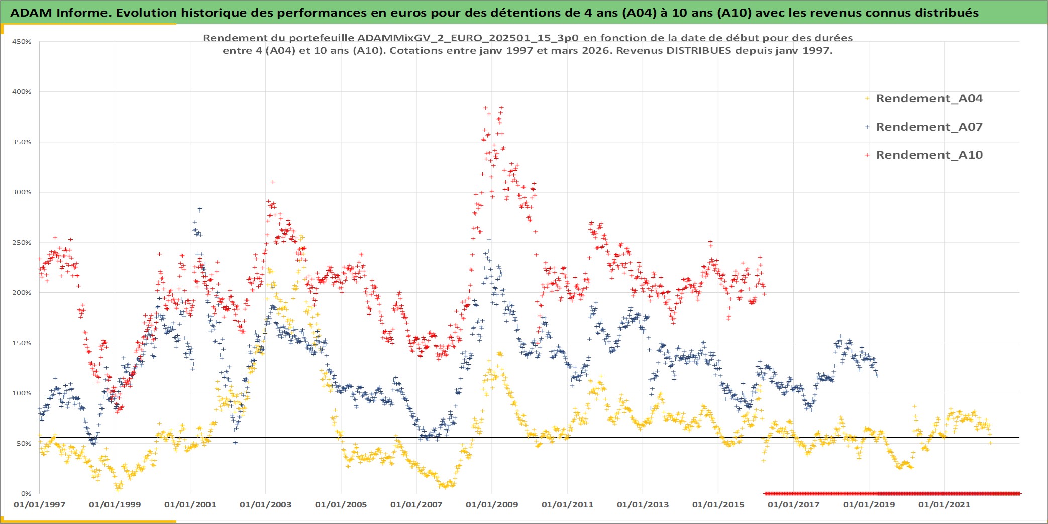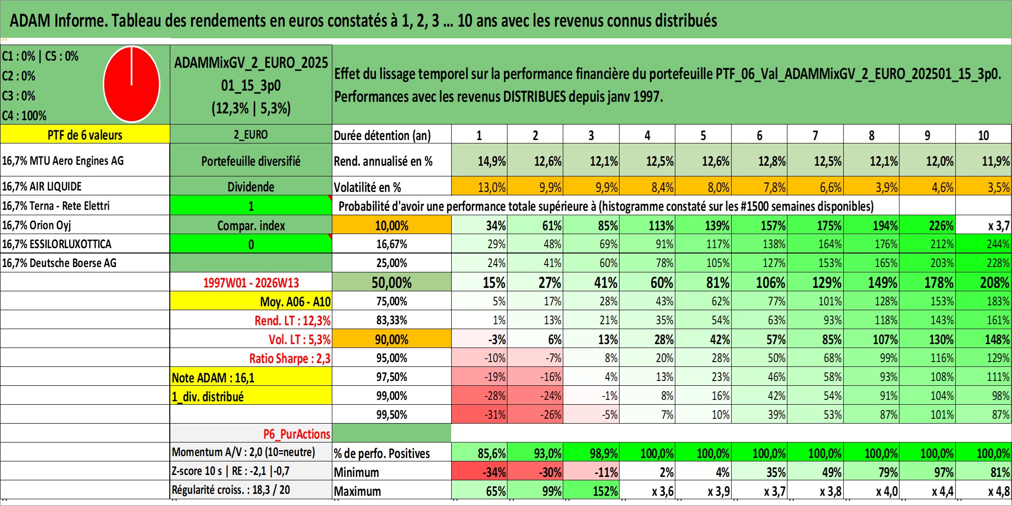 Site dédié aux investisseursPage dédiée sur site financeAnalyse des valorisations hebdomadaires du portefeuille ADAMMixGV_2_EURO_202501_15_3p0_6actifs avec un profil P6_PurActions. Ce portefeuille est cote en EUR. Les valorisations couvrent les semaines 1997W01 a 2026W13. Les revenus de cet actif financier sont pris en compte depuis la semaine 1997W01. La note globale ESG de cet actif est estimee a 12.0 (apres rebasage entre 0 et 20).