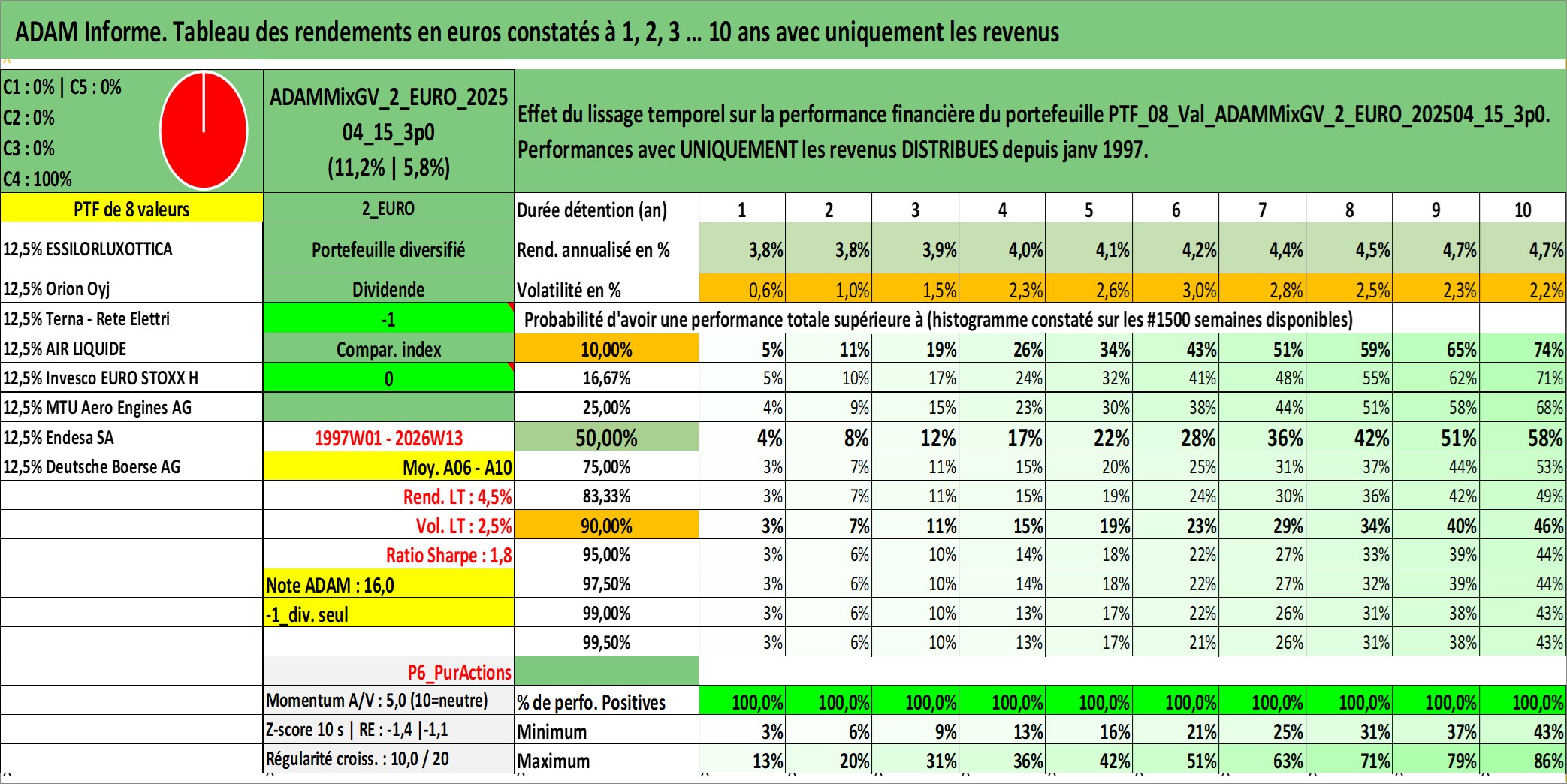 Site dédié aux investisseursPage dédiée sur site financeAnalyse des valorisations hebdomadaires du portefeuille ADAMMixGV_2_EURO_202504_15_3p0_8actifs avec un profil P6_PurActions. Ce portefeuille est cote en EUR. Les valorisations couvrent les semaines 1997W01 a 2026W13. Les revenus de cet actif financier sont pris en compte depuis la semaine 1997W01. La note globale ESG de cet actif est estimee a 12.0 (apres rebasage entre 0 et 20).