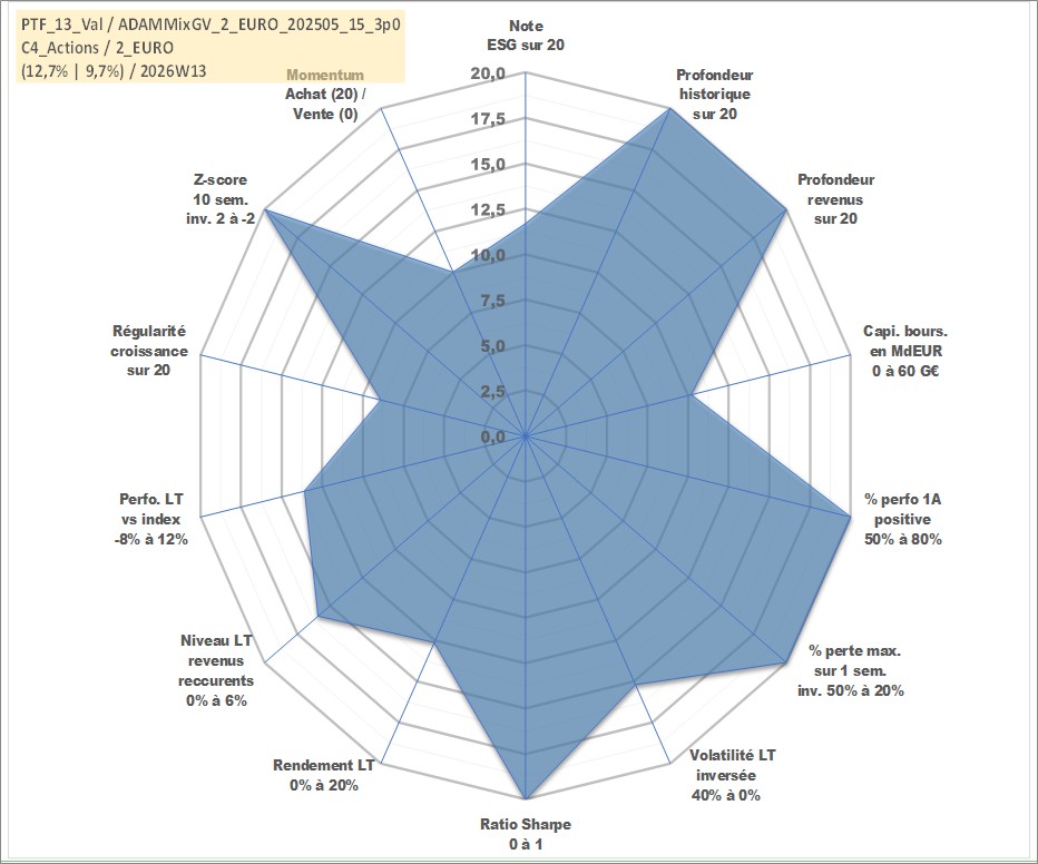 Site dédié aux investisseursPage dédiée sur site financeAnalyse des valorisations hebdomadaires du portefeuille ADAMMixGV_2_EURO_202505_15_3p0_13actifs avec un profil P6_PurActions. Ce portefeuille est cote en EUR. Les valorisations couvrent les semaines 1997W01 a 2026W13. Les revenus de cet actif financier sont pris en compte depuis la semaine 1997W01. La note globale ESG de cet actif est estimee a 11.7 (apres rebasage entre 0 et 20).