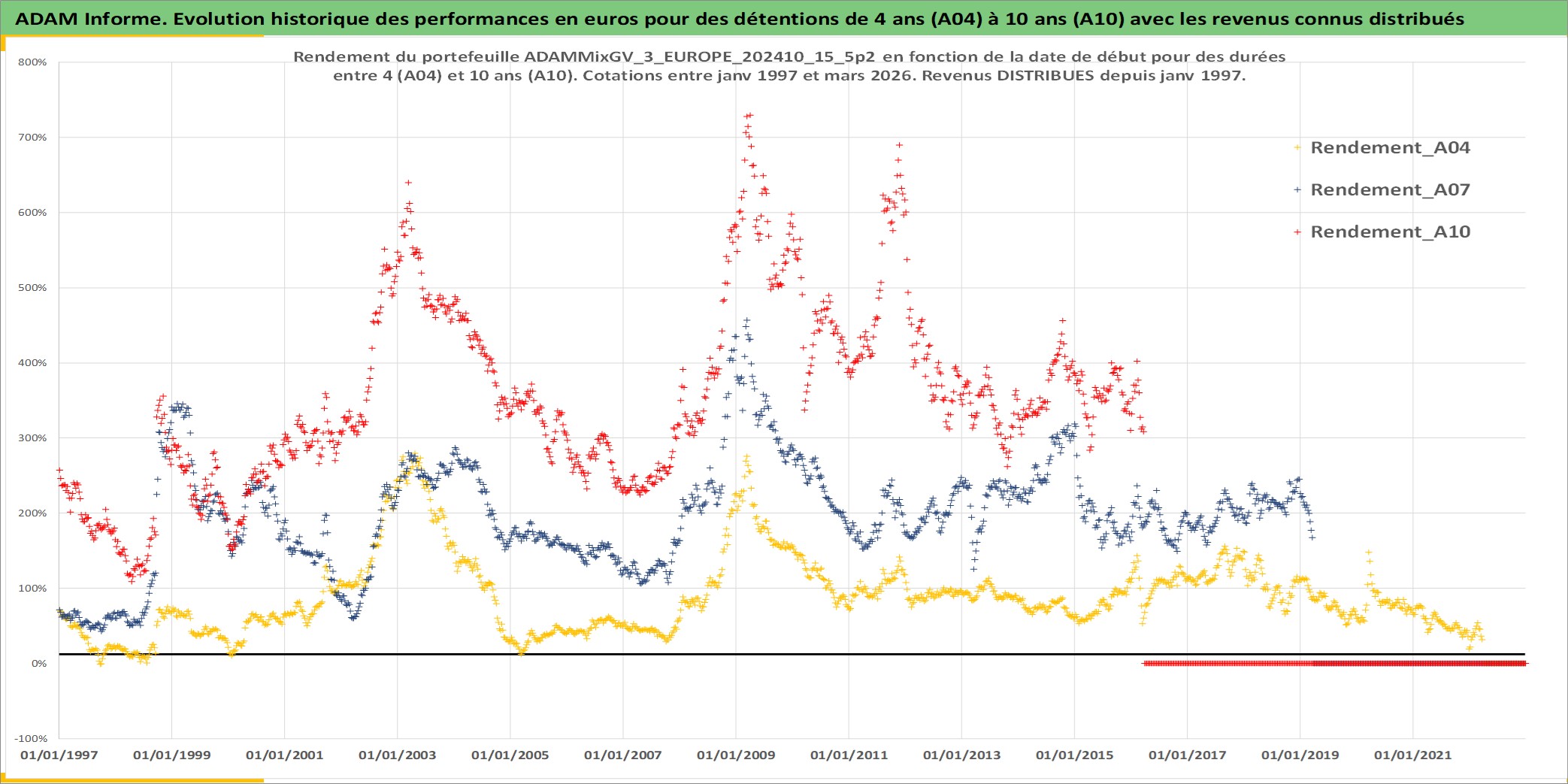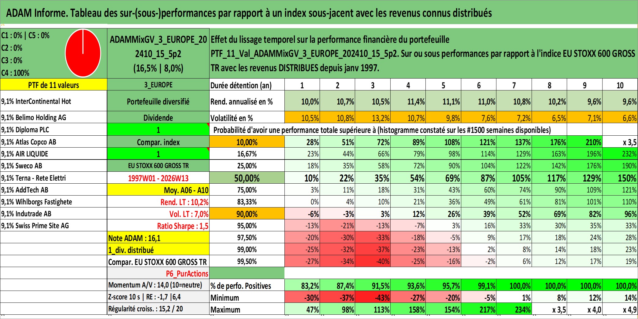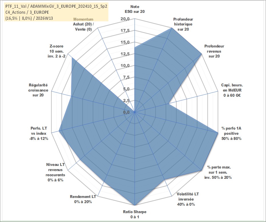 Site dédié aux investisseursPage dédiée sur site financeAnalyse des valorisations hebdomadaires du portefeuille ADAMMixGV_3_EUROPE_202410_15_5p2_11actifs avec un profil P6_PurActions. Ce portefeuille est cote en EUR. Les valorisations couvrent les semaines 1997W01 a 2026W13. Les revenus de cet actif financier sont pris en compte depuis la semaine 1997W01. La note globale ESG de cet actif est estimee a 13.8 (apres rebasage entre 0 et 20).