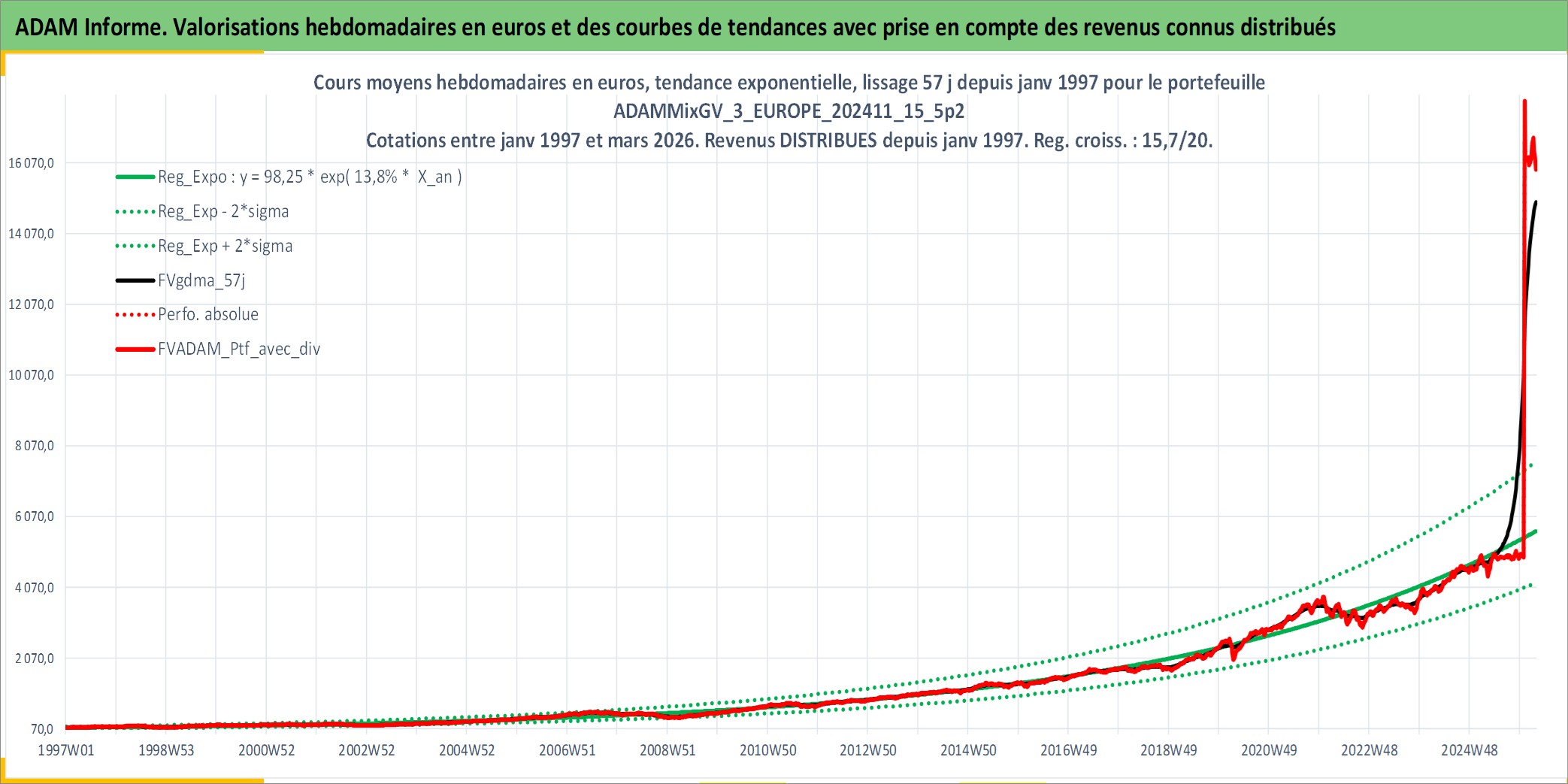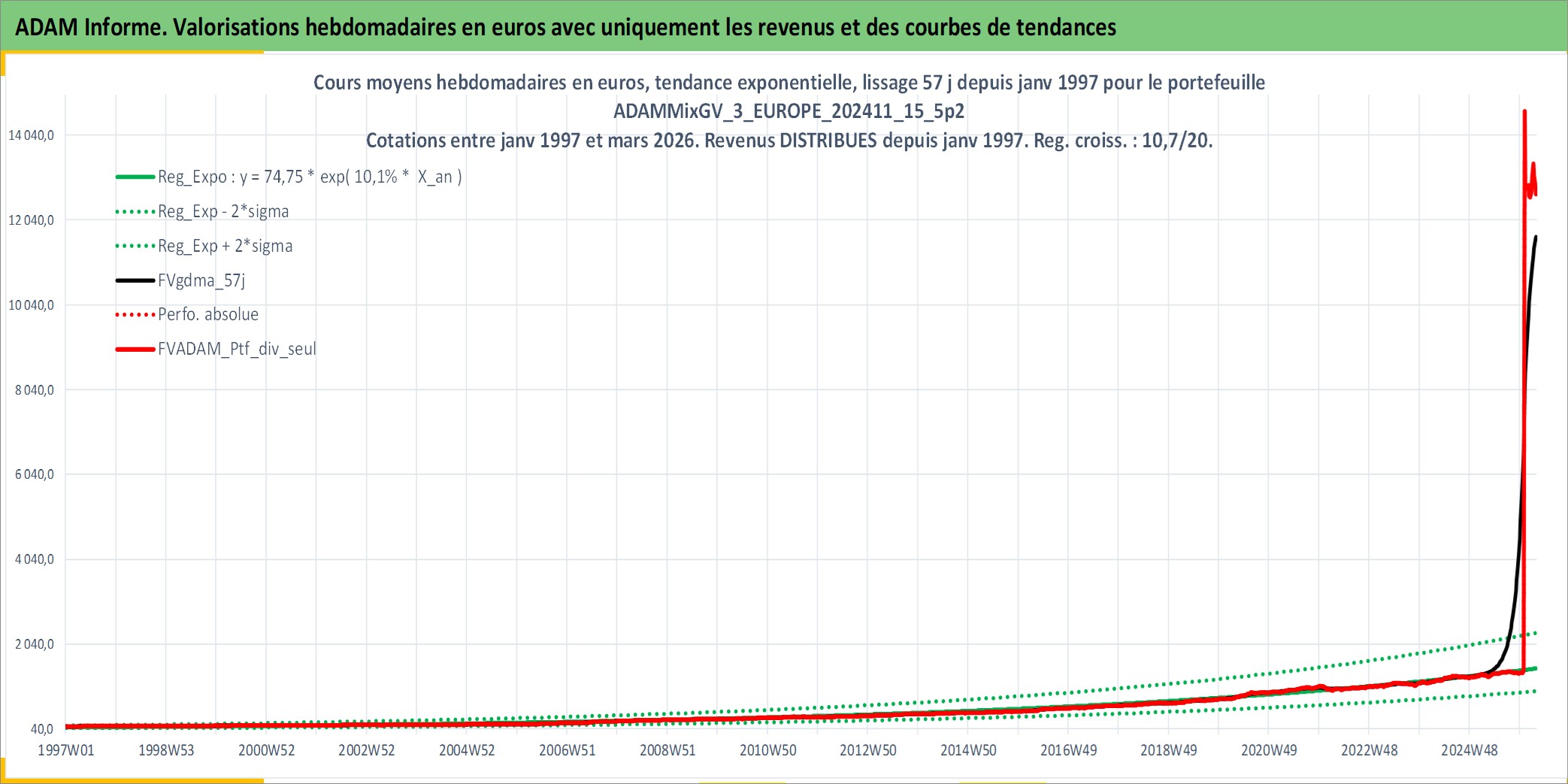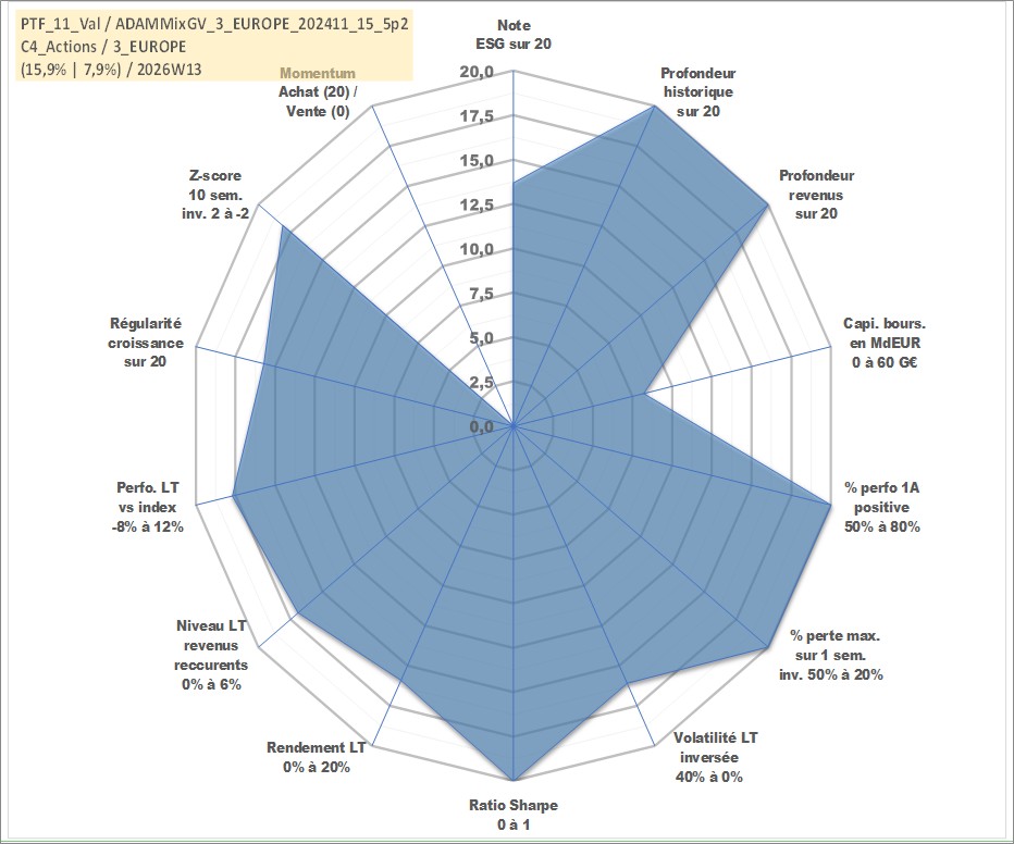 Site dédié aux investisseursPage dédiée sur site financeAnalyse des valorisations hebdomadaires du portefeuille ADAMMixGV_3_EUROPE_202411_15_5p2_11actifs avec un profil P6_PurActions. Ce portefeuille est cote en EUR. Les valorisations couvrent les semaines 1997W01 a 2026W13. Les revenus de cet actif financier sont pris en compte depuis la semaine 1997W01. La note globale ESG de cet actif est estimee a 13.7 (apres rebasage entre 0 et 20).
