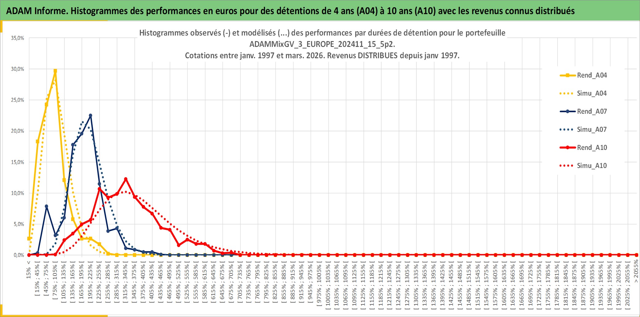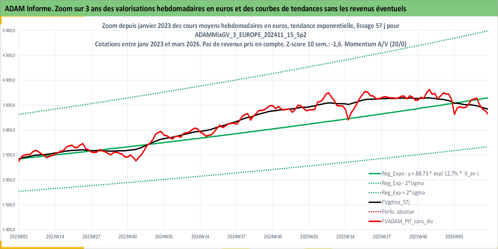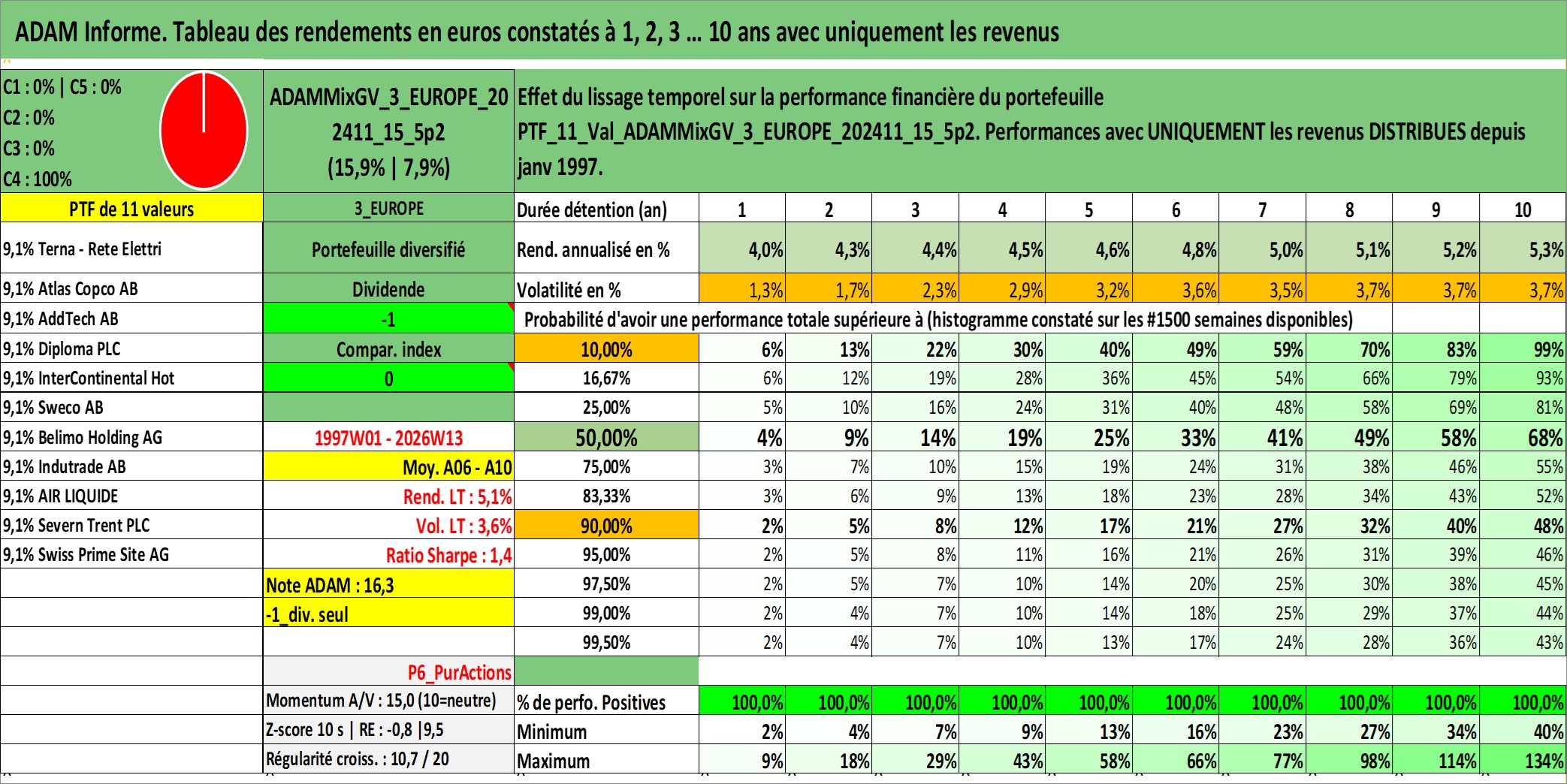 Site dédié aux investisseursPage dédiée sur site financeAnalyse des valorisations hebdomadaires du portefeuille ADAMMixGV_3_EUROPE_202411_15_5p2_11actifs avec un profil P6_PurActions. Ce portefeuille est cote en EUR. Les valorisations couvrent les semaines 1997W01 a 2026W13. Les revenus de cet actif financier sont pris en compte depuis la semaine 1997W01. La note globale ESG de cet actif est estimee a 13.7 (apres rebasage entre 0 et 20).