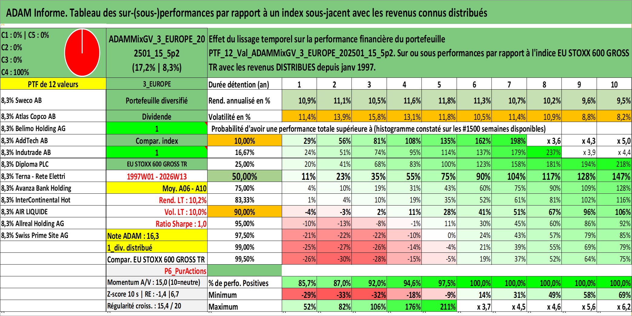 Site dédié aux investisseursPage dédiée sur site financeAnalyse des valorisations hebdomadaires du portefeuille ADAMMixGV_3_EUROPE_202501_15_5p2_12actifs avec un profil P6_PurActions. Ce portefeuille est cote en EUR. Les valorisations couvrent les semaines 1997W01 a 2026W13. Les revenus de cet actif financier sont pris en compte depuis la semaine 1997W01. La note globale ESG de cet actif est estimee a 13.8 (apres rebasage entre 0 et 20).