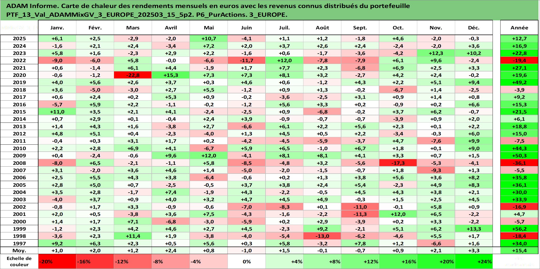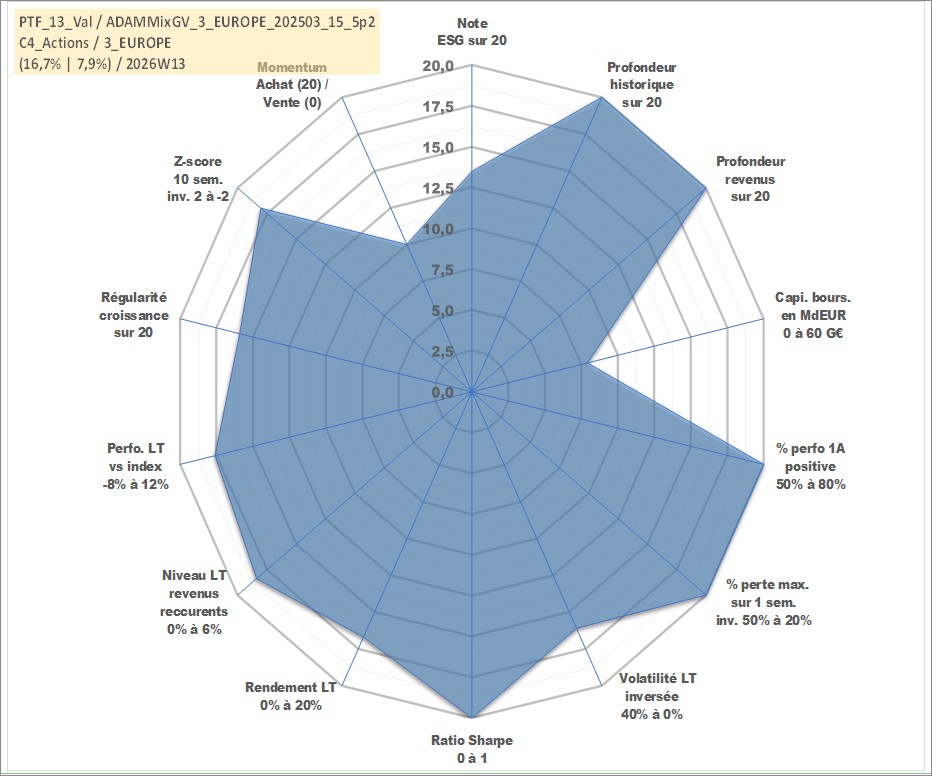 Site dédié aux investisseursPage dédiée sur site financeAnalyse des valorisations hebdomadaires du portefeuille ADAMMixGV_3_EUROPE_202503_15_5p2_13actifs avec un profil P6_PurActions. Ce portefeuille est cote en EUR. Les valorisations couvrent les semaines 1997W01 a 2026W13. Les revenus de cet actif financier sont pris en compte depuis la semaine 1997W01. La note globale ESG de cet actif est estimee a 13.5 (apres rebasage entre 0 et 20).