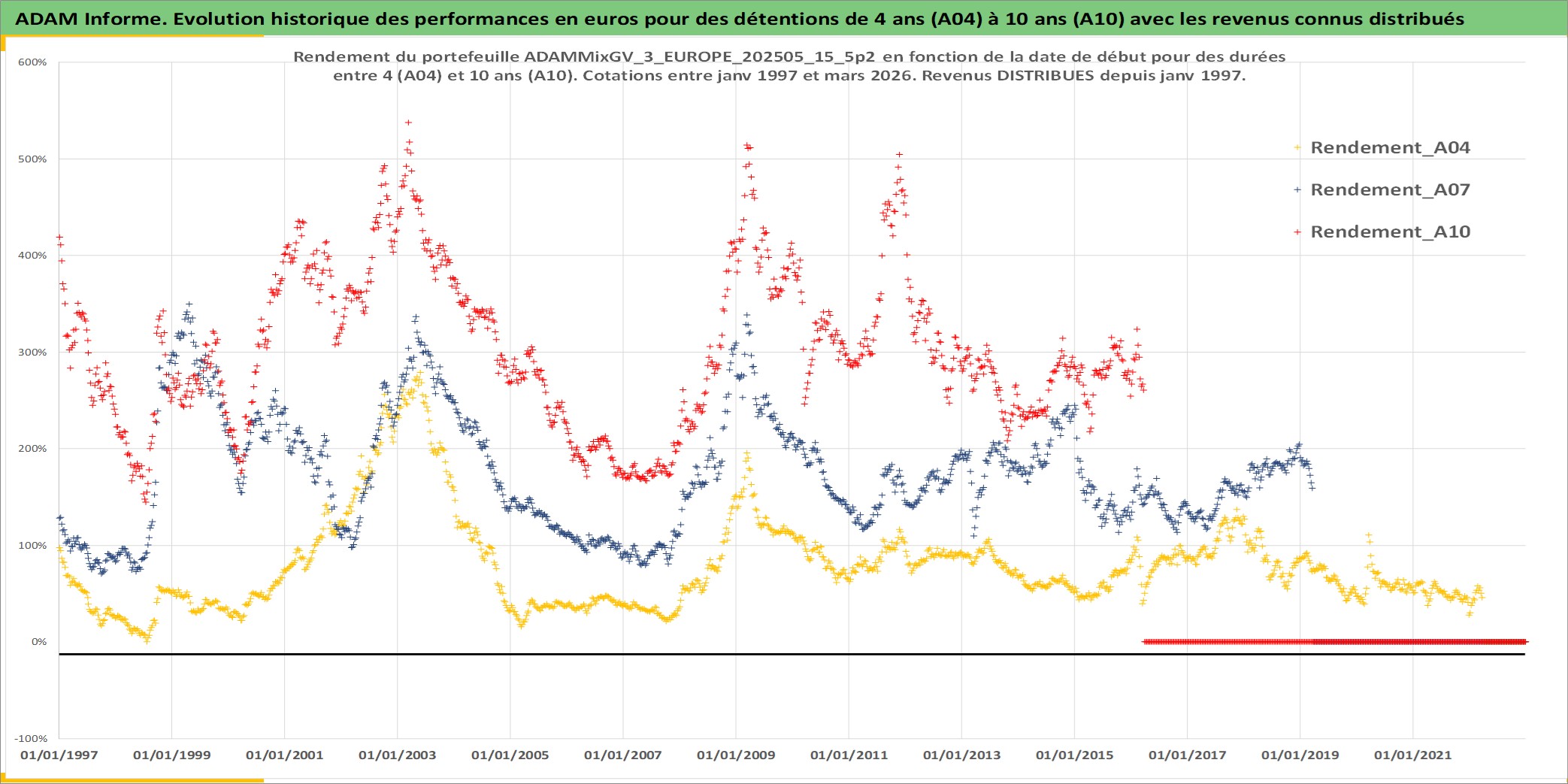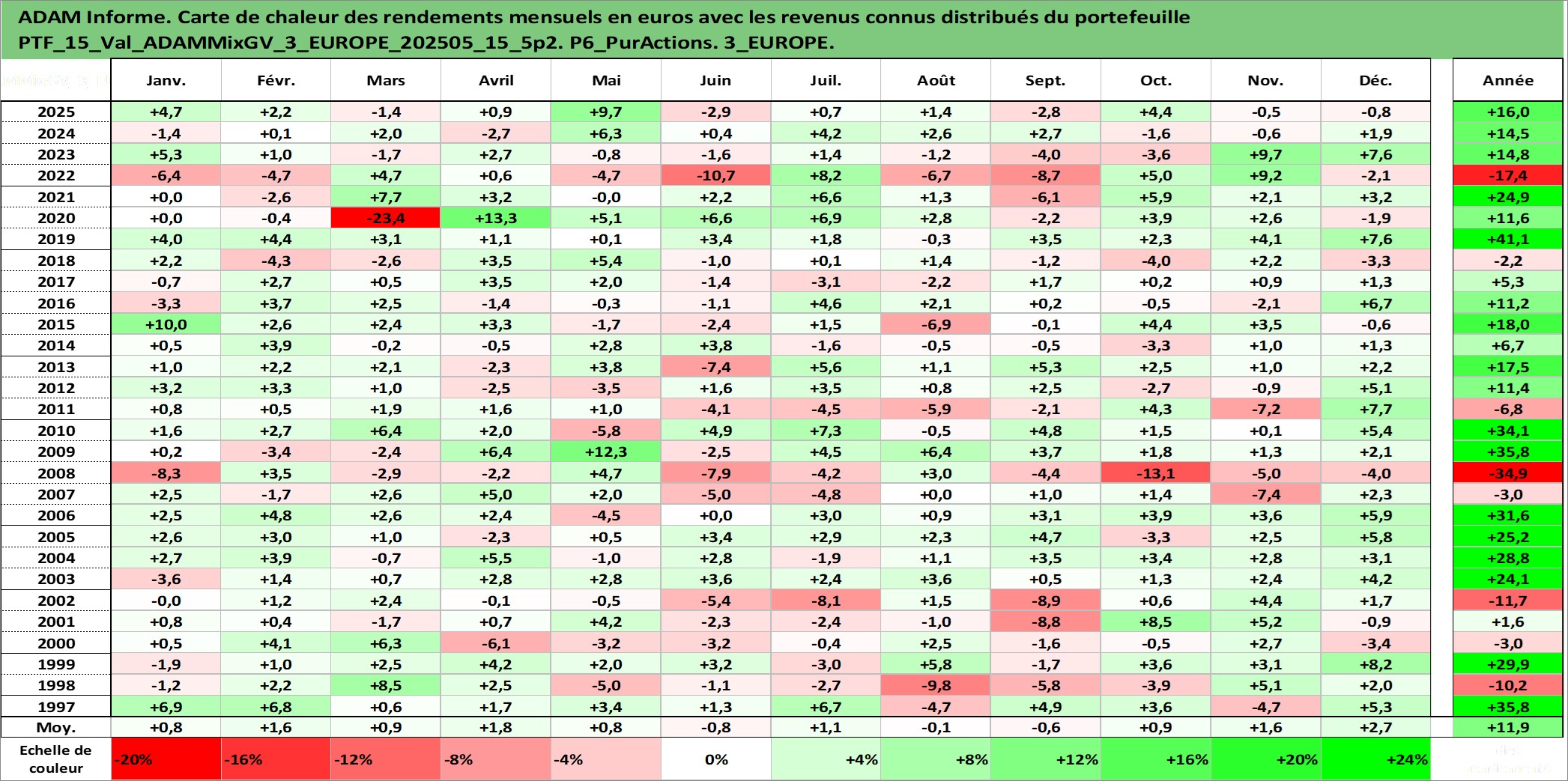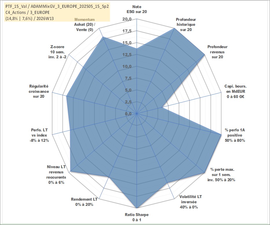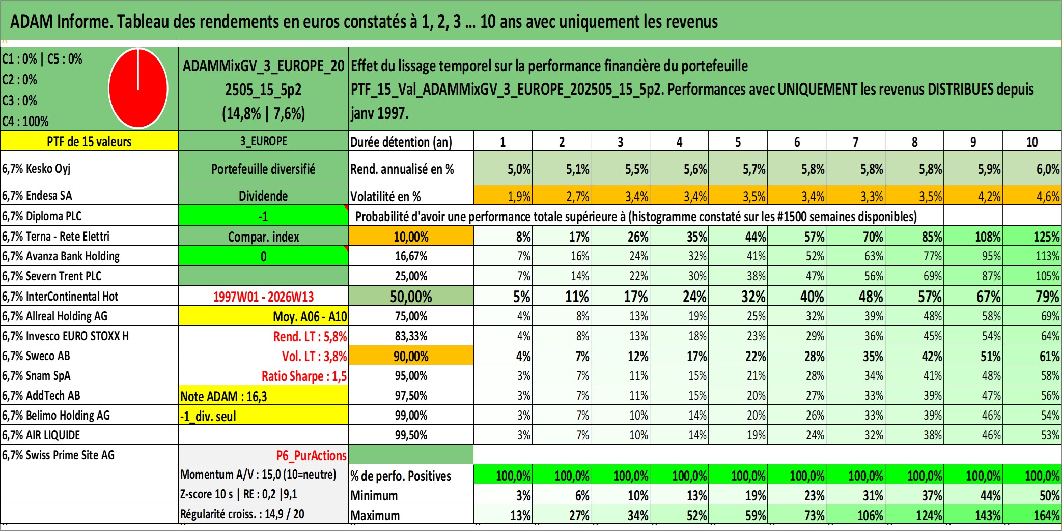 Site dédié aux investisseursPage dédiée sur site financeAnalyse des valorisations hebdomadaires du portefeuille ADAMMixGV_3_EUROPE_202505_15_5p2_15actifs avec un profil P6_PurActions. Ce portefeuille est cote en EUR. Les valorisations couvrent les semaines 1997W01 a 2026W13. Les revenus de cet actif financier sont pris en compte depuis la semaine 1997W01. La note globale ESG de cet actif est estimee a 13.7 (apres rebasage entre 0 et 20).