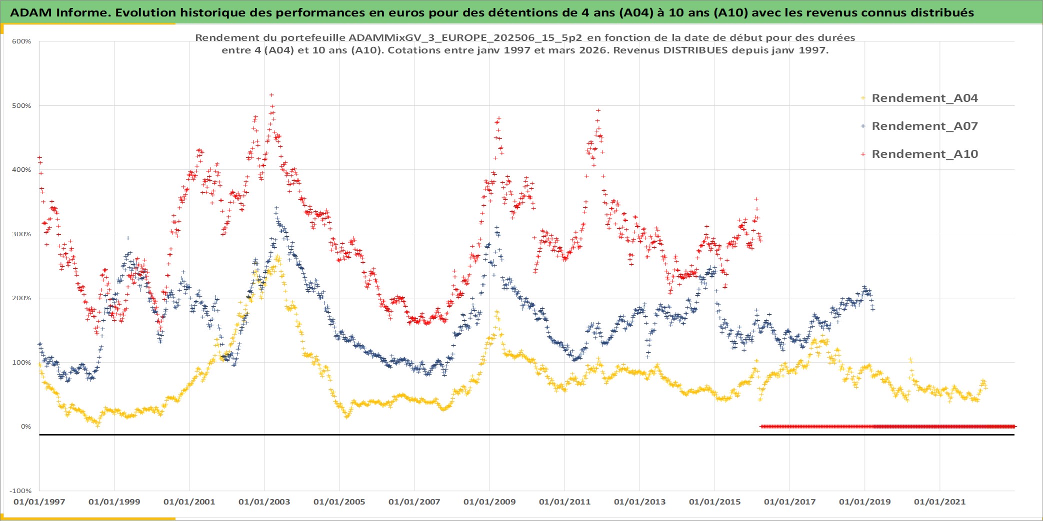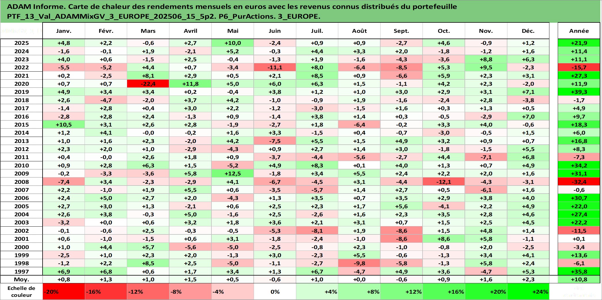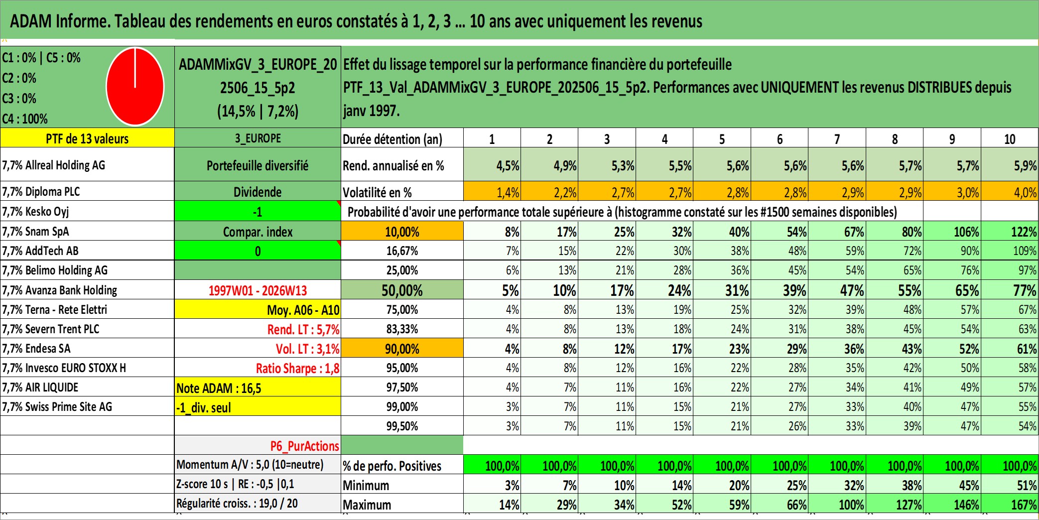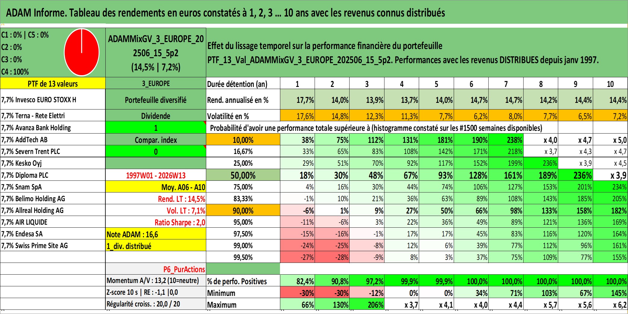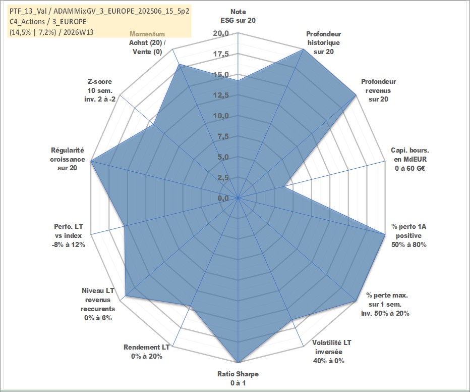 Site dédié aux investisseursPage dédiée sur site financeAnalyse des valorisations hebdomadaires du portefeuille ADAMMixGV_3_EUROPE_202506_15_5p2_13actifs avec un profil P6_PurActions. Ce portefeuille est cote en EUR. Les valorisations couvrent les semaines 1997W01 a 2026W13. Les revenus de cet actif financier sont pris en compte depuis la semaine 1997W01. La note globale ESG de cet actif est estimee a 14.2 (apres rebasage entre 0 et 20).