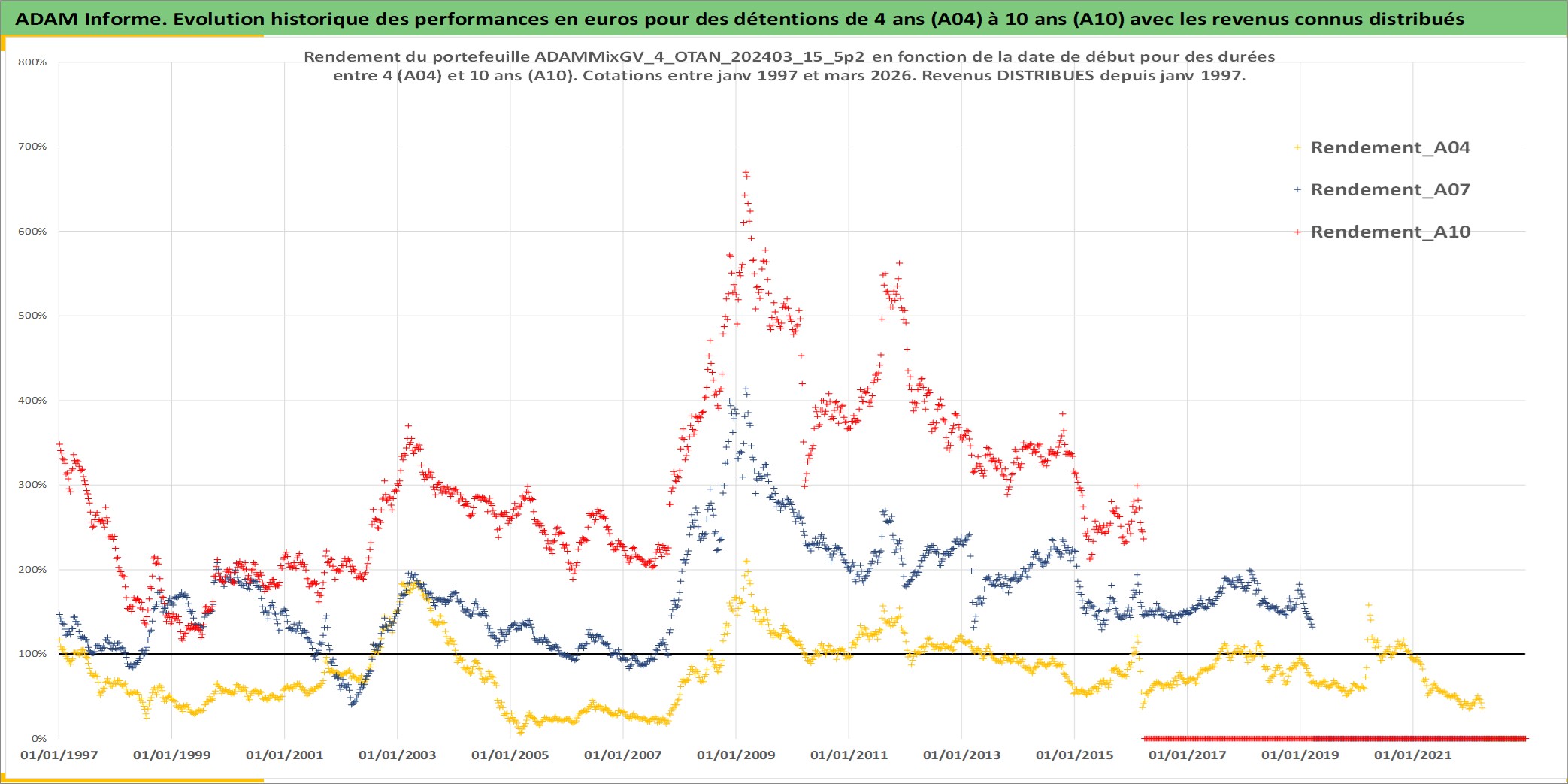 Site dédié aux investisseursPage dédiée sur site financeAnalyse des valorisations hebdomadaires du portefeuille ADAMMixGV_4_OTAN_202403_15_5p2_60actifs avec un profil P6_PurActions. Ce portefeuille est cote en EUR. Les valorisations couvrent les semaines 1997W01 a 2026W13. Les revenus de cet actif financier sont pris en compte depuis la semaine 1997W01. La note globale ESG de cet actif est estimee a 10.2 (apres rebasage entre 0 et 20).
