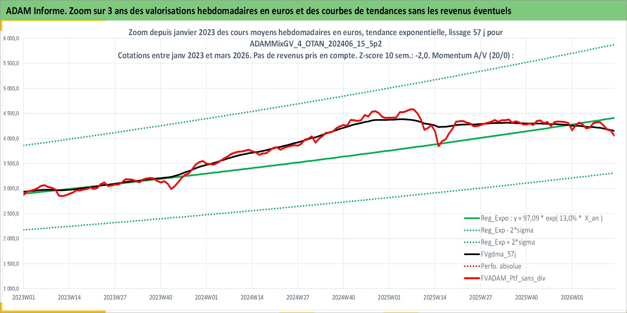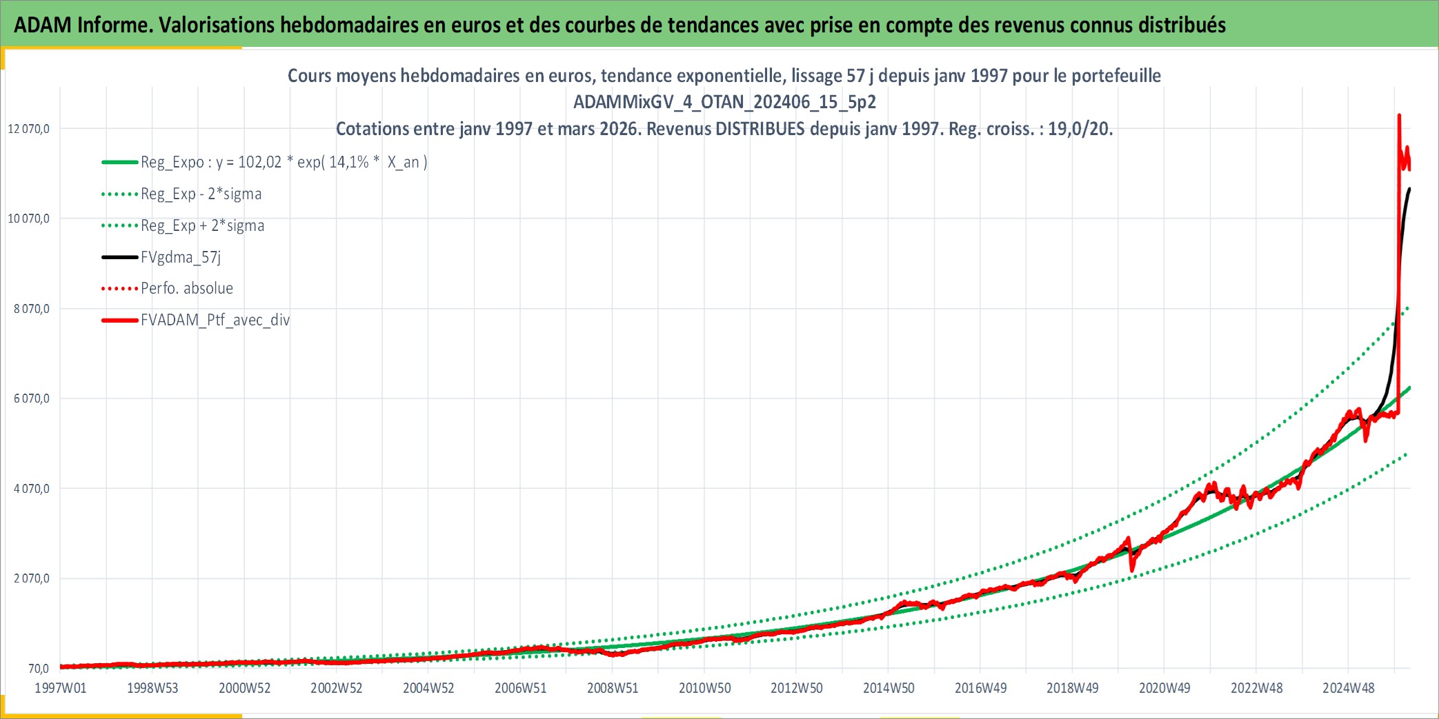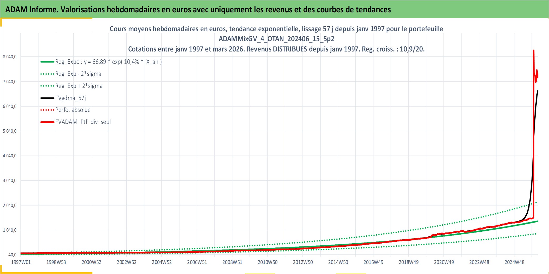 Site dédié aux investisseursPage dédiée sur site financeAnalyse des valorisations hebdomadaires du portefeuille ADAMMixGV_4_OTAN_202406_15_5p2_27actifs avec un profil P6_PurActions. Ce portefeuille est cote en EUR. Les valorisations couvrent les semaines 1997W01 a 2026W13. Les revenus de cet actif financier sont pris en compte depuis la semaine 1997W01. La note globale ESG de cet actif est estimee a 11.3 (apres rebasage entre 0 et 20).