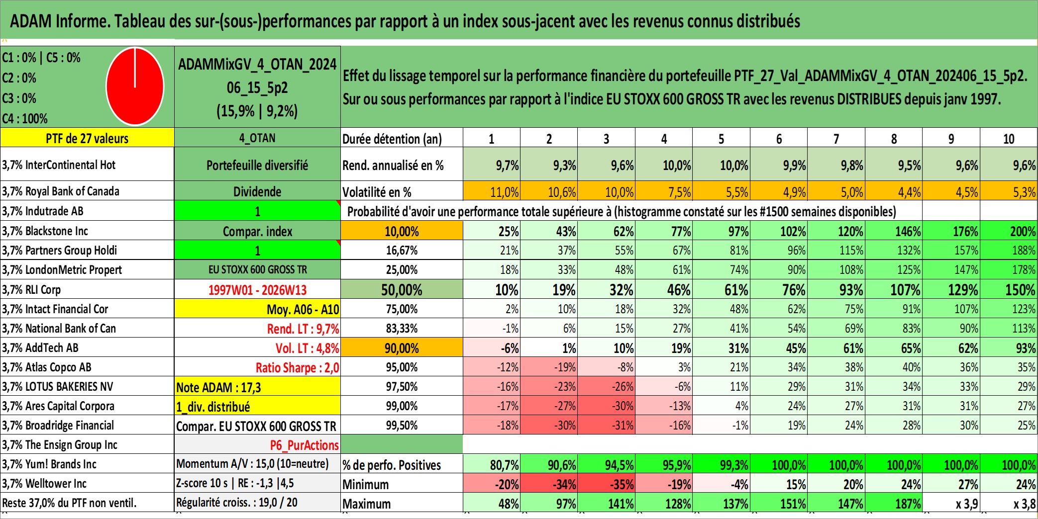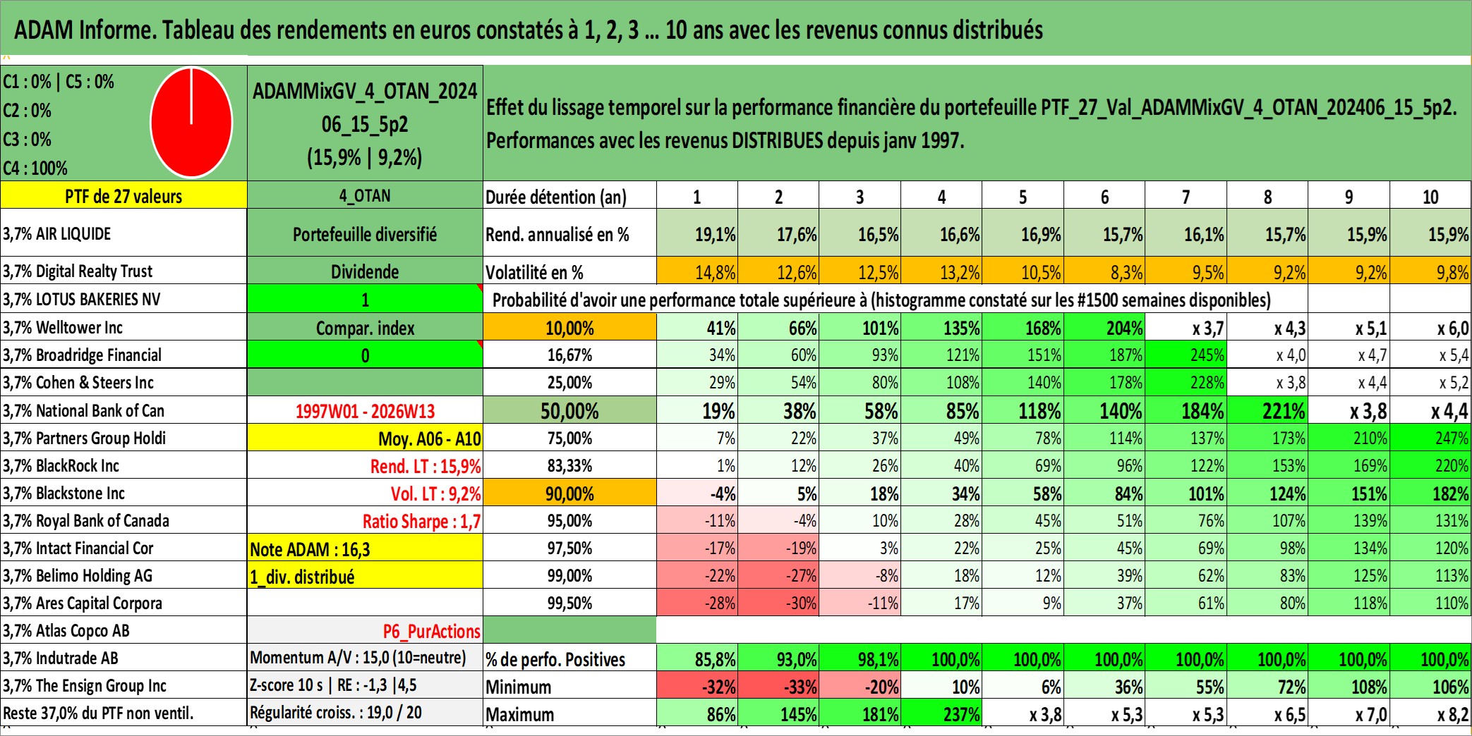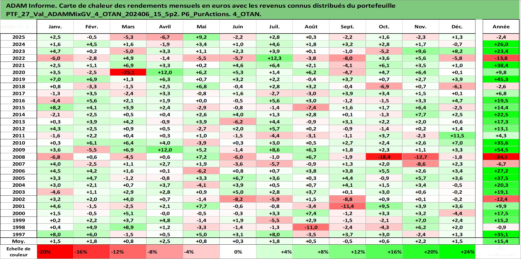 Site dédié aux investisseursPage dédiée sur site financeAnalyse des valorisations hebdomadaires du portefeuille ADAMMixGV_4_OTAN_202406_15_5p2_27actifs avec un profil P6_PurActions. Ce portefeuille est cote en EUR. Les valorisations couvrent les semaines 1997W01 a 2026W13. Les revenus de cet actif financier sont pris en compte depuis la semaine 1997W01. La note globale ESG de cet actif est estimee a 11.3 (apres rebasage entre 0 et 20).