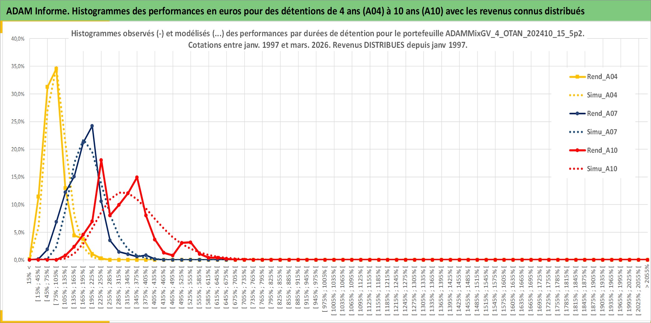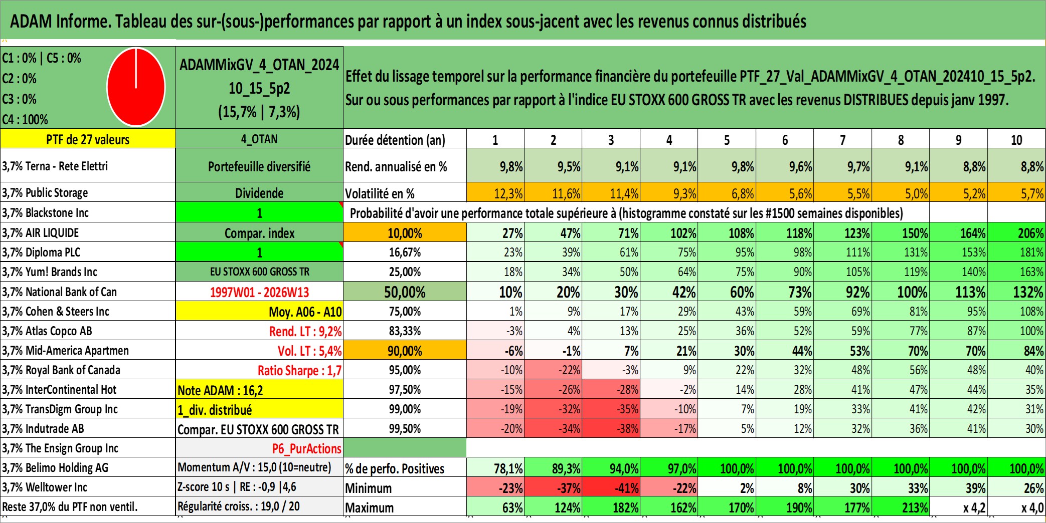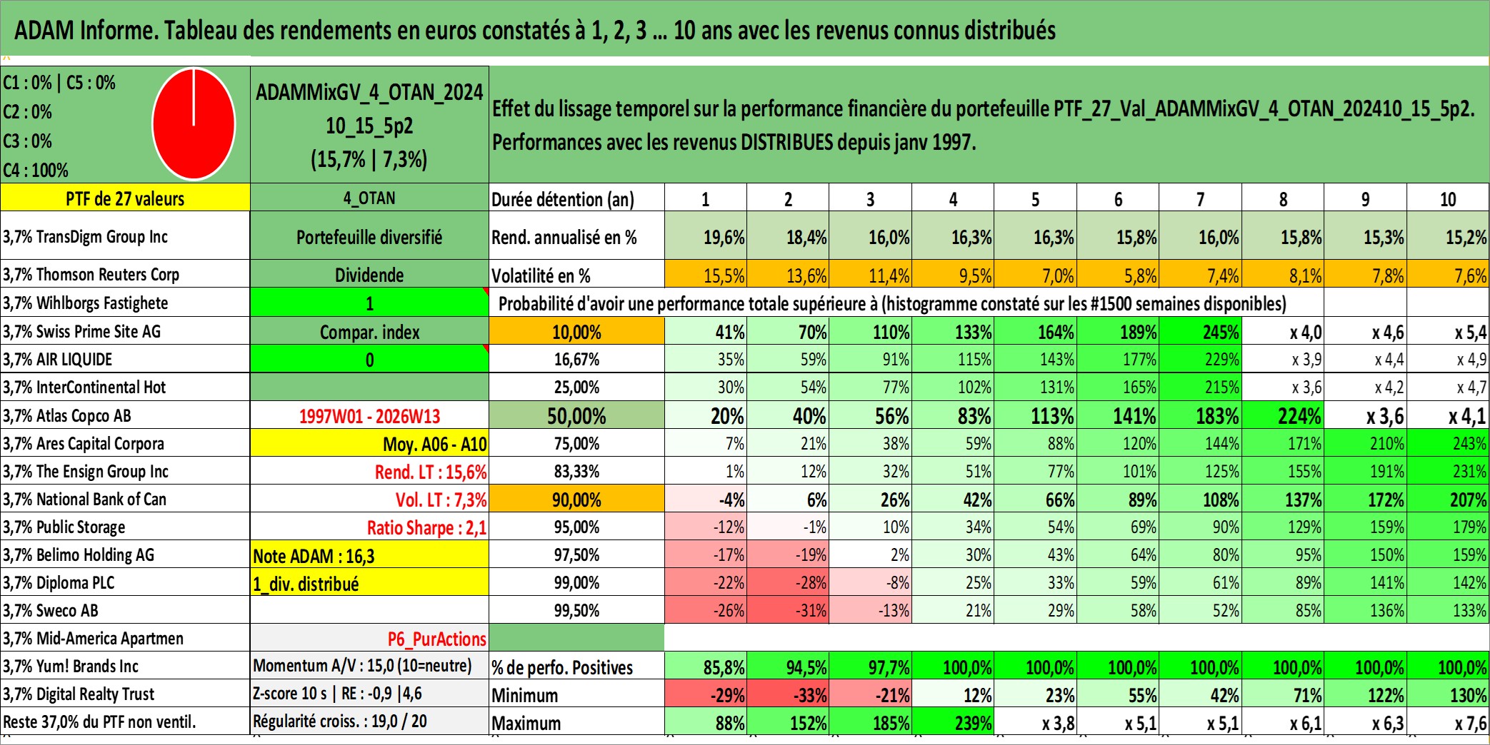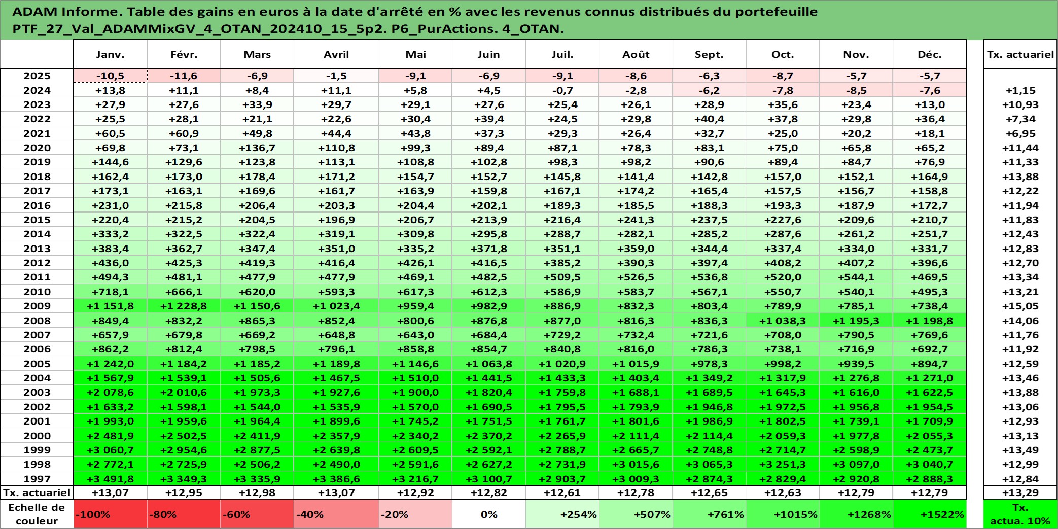 Site dédié aux investisseursPage dédiée sur site financeAnalyse des valorisations hebdomadaires du portefeuille ADAMMixGV_4_OTAN_202410_15_5p2_27actifs avec un profil P6_PurActions. Ce portefeuille est cote en EUR. Les valorisations couvrent les semaines 1997W01 a 2026W13. Les revenus de cet actif financier sont pris en compte depuis la semaine 1997W01. La note globale ESG de cet actif est estimee a 11.8 (apres rebasage entre 0 et 20).