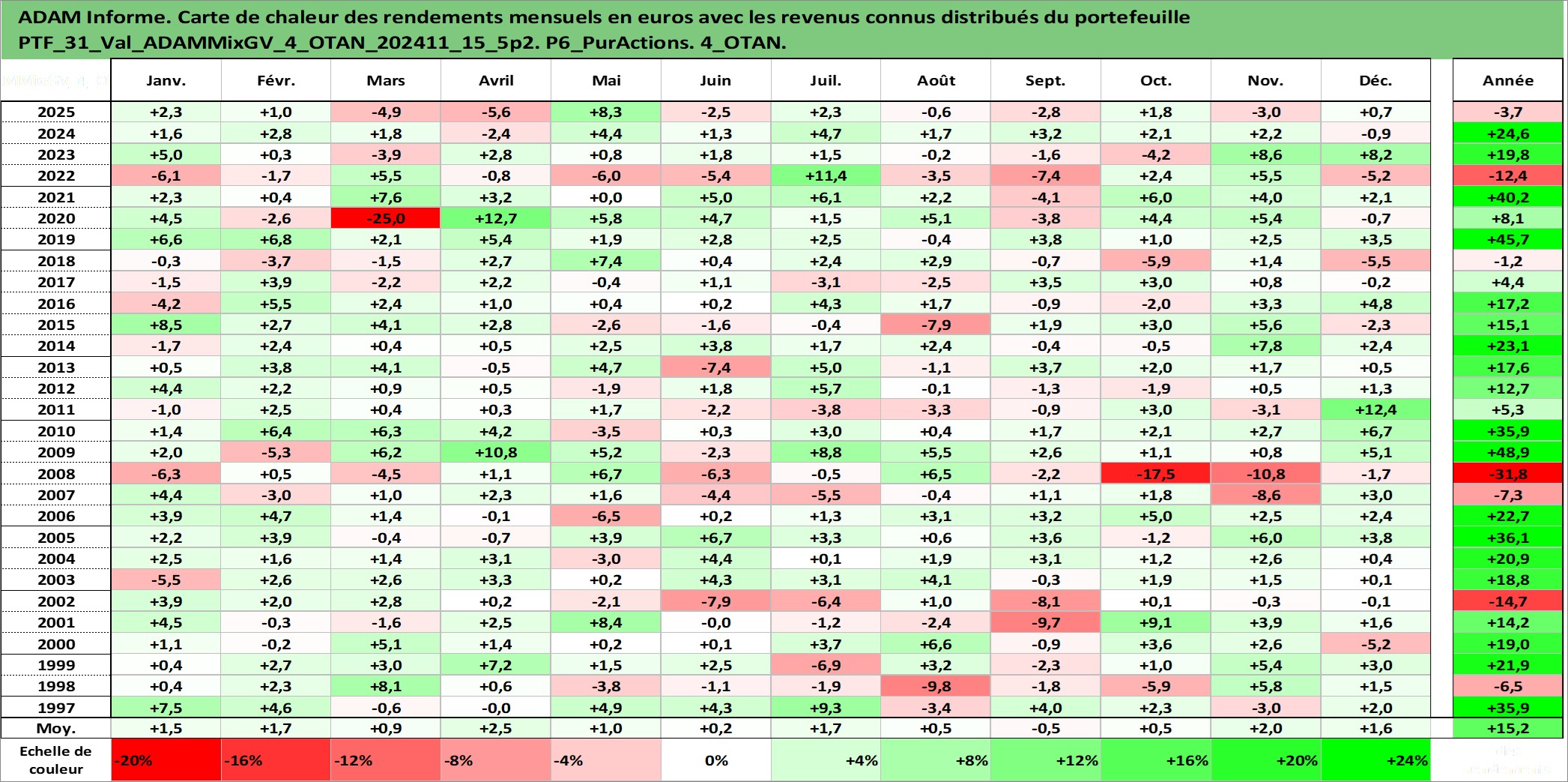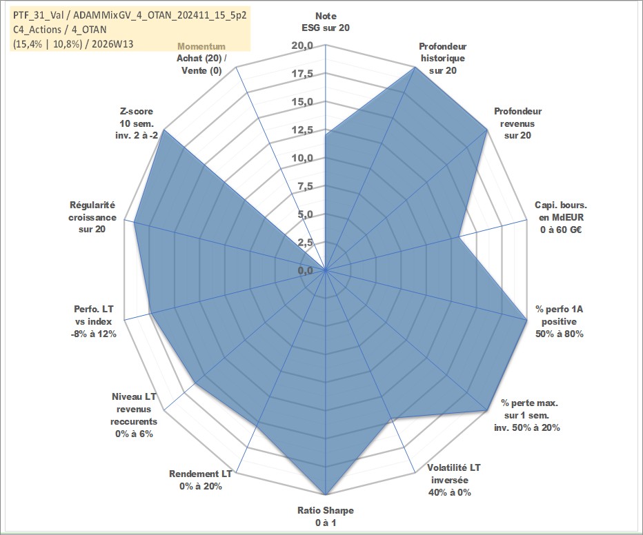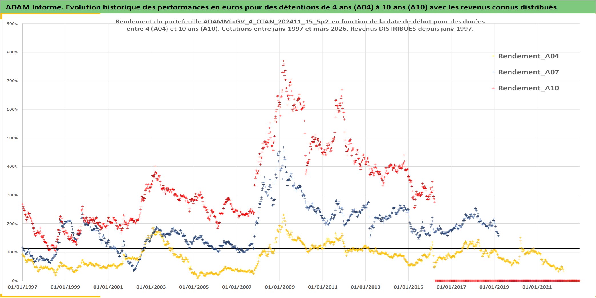 Site dédié aux investisseursPage dédiée sur site financeAnalyse des valorisations hebdomadaires du portefeuille ADAMMixGV_4_OTAN_202411_15_5p2_31actifs avec un profil P6_PurActions. Ce portefeuille est cote en EUR. Les valorisations couvrent les semaines 1997W01 a 2026W13. Les revenus de cet actif financier sont pris en compte depuis la semaine 1997W01. La note globale ESG de cet actif est estimee a 12.0 (apres rebasage entre 0 et 20).