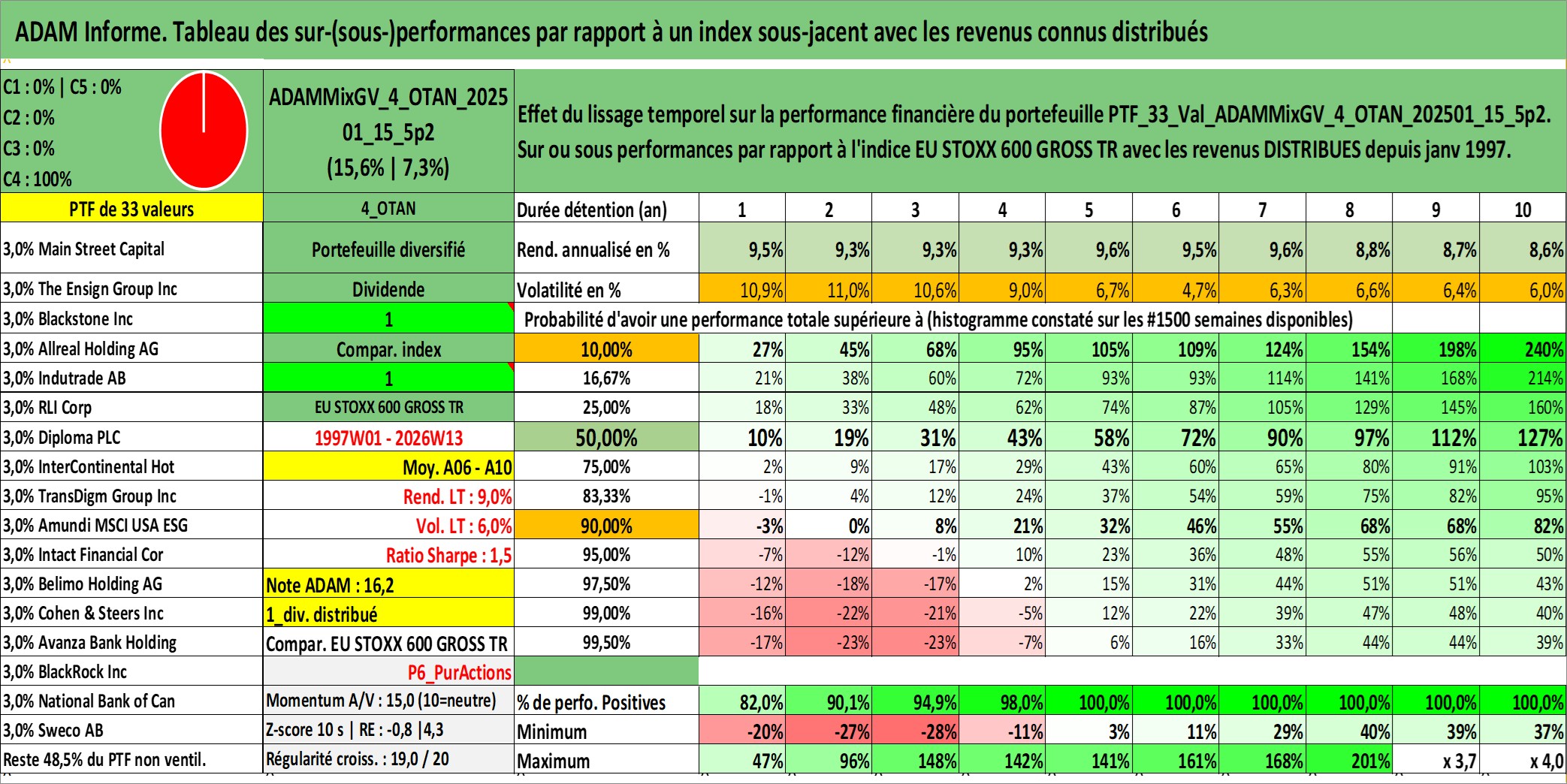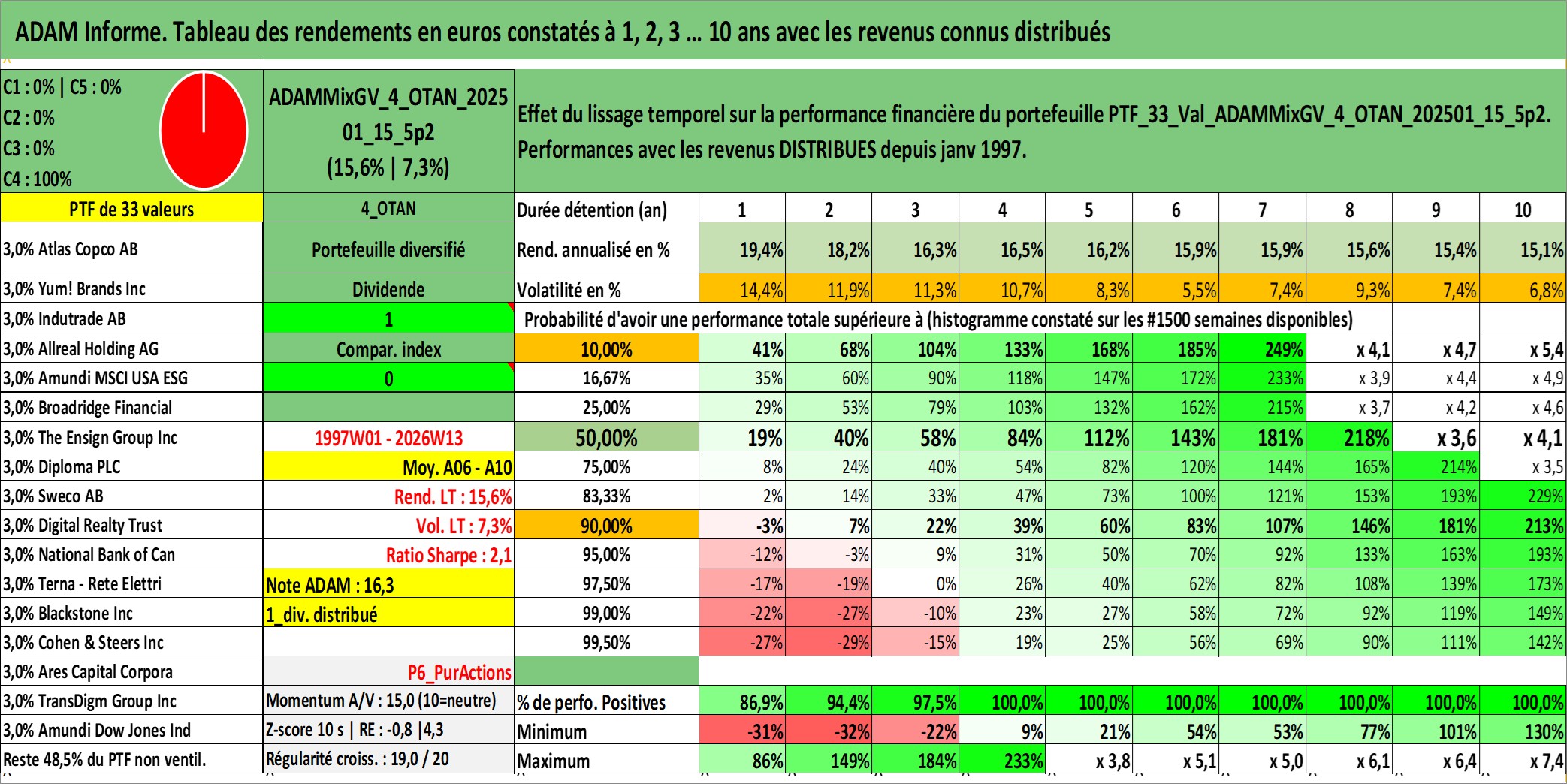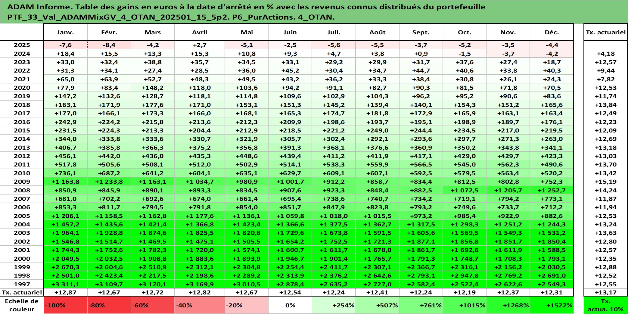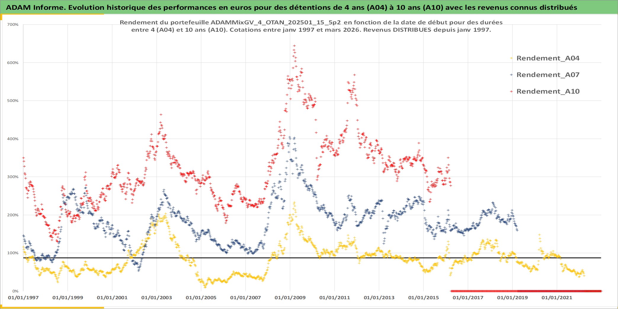 Site dédié aux investisseursPage dédiée sur site financeAnalyse des valorisations hebdomadaires du portefeuille ADAMMixGV_4_OTAN_202501_15_5p2_33actifs avec un profil P6_PurActions. Ce portefeuille est cote en EUR. Les valorisations couvrent les semaines 1997W01 a 2026W13. Les revenus de cet actif financier sont pris en compte depuis la semaine 1997W01. La note globale ESG de cet actif est estimee a 11.4 (apres rebasage entre 0 et 20).