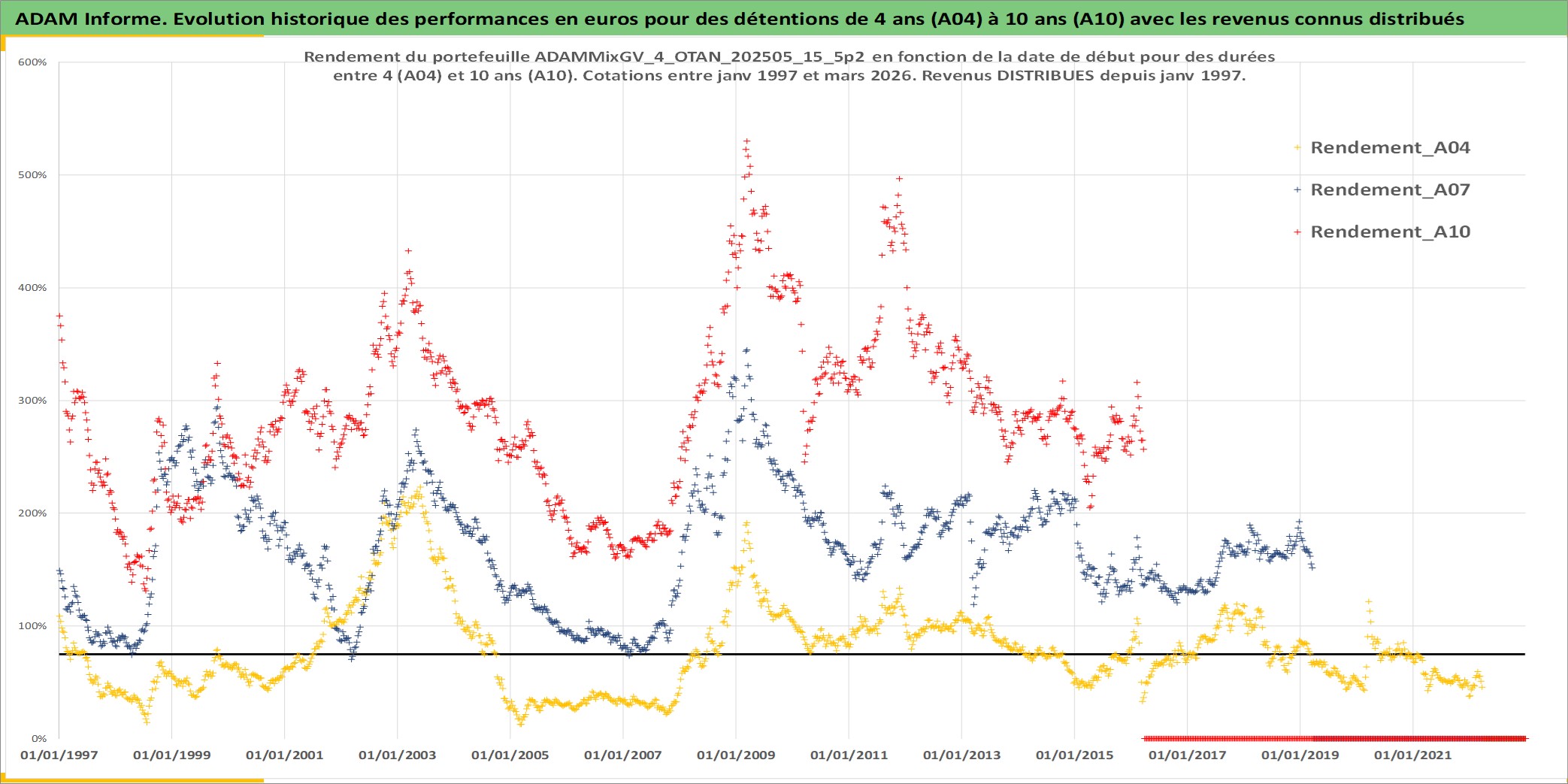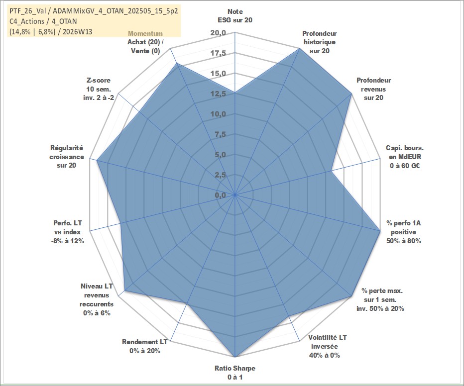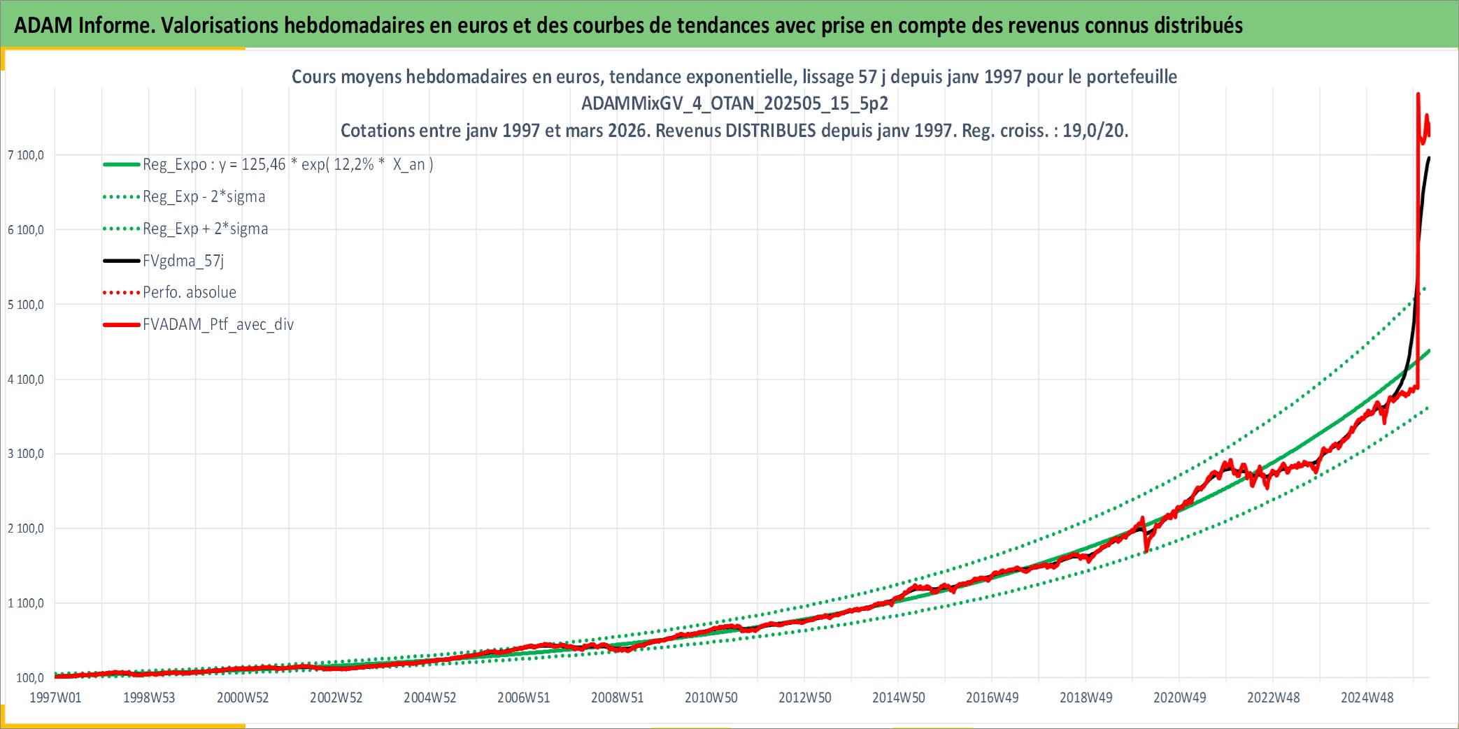 Site dédié aux investisseursPage dédiée sur site financeAnalyse des valorisations hebdomadaires du portefeuille ADAMMixGV_4_OTAN_202505_15_5p2_26actifs avec un profil P6_PurActions. Ce portefeuille est cote en EUR. Les valorisations couvrent les semaines 1997W01 a 2026W13. Les revenus de cet actif financier sont pris en compte depuis la semaine 1997W01. La note globale ESG de cet actif est estimee a 12.6 (apres rebasage entre 0 et 20).