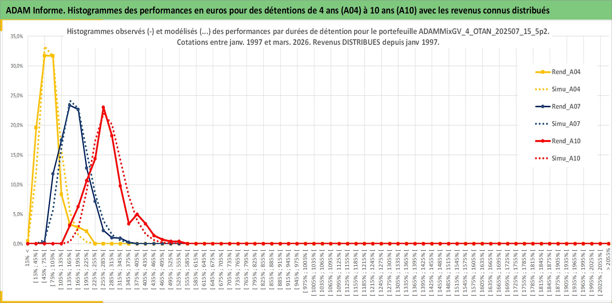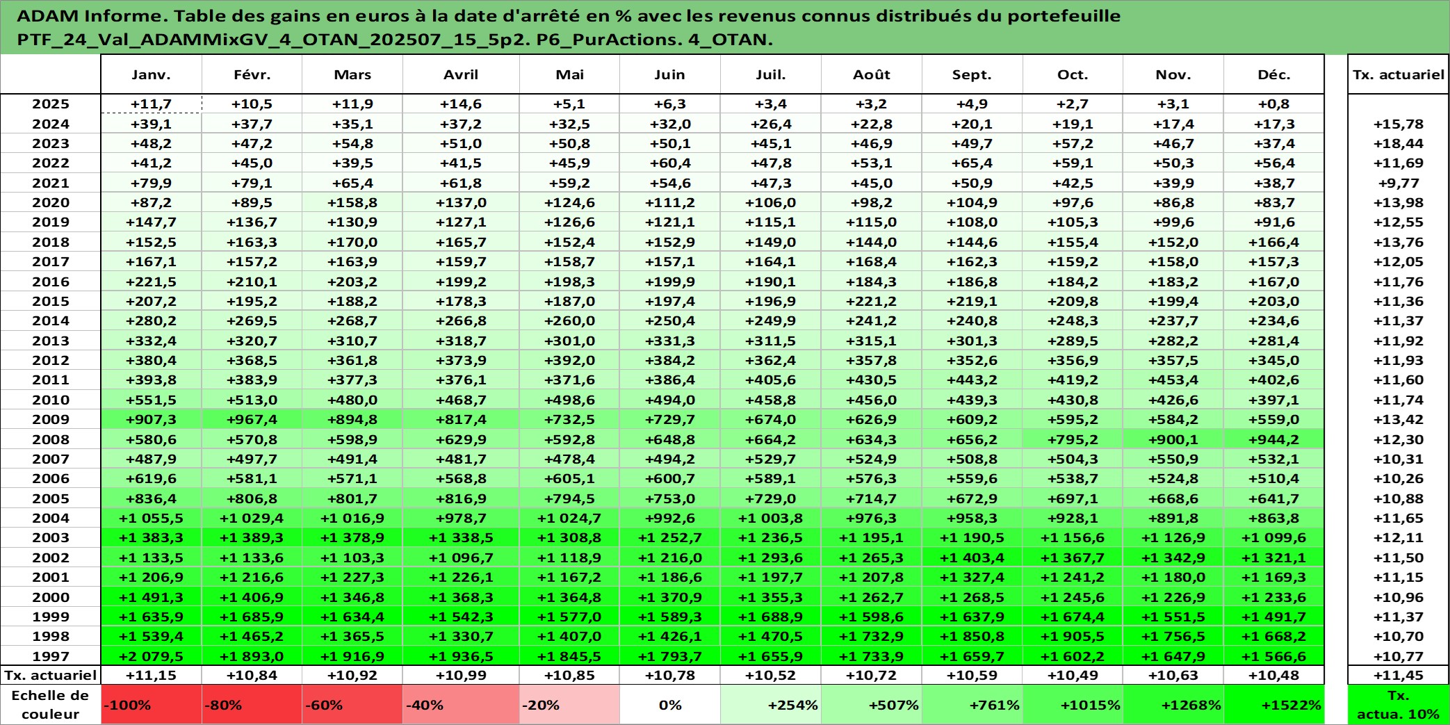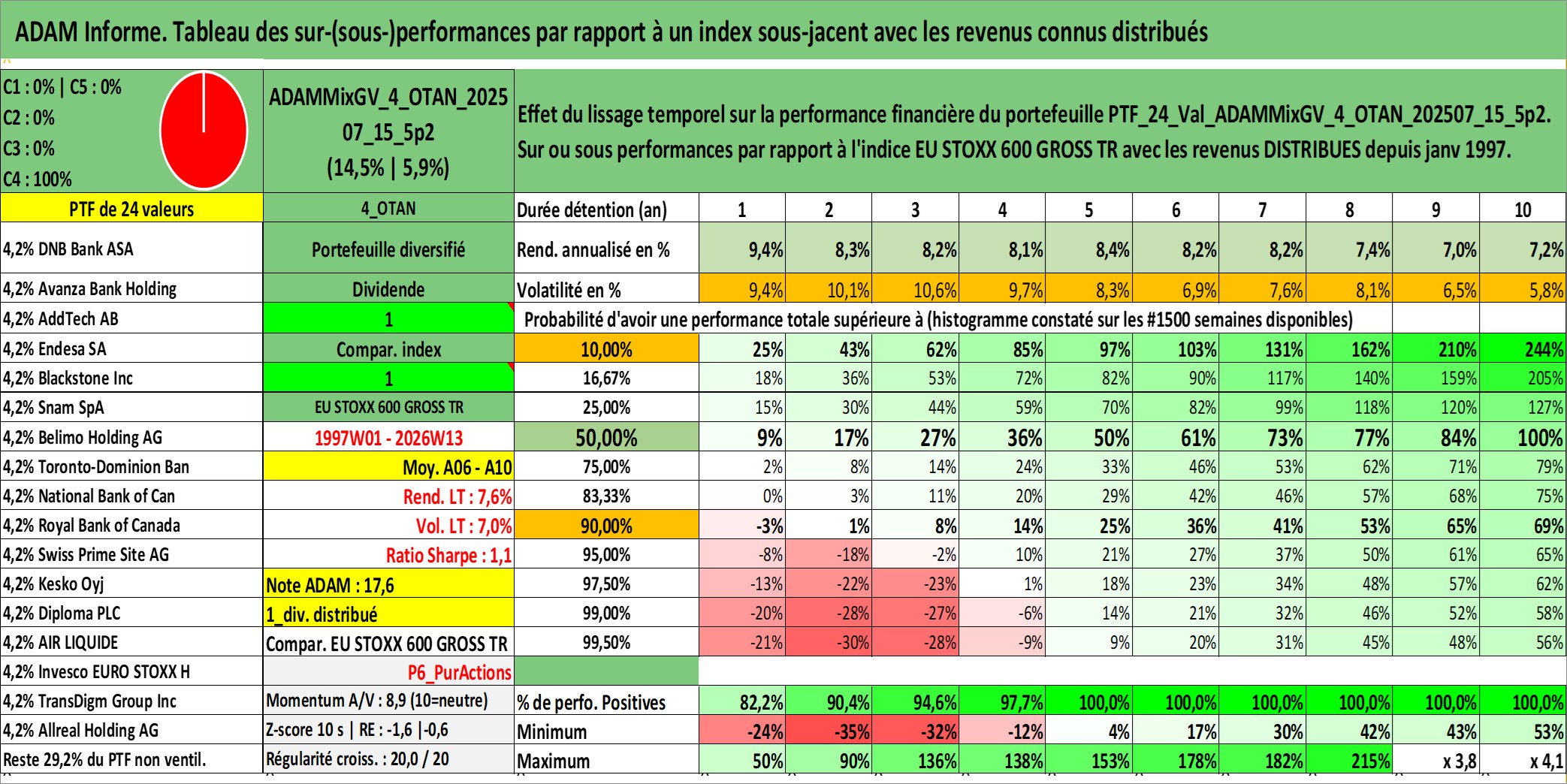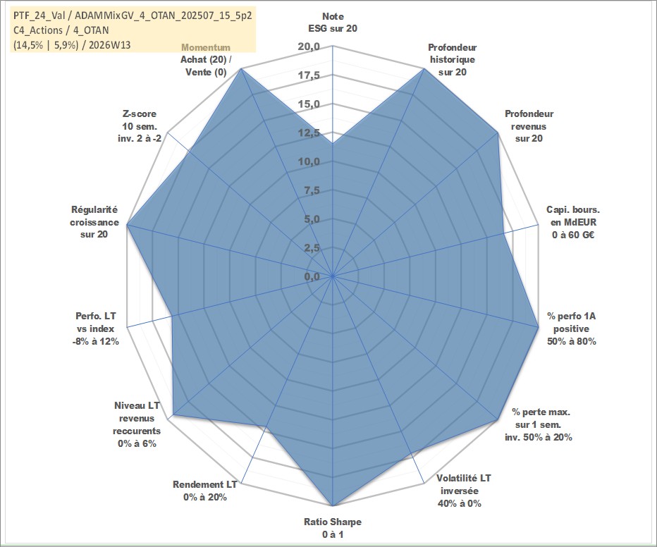 Site dédié aux investisseursPage dédiée sur site financeAnalyse des valorisations hebdomadaires du portefeuille ADAMMixGV_4_OTAN_202507_15_5p2_24actifs avec un profil P6_PurActions. Ce portefeuille est cote en EUR. Les valorisations couvrent les semaines 1997W01 a 2026W13. Les revenus de cet actif financier sont pris en compte depuis la semaine 1997W01. La note globale ESG de cet actif est estimee a 11.5 (apres rebasage entre 0 et 20).