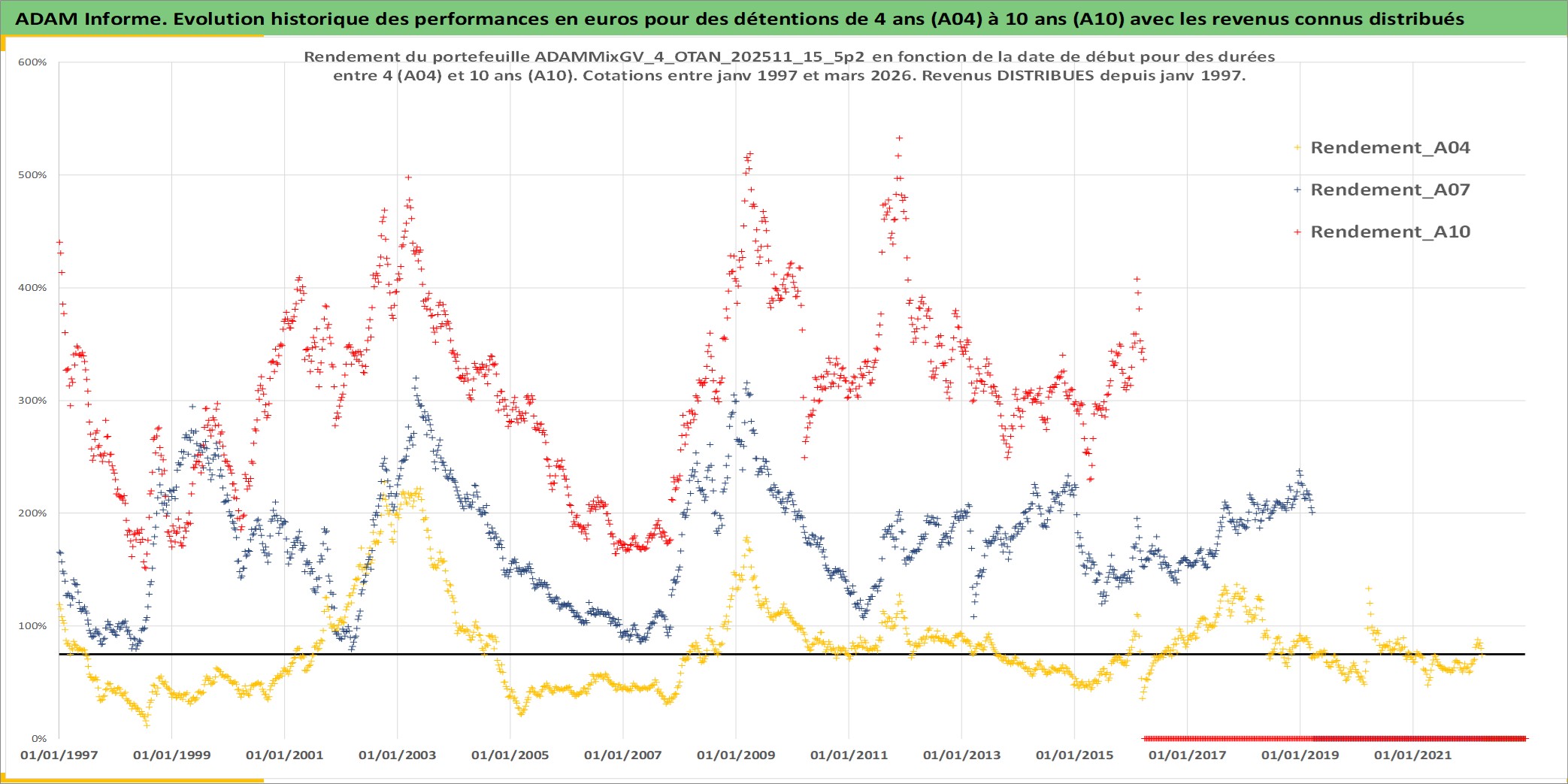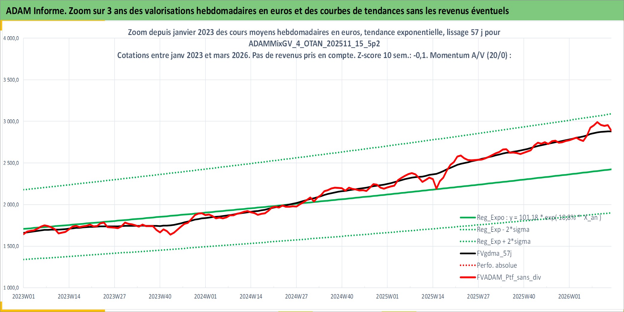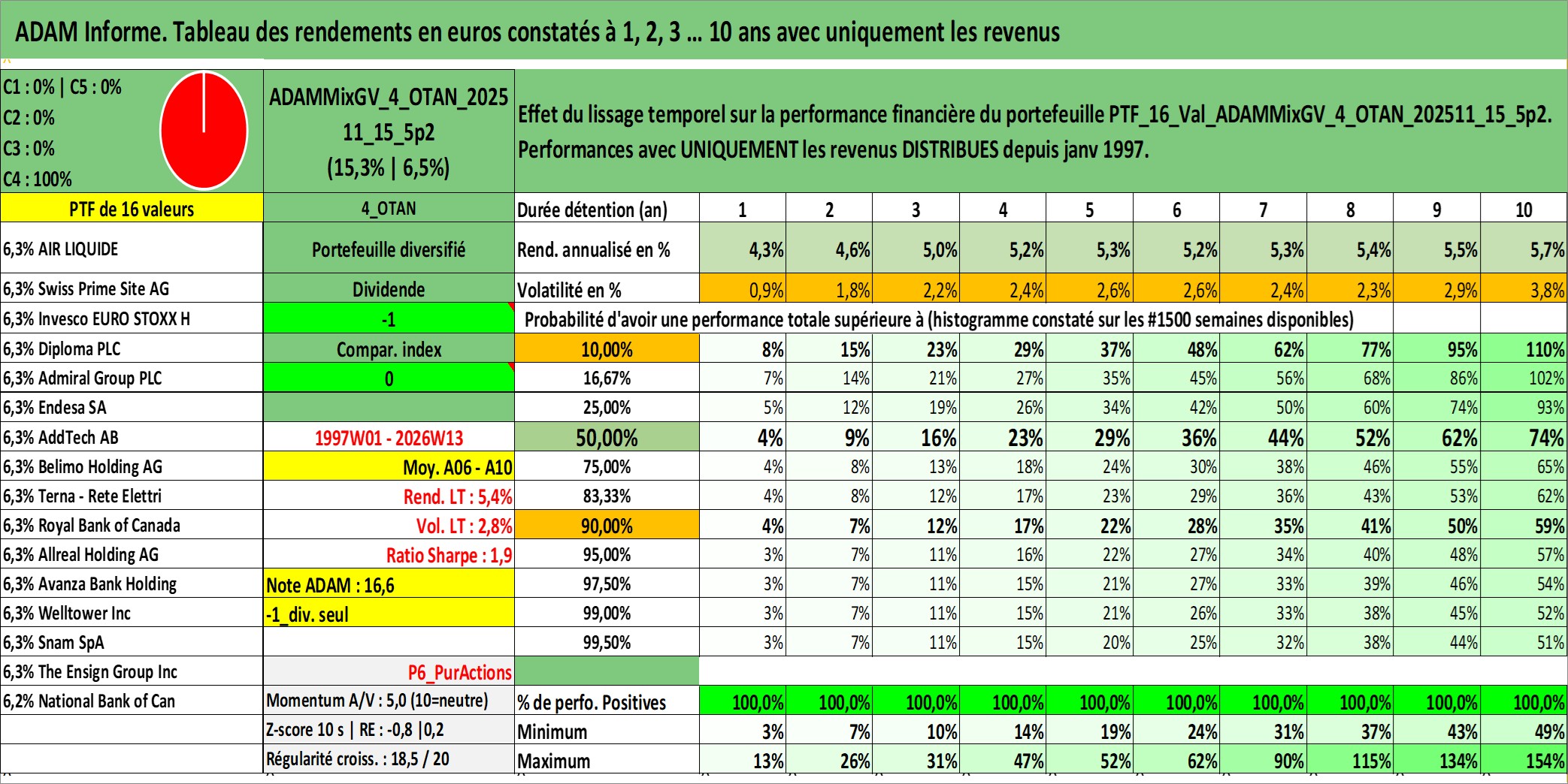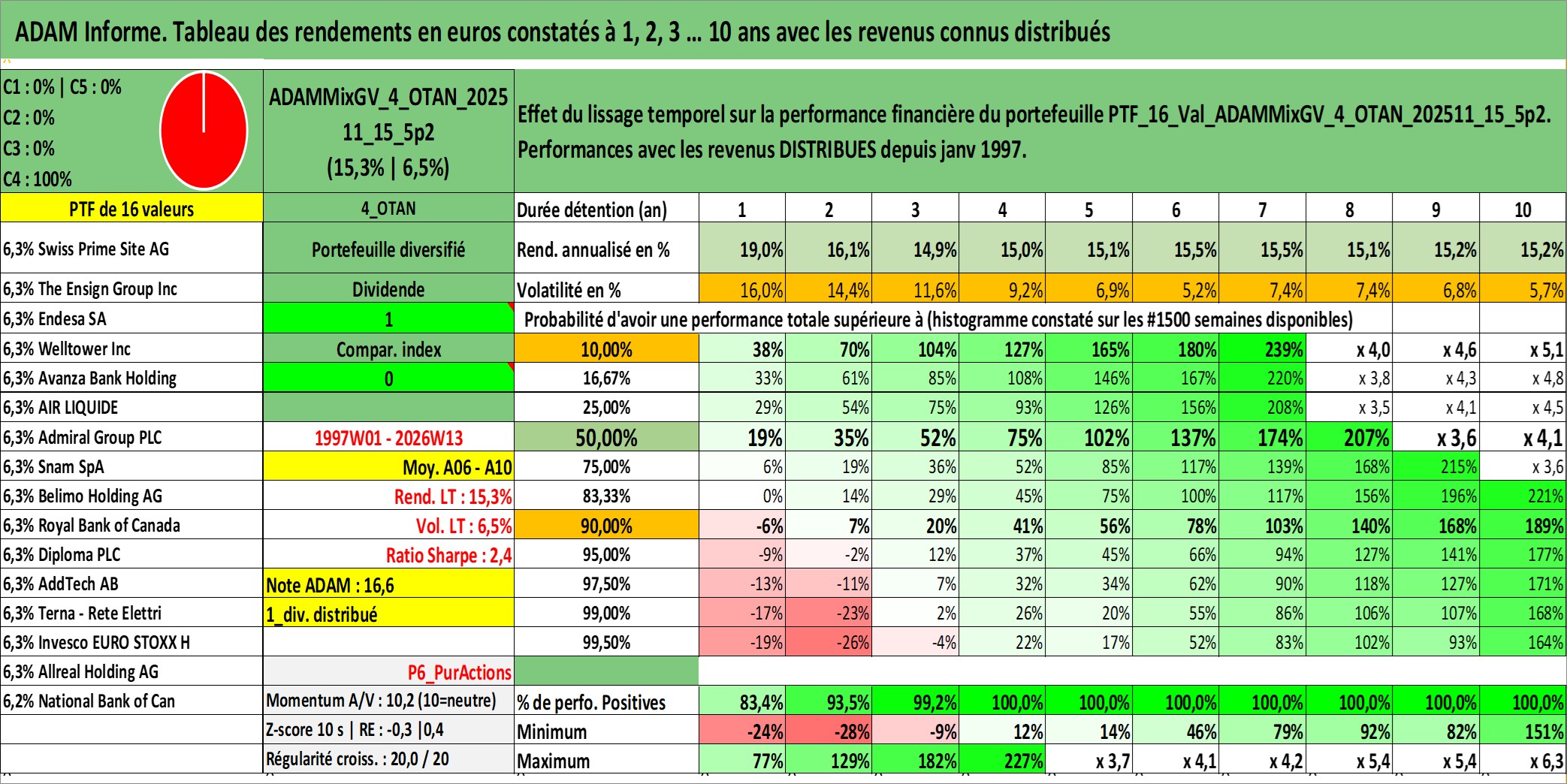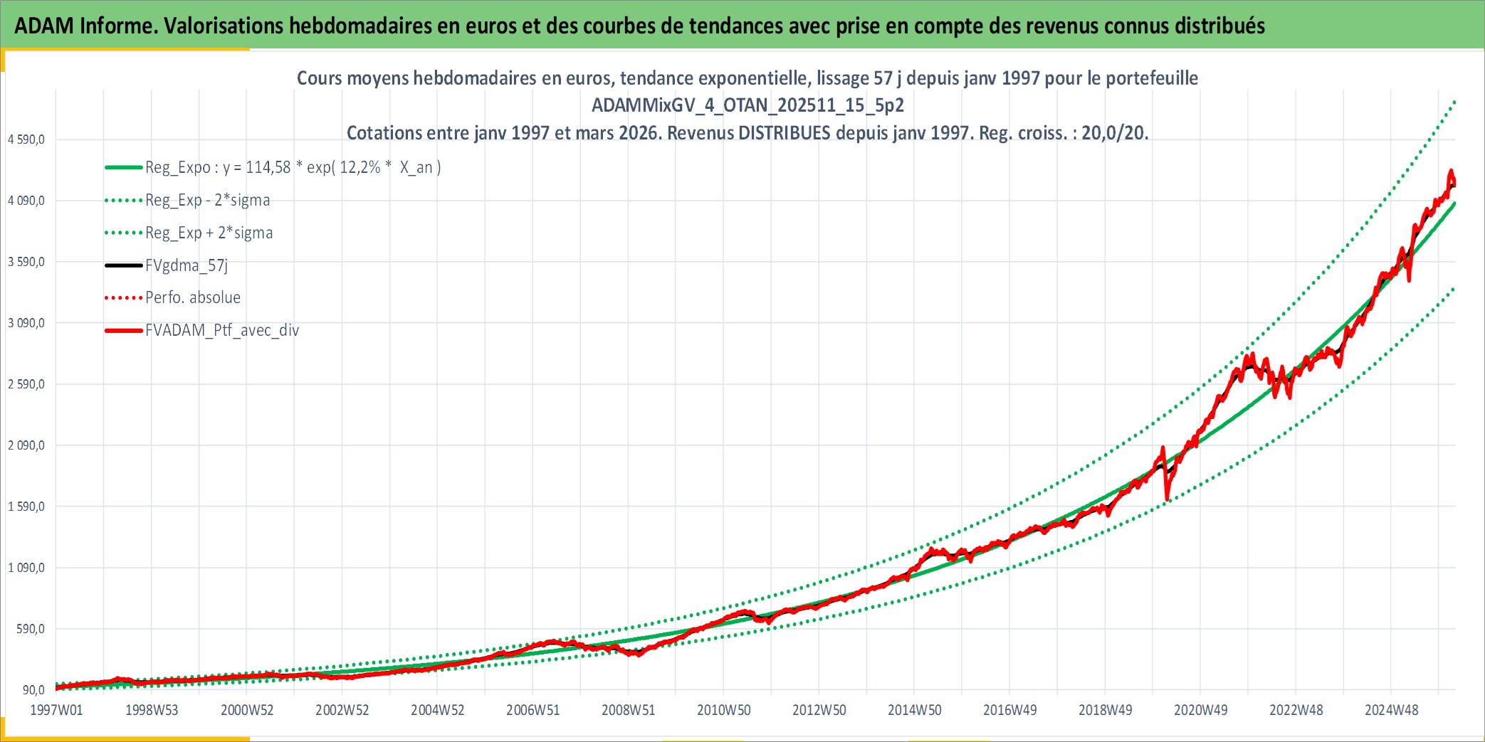 Site dédié aux investisseursPage dédiée sur site financeAnalyse des valorisations hebdomadaires du portefeuille ADAMMixGV_4_OTAN_202511_15_5p2_16actifs avec un profil P6_PurActions. Ce portefeuille est cote en EUR. Les valorisations couvrent les semaines 1997W01 a 2026W13. Les revenus de cet actif financier sont pris en compte depuis la semaine 1997W01. La note globale ESG de cet actif est estimee a 13.3 (apres rebasage entre 0 et 20).